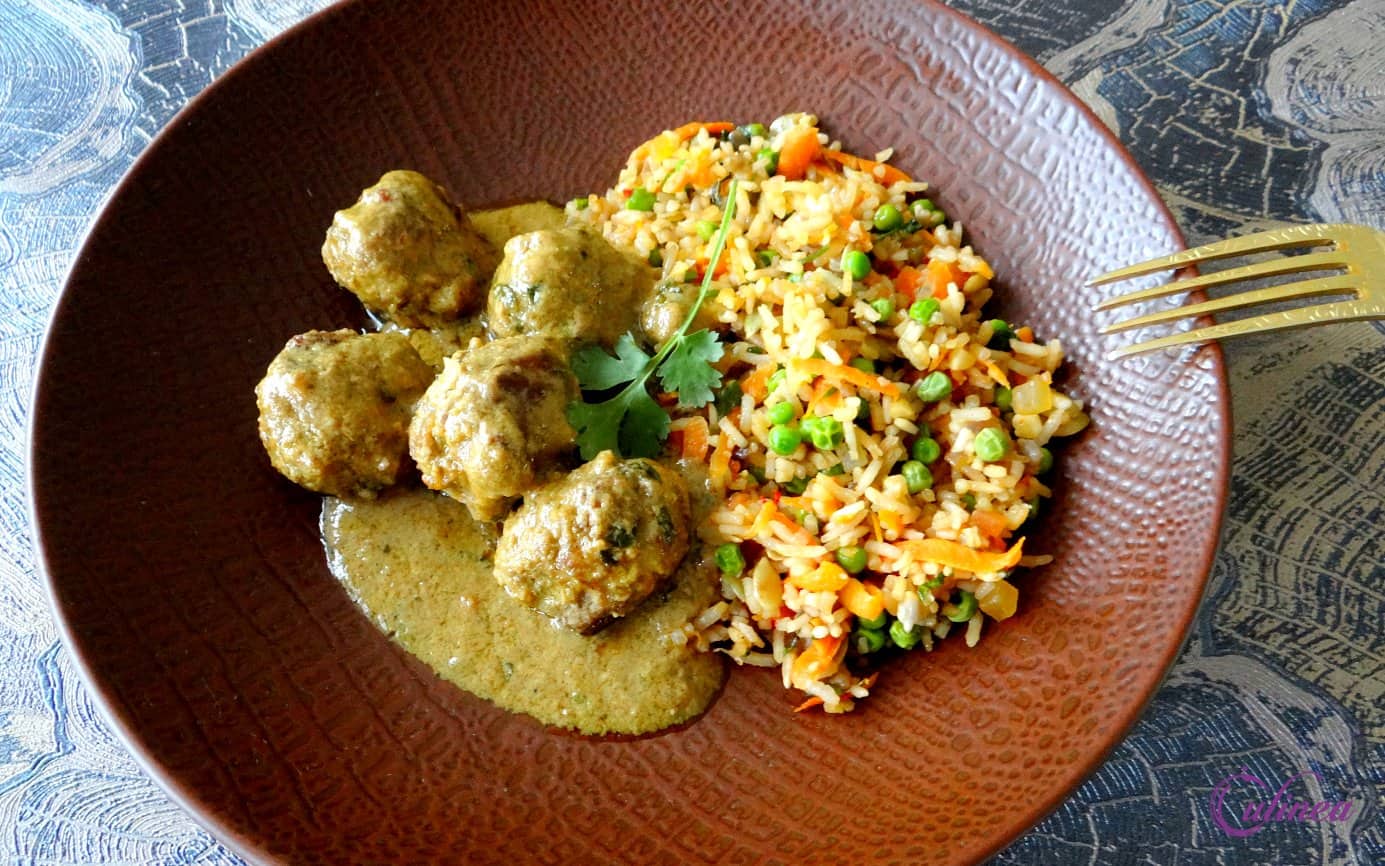 Gehaktballetjes in Maleisische Currysaus met Pilafrijst