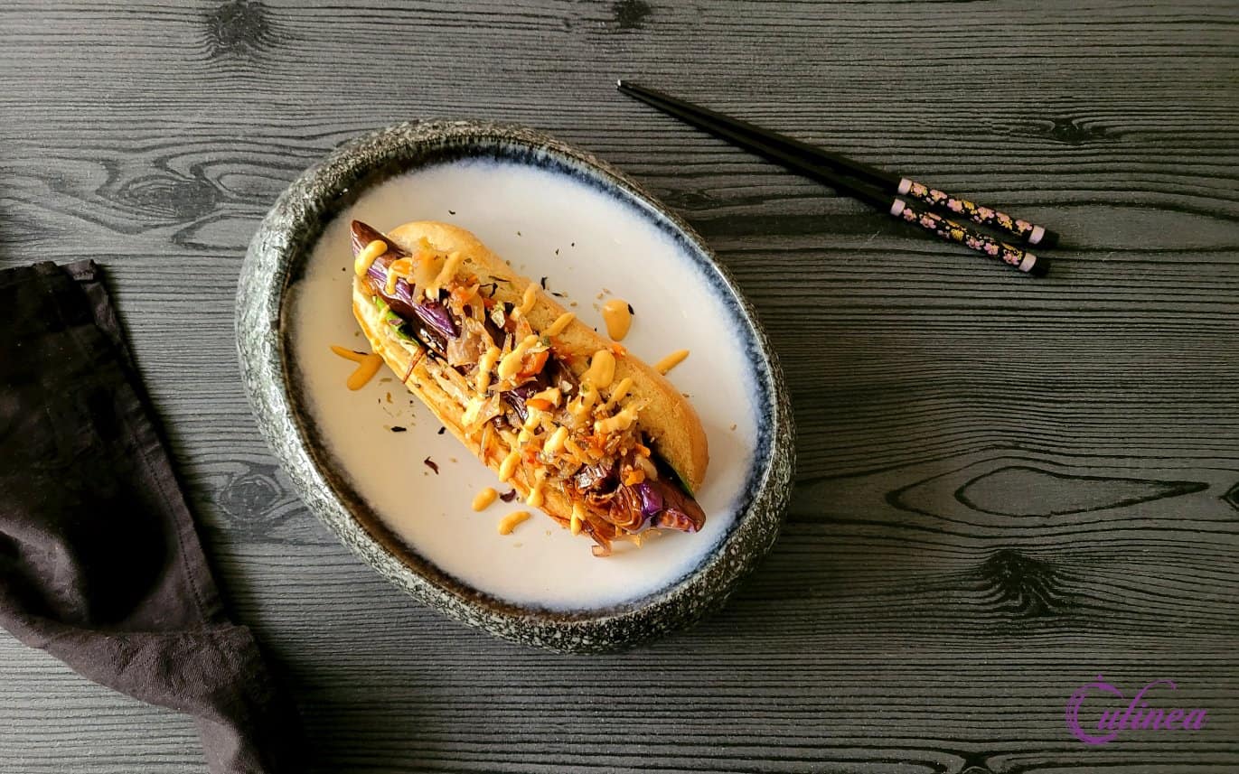 Vegetarische aubergine hotdog