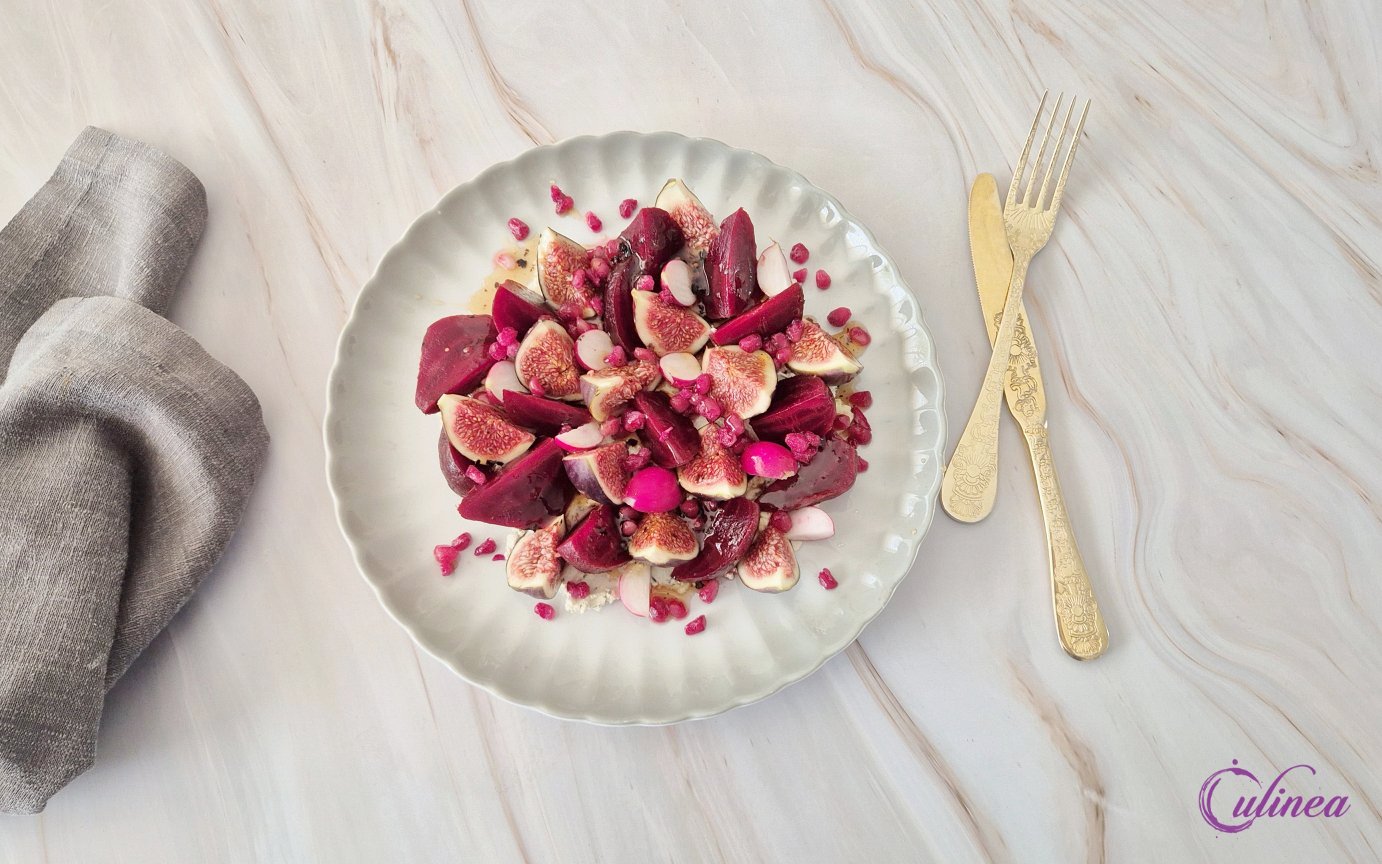 Ontdek dit feestelijke en herfstachtige salade recept met biet, vijg, granaatappel, roomkaas en hot honey. Fris, romig en verrassend met een pittige twist. Een salade