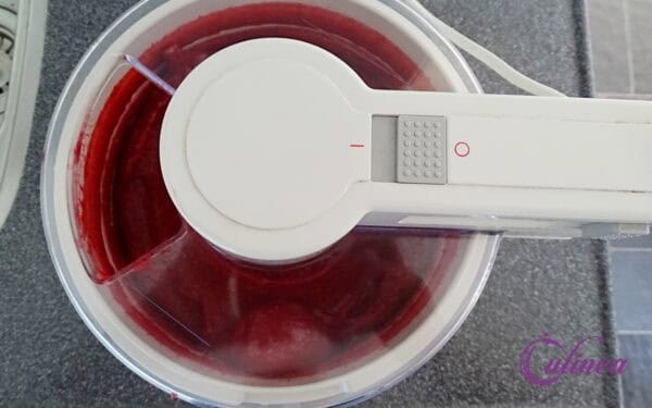 - Zet de ijsmachine aan en giet de puree in de ijsmachine. Laat dit zo lang draaien tot er een sorbetijs ontstaan is.