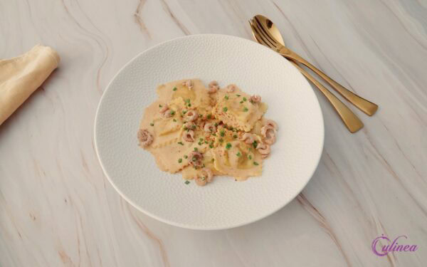 - Schep de ravioli met garnalen voorzichtig op twee borden. Bestrooi met de gehakte bieslook en eventueel nog wat gerookte paprikapoeder.
