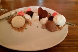 Chocolat d’amour. Het dessert bestaat uit Chocoladeverrassingen voor twee. Een groot bord met overheerlijke pure chocolade en amandelmousse, witte chocolademousse, pralinécreme, vanille panna cotta, vanille ijs, chocolade brownie, merengues en kruimeldeeg. Ik doe het nog heel voorzichtig aan met dessert na mijn gastric sleeve operatie. Hubbie gaat zich helemaal te buiten aan de rest en eet bijna twee desserts op!