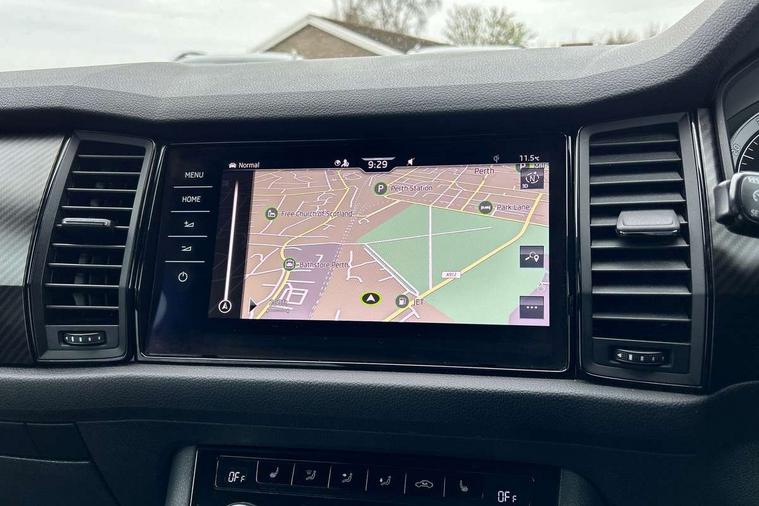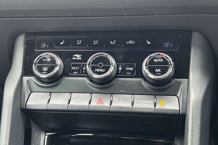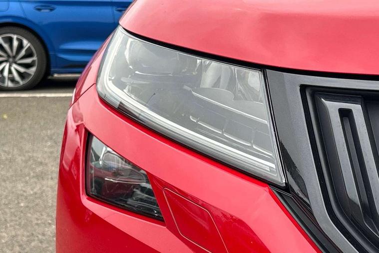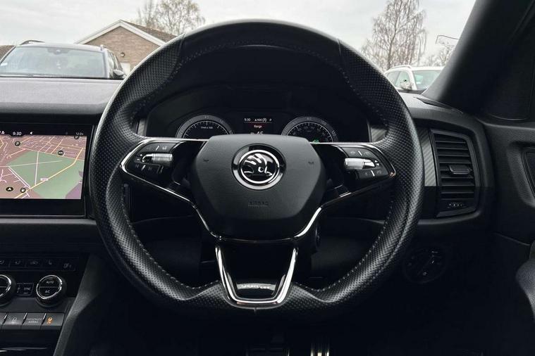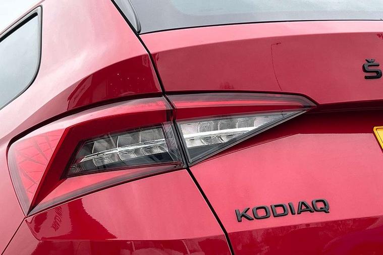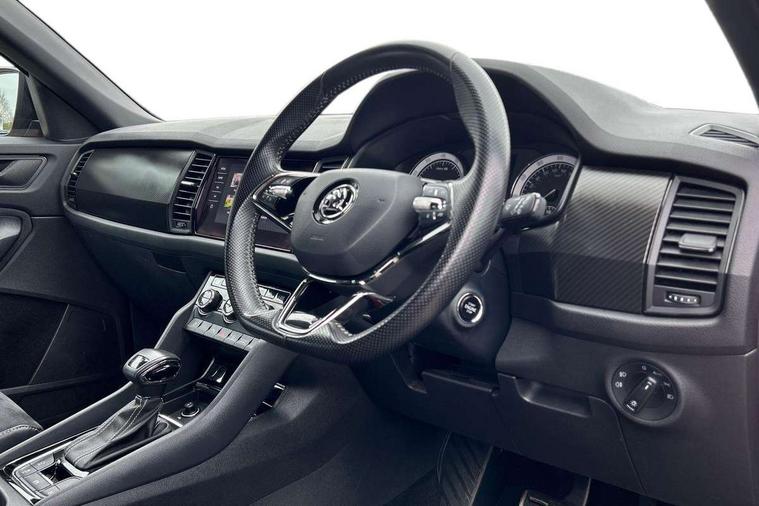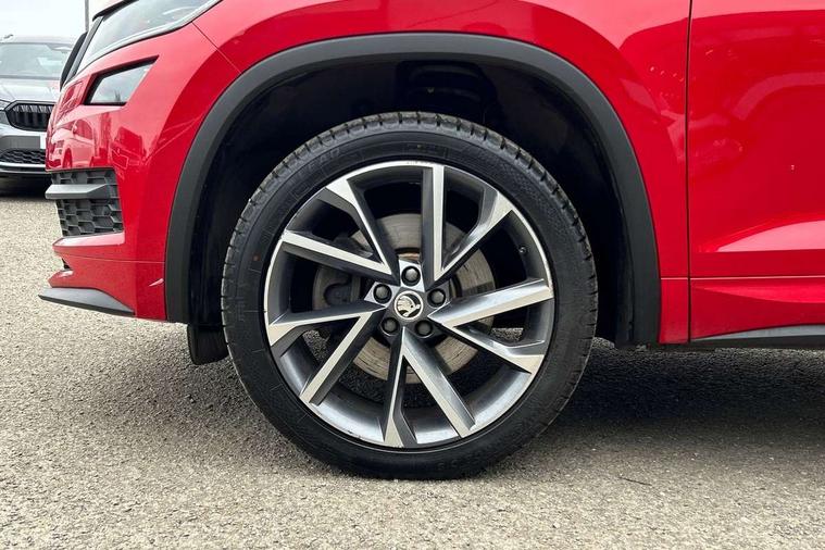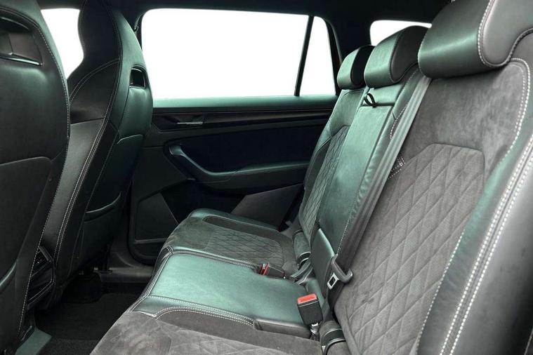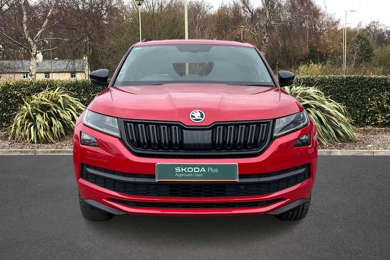 Carbon finish dashboard and door inserts, Chrome air vent surrounds, LED Interior Light pack - Kodiaq Scout/Sport Line/VRS/Laurin + Klement, 20" Vega Anthracite alloy wheels with anti-theft wheel bolts, Alarm with interior monitoring and tilt sensor with safe function, Immobiliser, Keyless entry and start system (KESSY), Remote central locking, Bolero Radio, DAB Digital radio, DVD System, Auto door release and activation of warning lights, Driver and passenger airbags, Electronic parking brake with hill hold control, Emergency rear braking signal, ESC (incl. ABS+MSR+ASR+EDS+HBA+DSR+RBS+MKB), Front and rear three point safety belt on all seats, Front assist includes AEB city/urban, Front passenger airbag deactivation switch, Front side airbags, Fuel cut off safety device, Head and knee airbags, Rear disc brakes, Safety vest holder in door, Seat belt reminder for all seats, Tailgate unlocking from outside, Two tone horn, Tyre pressure monitor, Warning lights in front doors, Aero front windscreen wipers with intermittent function, Aero rear window wiper, Auto dimming rear view mirror, Automatic activation of hazard warning lights, Black electric window control buttons, Black roof rails and door mirrors with radiator grille and window surrounds, Black wheel arch surrounds, Body colour bumpers, Body colour door handles, Chrome exhaust tailpipe, Electric front and rear windows, Electrically adjustable/heated/foldable and auto dimming door mirrors with memory function, Front door steps with SportLine logo, Full LED Headlights with adaptive front light system and LED daytime running lights, Headlight washers, Heated rear window, LED front fog lights with static cornering light function, LED rear fog light, LED third brake light in rear spoiler, Light assistant (coming home/tunnel light), Rain and light sensors, Rear diffuser, Rear spoiler, Safety reflectors on front and rear doors, Sportline badge on front fender, Sports front and rear bumpers, Sunset privacy glass, Tailgate lettering in Black, Without engine designation, 12V socket in boot, 2 rails with 2 hooks including 4 hooks for net programme, 3 spoke leather sports heated multi-function steering wheel with hands off detection, 4 foldable roof handles with rear coat hooks, 4 lashing points on luggage floor, 60:40 foldable rear seat with sliding adjustment and backrest angle adjustment, Alcantara door panels, Alcantara/Leather upholstery with Sport seats with silver stitching, Aluminium pedals, Black roof headlining, Bottle holders in door panel in the 1.5 litre front and 1 litre rear, Cargo storage compartments, Centre console with open storage box, cup holder and 12V socket, Chrome headlight control button, Chrome interior door handles, Coat hooks on B pillar, Covered storage compartment on driver side, Front and rear door armrest with black adductor trim, Front and rear height adjustable headrests, Front centre armrest with storage compartment, cup holder and 12V socket, Front courtesy lights, Gear shift lever with chrome frame and black gloss insert, Illuminated and cooled glovebox, Illuminated luggage compartment, Isofix child seat fittings in outer rear seats with top tether, Manually adjustable steering column, Net programme in boot (1x horizontal Net, 2x vertical Nets), Overhead glasses storage compartment, Paddles on steering wheel for DSG gearbox, Pollen filter, Rear centre armrest with cupholders, Roll up luggage compartment cover with intermediate position, Small Bags on the inner sides of the front backrests, Storage compartment in lower middle instrument panel with closing, Three rear height adjustable headrests, Ticket holder on A Pillar, Umbrella in door panel, Bluetooth system, Columbus satellite navigation with 9.2" touch screen and integrated Wi-Fi + WLAN and web radio, Digital voice enhancement, ECO Stop/start function, Exterior temperature indicator, Map care, Progressive power assisted steering, SmartLink plus, Speed limiter, Sports dials, USB C Port x 2 in front centre console,