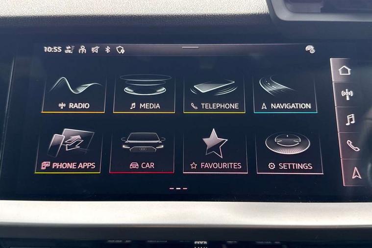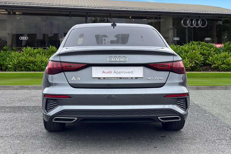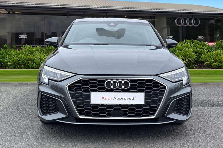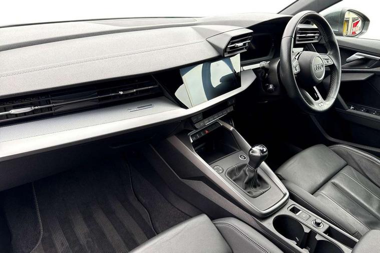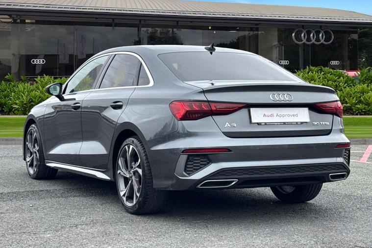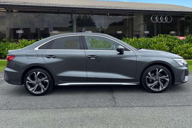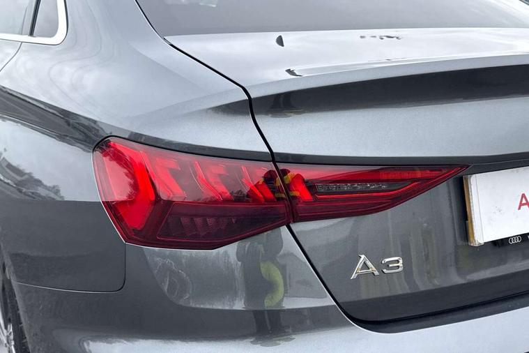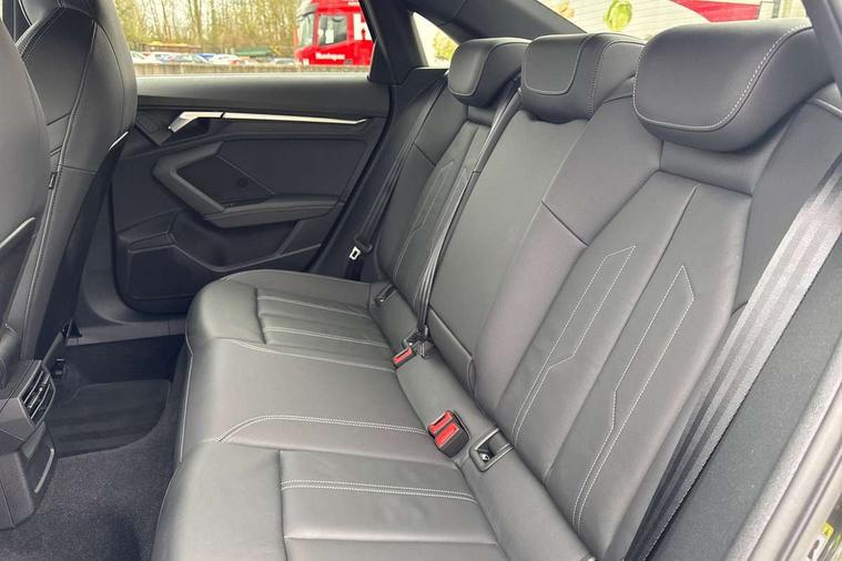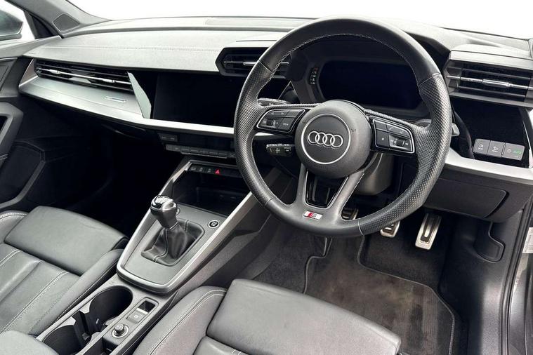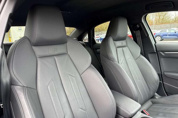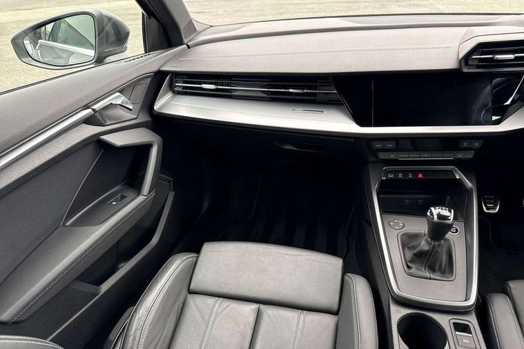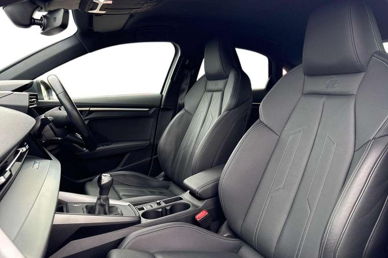 Aluminium air vent surrounds, Dark spectrum aluminium inlays, accent surfaces in the dashboard and centre console in platinum grey silk effect paint finish, Aluminium interior elements pack - A3 Saloon, LED interior lighting pack - A3 Saloon, S line styling pack - A3 Saloon, Anti theft alarm, Anti-theft wheel bolts, Electronically operated child locks, Immobiliser, Remote control central locking, 2xUSB-C connection with data and charging functions, 6 passive loudspeakers, CD player, DAB Digital radio, 3x3 point rear seat belts, Driver and front passenger airbag with passenger airbag deactivation, Electronic Stabilisation Control (ESC) including ABS, ASR and EDL, First aid kit with warning triangle and 2 safety vests, Front side airbags with head airbags and interaction airbag, Pre-sense front with pedestrian and cyclist detection, Seatbelt monitoring, Tyre pressure loss indicator, 3rd brake light, Acoustic glass windscreen, Aluminium window trim, Auto dimming frameless rear view mirror, Body colour exterior mirrors, Electrically adjustable/heated/folding/dimming door mirrors with kerb view includes integrated LED indications + kerb view function for passenger side, Front electric windows, Illuminated door sills with aluminium inserts at the front with S logo, LED daytime running lights, LED headlights with LED rear lights and dynamic rear indicators, Light and rain sensors, Model and engine designation badges at rear, Privacy glass - dark tinted rear window, rear door and side windows, Rear boot, Rear electric windows, Rear side wing doors, S line bumpers, S roof spoiler, 12V socket and storage compartment in front centre console, 3 seat bench in 2nd row, 3 spoke leather multifunction steering wheel, 4 way electrically adjustable lumbar support for driver and front passenger, 60/40 split folding rear seat bench, Black cloth headlining, Dual zone electronic climate control, Front and rear centre armrest in artificial leather, Front and rear headrests, Front/rear floor mats, Height and reach adjustable steering wheel, Interior lighting - glove compartment light and right hand side, Luggage compartment floor covering, Manual boot compartment lid, Manually adjustable front seats, Seat side bolsters, Single front passenger seat, Stainless steel pedals and front footrest in black, Twin leather upholstery with front sports seats S embossed logo, Audi drive select (Auto, Comfort, Dynamic and Individual), Audi smartphone interface, Audi Virtual Cockpit - 10.25" digital and colour instrument cluster, Automatic start/stop system with recuperation, Bluetooth interface, Camera based traffic sign recognition, Collision avoidance assistant, Cruise control + speed limiter, e-Call (emergency call), Electromechanical power speed sensitive steering, Lane departure warning system, MMI Navigation Plus with high resolution 10.1" colour touch screen display, Rear parking sensors, Service indicator, Trip computer, Voice control system with natural language interaction, Sports suspension,
