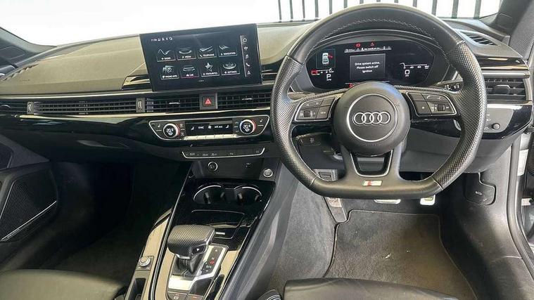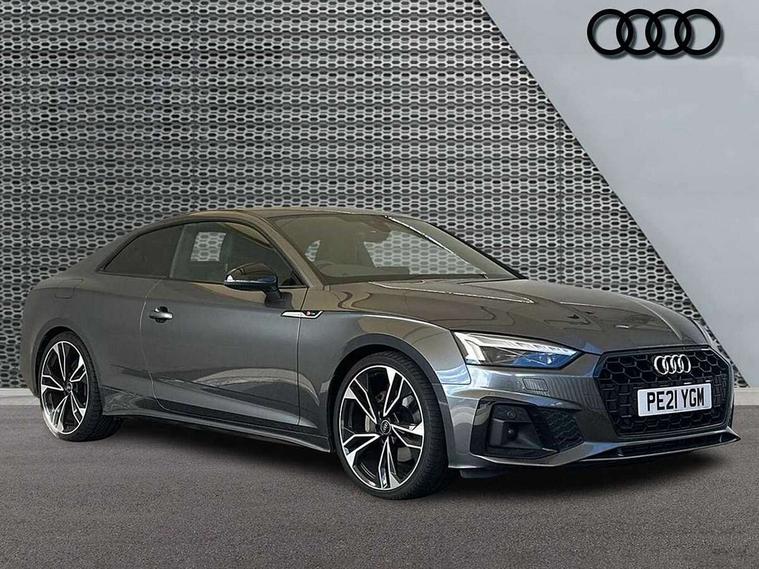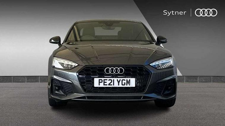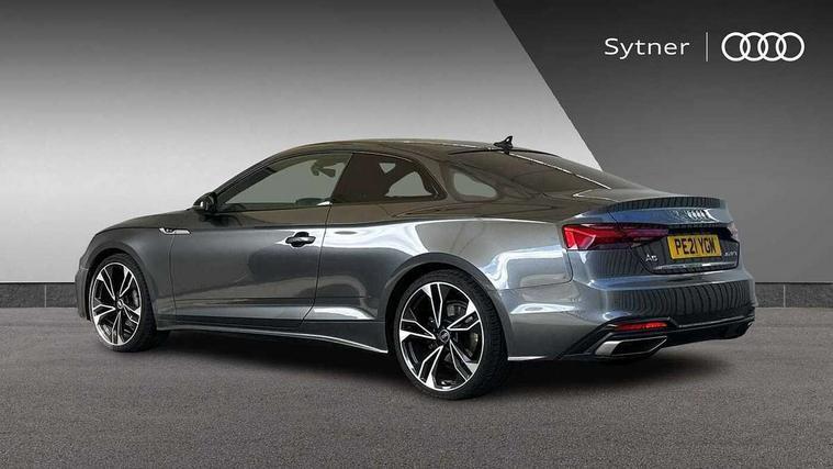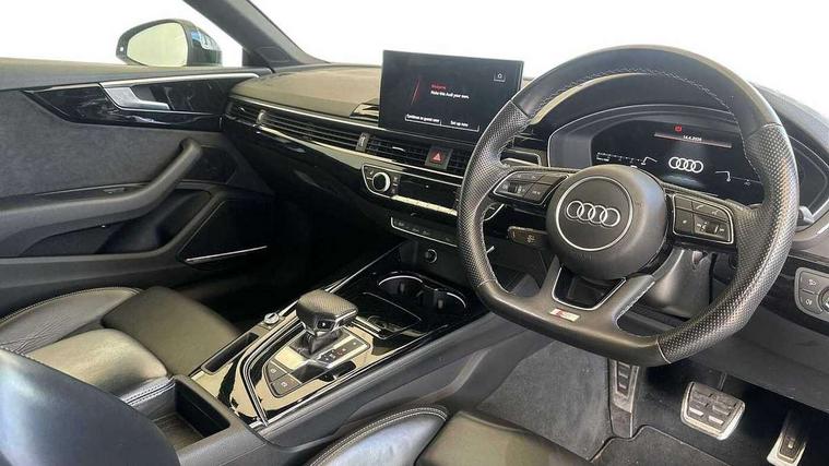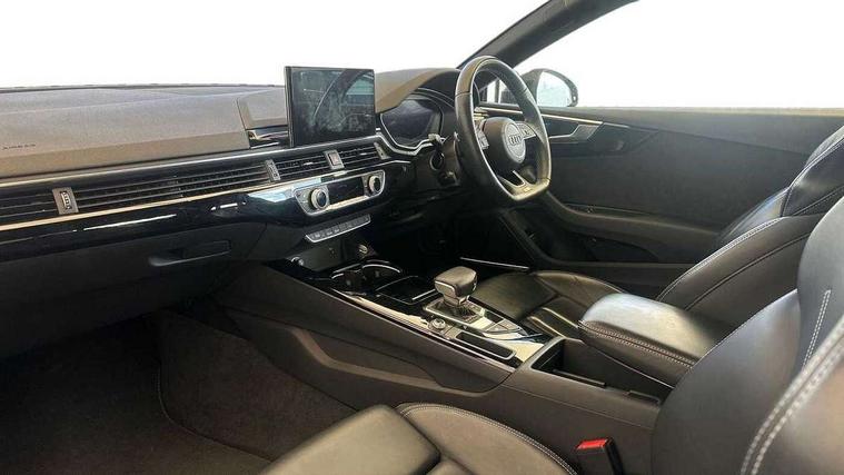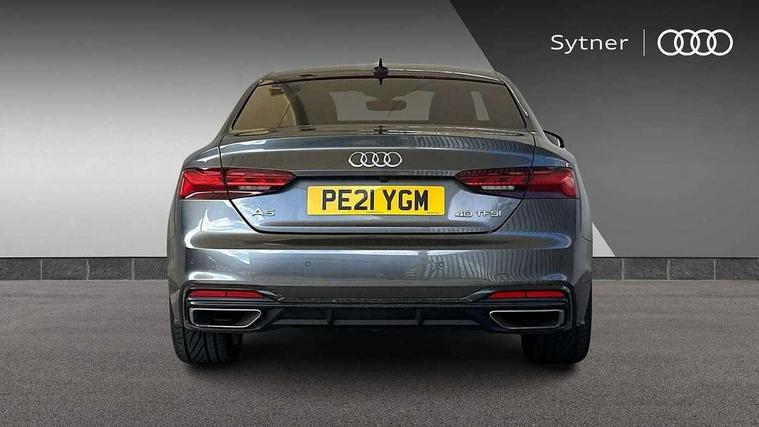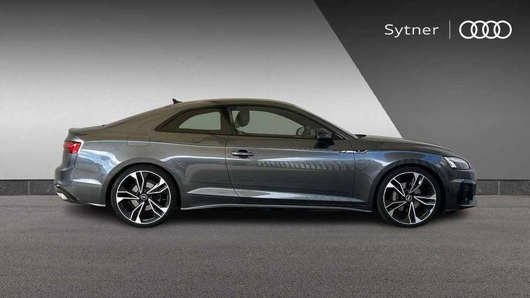 Piano black finish inlay, Black styling pack - A5 Coupe/Sportback, LED interior light pack - A5/RS5, 20" 5 twin spoke polygon design alloy wheels in gloss anthracite black and gloss turned finish, Tyre repair kit, Anti theft alarm system, Anti theft wheel bolts, Immobiliser, Keyless Go, Remote central locking, 8 passive loudspeakers, CD player, DAB digital radio reception, Two additional USB ports for rear passenger in rear centre console, Two SDXC card slots, 2 x 3-point rear seat belts, 6 airbags - Driver, front passenger, curtain and side airbags, Electromechanical parking brake, Electronic Stabilisation Control (ESC) including ABS, ASR and EDL, Front passenger airbag deactivation, Height adjustable front seatbelts, Hill hold assist, Multi collision brake assist, Pop-up bonnet for pedestrian protection, Seatbelt monitoring, Tyre pressure warning, Variable restraint system, Warning triangle and first aid kit, Auto dimming rear view mirror, Black door mirror housings, Body colour bumpers, Body colour door handles, Body colour front spoiler lip, Body colour side sill trim, Electric adjustable heated door mirrors, Electric folding door mirrors, Electric front windows, Front fog lights, Honeycomb structure radiator grille in grained matt black, Matrix LED headlights with Audi laser light, dynamic light sequencing and dynamic indicator, Matt aluminium silver tailpipe trim, Privacy glass, Rain and light sensors, Rear diffuser in matt titanium black with trim strip in matt aluminium silver, Side air inlets in grained matt black with matt aluminium silver inlay, Sport front and rear bumpers with side skirts, Towbar preparation, Windscreen with acoustic glazing, 4 way electric lumbar support for driver and front passenger, 40/20/40 split folding 2 seater rear seat bench with rear centre armrest, Adjustable steering column, Black cloth headlining, Black perforated leather gearknob, Contrast stitching on seats, steering wheel and gear lever gaiter, Deluxe 3 zone electronic climate control, Electrically adjustable front seats, Fine Nappa leather upholstery with front sports seats S embossed logo, Front centre armrest, Front head restraints, Front/rear floor mats, Heated front seats, Illuminated door sill trim with S logo, ISOFIX child seat mounting and top tether, Luggage compartment mat, Rear headrests, Stainless steel pedals, Sunvisors with vanity mirrors, Tool kit, Audi connect safety and service (e-call), Audi drive select (Auto, Comfort, Dynamic, Efficiency and Individual), Audi parking system plus with front and rear sensors, Audi phone box with wireless charging, Audi smartphone interface, Audi virtual cockpit - 12.3" full colour digital instrument cluster, vehicle/engine speed, Radio/media information+Driver assistance systems, Automatic start-stop system with coasting functionality and efficiency programme, Bluetooth interface, Electric boot lid release, Electro-mechanical power steering, Email, calendar and text messages displayed via MMI, MMI nav+ with MMI touch - 10.1" high resolution MMI display, touch sensitive, 3D map, route/country info, dynamic route guide, personal route assist, Rear view camera, Service interval indicator, Voice control system, Sports suspension lowered by 23mm,