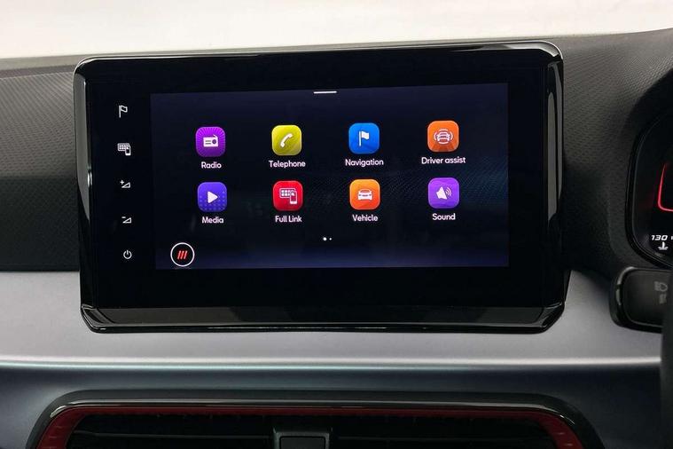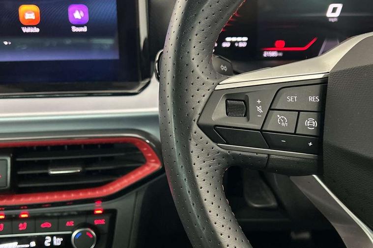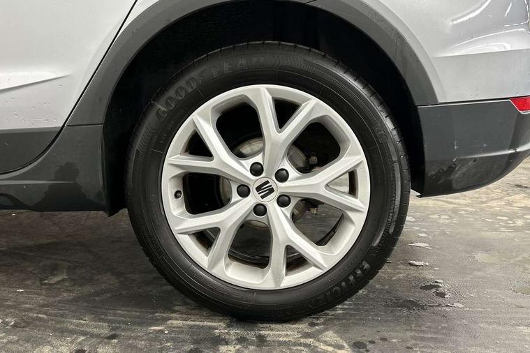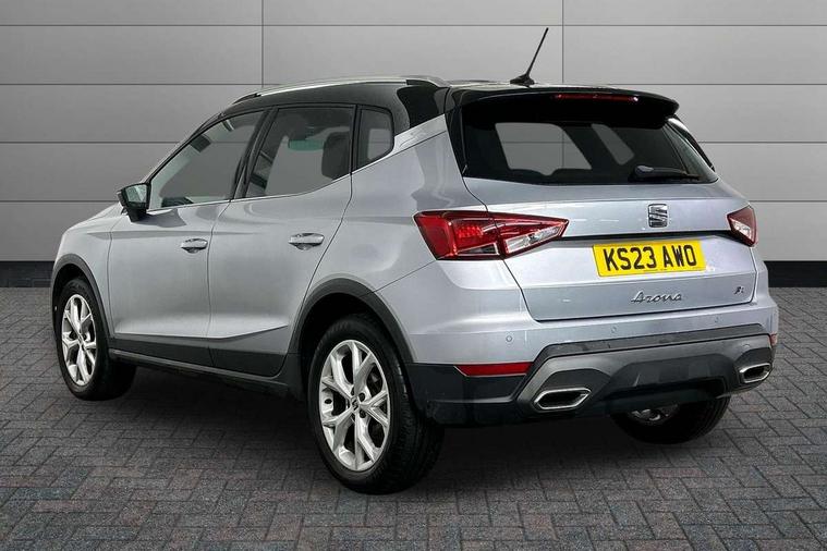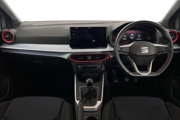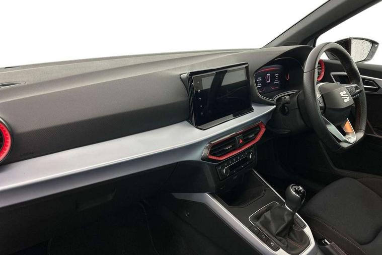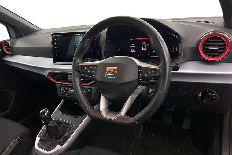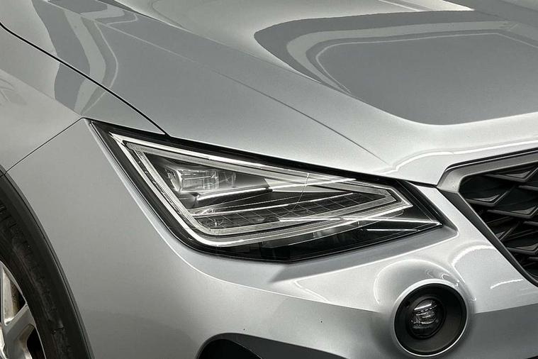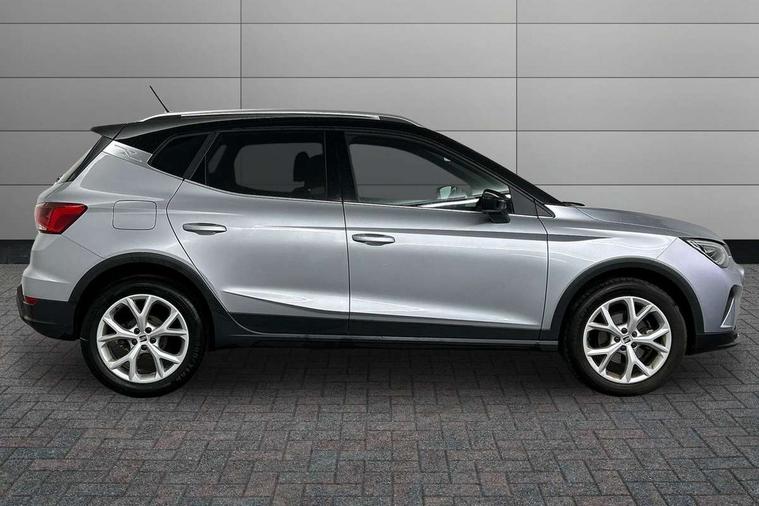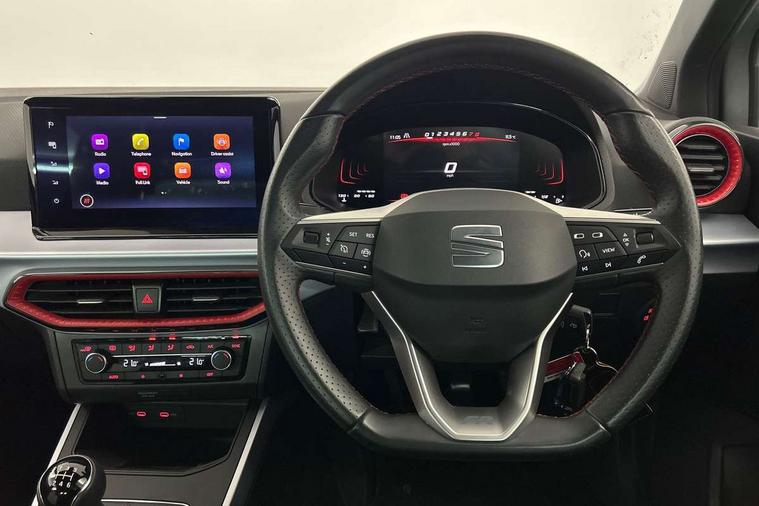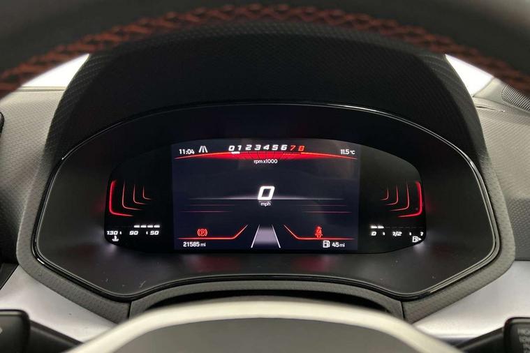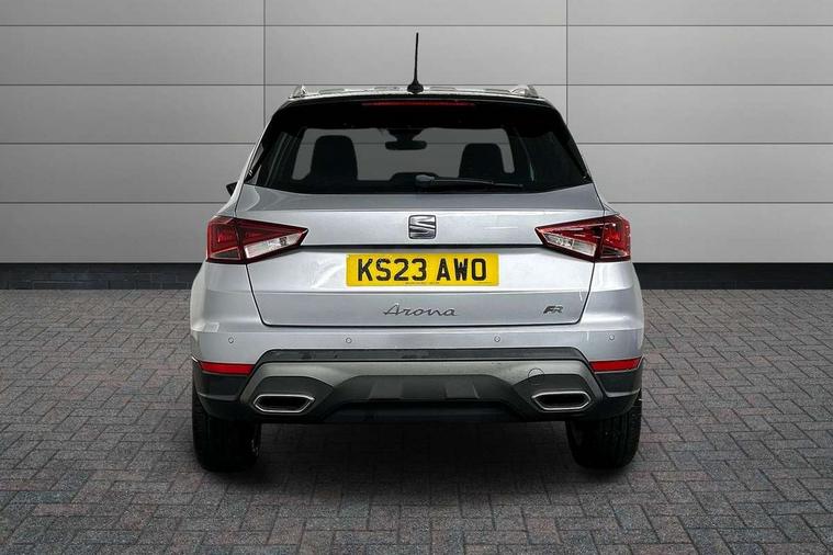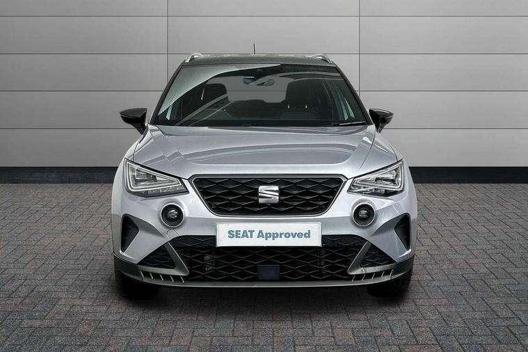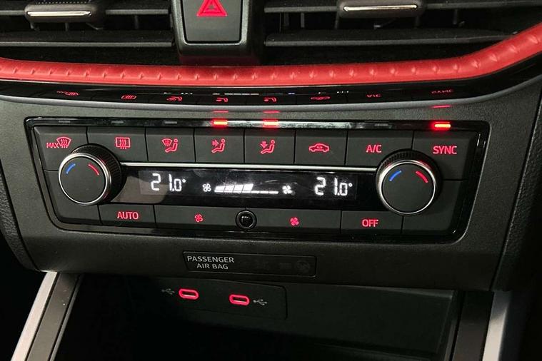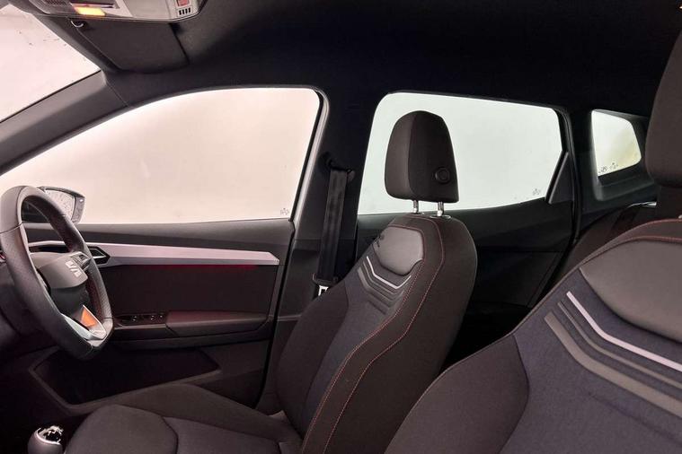 Titan black dashboard, Interior chrome pack - Arona, 17" Dynamic alloy wheels, Alarm with back-up horn, Electronic engine immobiliser, Locking wheel bolts, Remote central locking + deadlocks, Tow away protection, 9.2" colour touchscreen with navigation system, voice control and USB port (type c), Bluetooth interface for hands free and audio streaming, DAB digital radio and AM/FM radio, Steering wheel mounted audio controls, 3 point seatbelts on all rear seats, ABS, Active front headrests, Child locks on rear doors, Driver and front passenger airbags with front passenger airbag de activation, front side and curtain airbags, Electronic stability control, Emergency Brake Assist (EBA) and front assist, Front and rear seatbelt reminder, Hill hold control, Multi-Collision braking, Tiredness recognition system, Traction control, Tyre pressure monitoring system, Anti theft roof antenna, Auto dimming interior rear view mirror, Automatic activation of hazard warning lights, Body coloured bumpers, Body coloured door handle inserts, Chrome roof rails and window surrounds, Dark tinted rear windows, Electric front/rear windows, Electrically adjustable, heated and folding door mirrors, Front fog lights with cornering function and rear fog light, FULL LED automatic headlights with dynamic headlight range control, coming and leaving home, LED daytime running lights, LED rear tail lights and licence plate lights, Protective side mouldings, Rain sensing wipers, Rear side wing doors, Rear spoiler, Rear window wash/wipe, Roof colour door mirrors, Third brake light, Twin exhaust pipe styling hidden exhaust pipe, Visible VIN plate, Windshield wiper with intermittent control and potentiometer, 2 cupholders, 3 seat bench in 2nd row, 60/40 split folding rear seat, Aircare filter, Black interior roof, Cloth upholstery, Double boot floor, Driver sunvisor with covered mirror + card holder, Dual zone climate control, Front courtesy light with front and rear reading lights, Front sport seats, Gear shift indicator, Height adjustable front seats, Height/reach adjustable steering column, Illuminated boot, Instrument lighting with brightness control, Interior ambient lighting, Interior light in footwell, central console and door panel, ISOFIX points in outer rear seats with top tether anchorage points, Passenger sunvisor with vanity mirror, Perforated flat bottomed leather steering wheel/gear knob/handbrake with red stitching and FR logo, Single front passenger seat, Two front and three rear height adjustable headrests, 'Lights On' Reminder warning buzzer, 8" Digital cockpit, Digital clock, E-call, Electric speed sensitive power steering, Full Link Smartphone Integration with Mirror Link, Apple Car Play, Google Android Auto with USB Type C cable for Apple and Android compatibility, Lane keeping system, Low fuel warning light, Outside temperature display, Rear parking sensor, RPM counter, Seat connect with safety, service, remote and online, SEAT Drive profile - Four different models normal-sport-eco-individual, steering response, throttle response, Trip computer, Wireless phone charger,