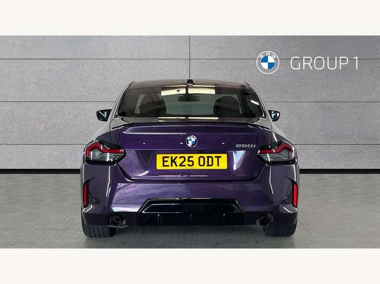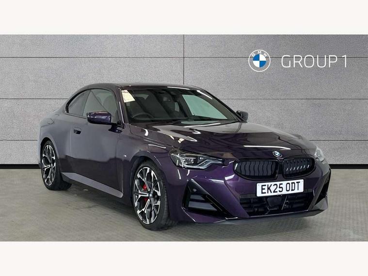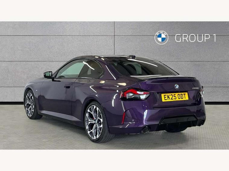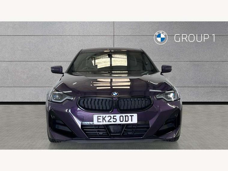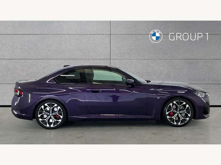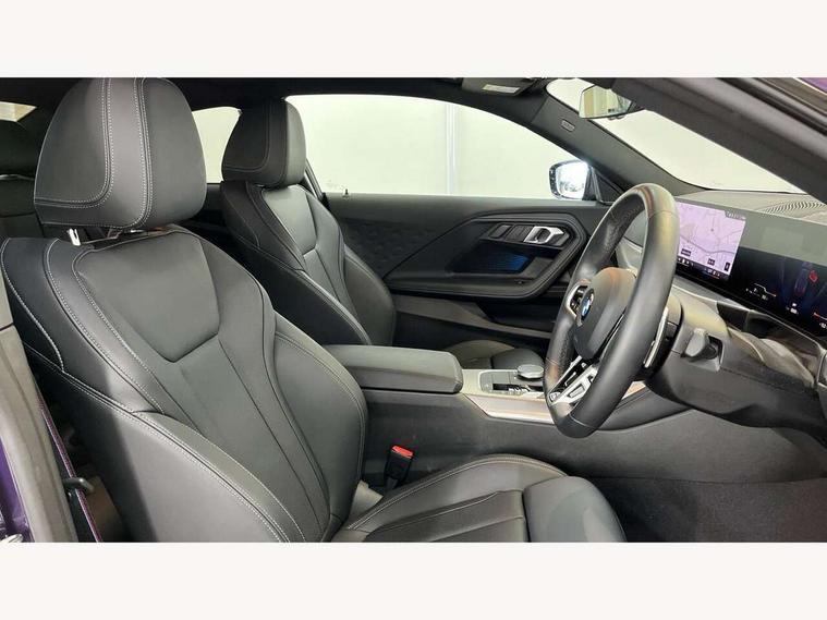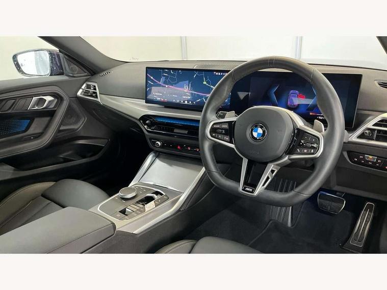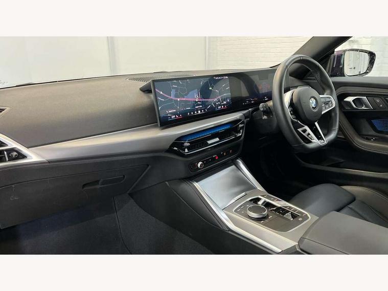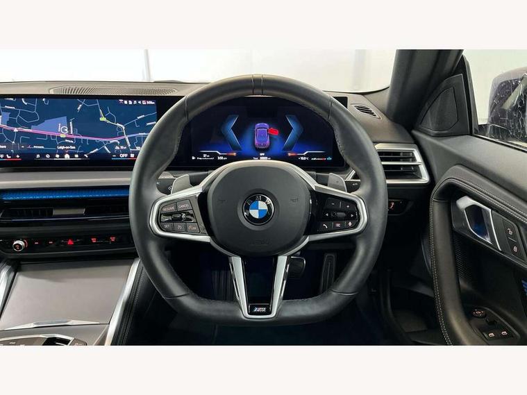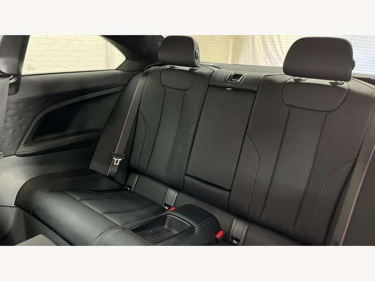 2 USB connections for charging and transferring data, Active guard plus, Attentiveness assist, Bluetooth with USB, BMW ConnectedDrive online services, BMW Intelligent Personal Assistant, BMW Live cockpit plus, BMW operating system 8 with variable, configurable widgets display information in real time, BMW Teleservices, Check Control warning system for monitoring of lights and door/luggage compartment open warning, Control Infotainment, Direct selection buttons, Drive off assistant, Eco pro mode, Electric power steering, eSim with 5G connectivity, Front and rear parking sensors, iDrive controller with turn and press function, Integrated owners handbook, Intelligent functions, Oil sensor for level and grade, Optimum shift indicator, Personal Profile, Smartphone integration, Touch operation on control display, Variable sport steering, Widescreen multi-media display, WiFi interface for wireless connection of mobile terminal devices, Aluminium lightweight construction, Balancer shaft, BMW TwinPower Turbo four-cylinder petrol engine, Double VANOS, Drive performance control with ECO PRO comfort + sport mode, Electronic differential lock, High precision injection, M sport suspension, Petrol Particulate Filter, Steptronic transmission with gearshift paddles, Twin scroll turbocharger with Valvetronic, DAB tuner, Acoustic windscreen wipers for reduced driving noise, Automatic windscreen wipers and automatic headlight, Body colour door handles flush with door surface, Body colour door mirrors, Body colour front and rear bumpers, Daytime running lights, Electric windows - front and rear, with open/close fingertip control and trap release, Exhaust tailpipes x2 - 90mm in left and right, Fading support, Front and rear bumper system with replaceable deformation elements, Front door sill finishers in black plastic with BMW designation, Front windscreen wipers with integrated washer jets, Green tinted heat protection glazing, High beam assistant, High gloss black sill, bumper trim sides and diffuser insert, High level third brake light, Indicators integrated int mirror housing, Interior rear-view mirror with automatic anti-dazzle function, LED registration plate light, LED technology rear tail lights, brake lights and turn indicators, Lightweight engineering, M high gloss shadowline, One piece kidney grille with hight gloss chrome surround, Rear boot, Rear fog lights, Reversing light in rear light cluster, Shark fin antenna, Single part LED rear lights with smoked glass components, Trailer stabilisation logic, Visible VIN plate, 12V power socket in front centre console with blanking plug, 2 cupholders in front centre console, 2 zone automatic air conditioning, Ambient lighting, Compartment in front of cupholder, Conditioned based service, English handbook, Folding rear seat head rests, Front and rear side armrests integrated into door trim, Front armrest, Front door pockets, Front head restraints, Heated front seats, Illuminated glove compartment with separate small compartment, M headliner Anthracite, M sport leather steering wheel, Manually adjustment steering wheel column, Rear seat backrest with manual 40:20:40 split folding, Rear seat centre foldable armrest with integrated cup holder, Single front passenger seat, Storage compartment between rear seats, Storage tray and compartment with cover in centre console, Sun visors with vanity mirrors and insert tab, Through loading system with 40/20/40 split folding 2 rear seat in 2nd row, Velour floor mats, Additional storage compartment pack without USB - 2 Series Coupe, Connected pack professional - 2 Series Coupe, 2 tone horn, Anti lock braking system (ABS) with cornering brake control, Automatic Stability Control (ASC), BMW emergency call, Brake drying, Child seat ISOFIX attachment for the two outer rear seats, Crash sensor activating of airbags, Unlocking doors, hazard warning lights, fuel cut off, interior lighting+activation of safety battery terminal clamp, Deactivation of fuel pump in the event of a crash, Driver and front passenger airbags, Driver and front passenger side airbags, integrated in the door side seat backrest bolsters for all seat variants, Dynamic brake control, Dynamic stability control + (DSC+), Dynamic Traction Control - DTC, Electrically operated hand brake including automatic hold function and automatic release when driving off, Front and rear disc brakes, Front centre airbag between driver and front passenger seats, Front passenger airbag deactivation, Head airbags for all 4 outer seats, PC iBrake (Post crash approach control warning with light braking function), Seat belt security check for driver and front passenger, Seatbelt warning, Side impact protection, Three point seat belts on 4 seats including front belt stopper, pyrotechnic belt tensioners and belt force limiters, Tyre pressure monitoring system, Warning triangle and first aid kit, Alarm system (Thatcham 1) with remote control and electronic engine immobiliser, Central locking switch for all doors, fuel filler cap and luggage compartment, Deadlocking function system to all doors, Drive away locking system on all doors and luggage compartment, Locking wheel bolts, Start/Stop button (illuminated) in centre console with keyless engine start and Auto Start-Stop deactivation button, Two remote control key with integrated key - one button for open and close doors/fuel flap/tailgate and separate button for unlock luggage compartment, Electrically powered 12V compressor, Reduced rolling resistance tyres, Tyre repair kit,