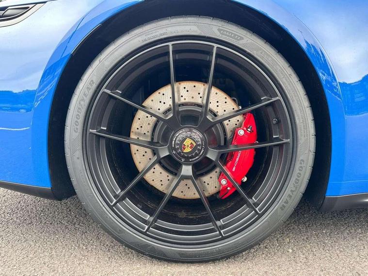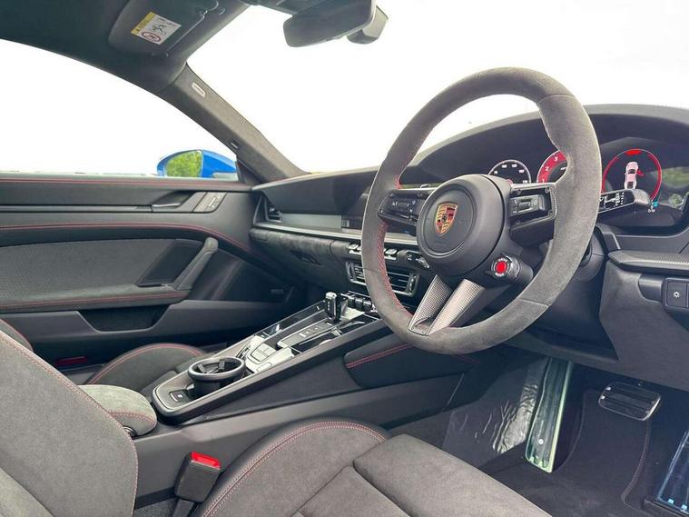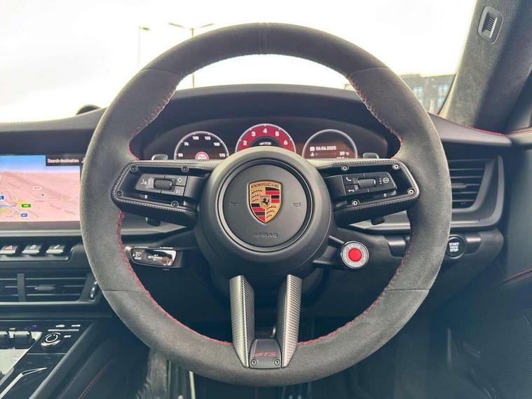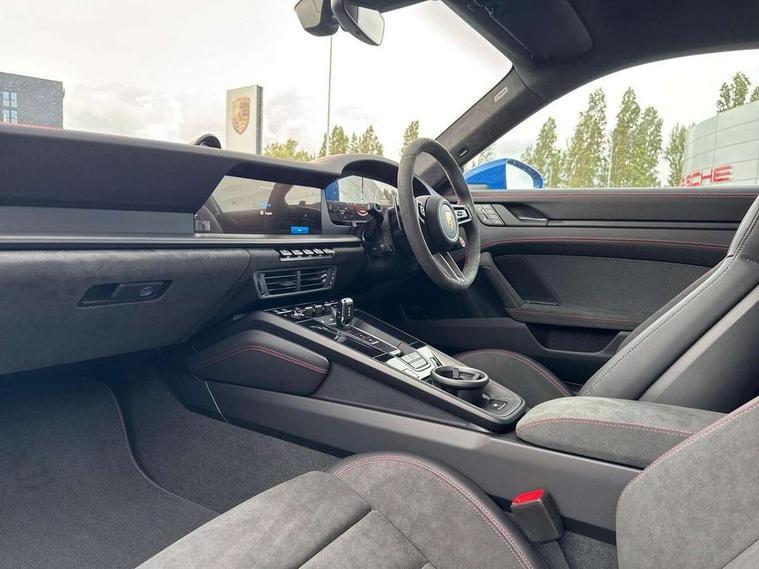 Apple CarPlay, Automatic start/stop system, Driver awareness detection, Emergency call systems eCall and bCall, Gear indicator in rev counter, Lane keep assist, Navigation High, Rear axle steering, Smartphone compartment with wireless charging up to 15 W, Stationary management with HOLD function, Traffic sign recognition, Voice control, Warn and brake assist including pedestrian protection, 3.6 liters 6-cylinder boxer engine with electric turbocharger, 63 litre fuel tank, 8 Speed Porsche Doppelkupplung (PDK), All wheel drive with map controlled multi plate clutch Porsche Traction Management (PTM), Lightweight on-board battery LiFe PO4, Lithium-ion battery, Porsche Torque Vectoring Plus (PTV Plus), Steering code with engine cooling system, Two gasoline particulate filter, DAB Digital radio, 3rd brake light, Automatic headlight activation including welcome home lighting, Automatically dimming interior and exterior mirrors with integrated rain sensor, Door handles painted in exterior colour, Electric folding door mirrors with courtesy lights, Fuel/charging cover, Heated rear windscreen, LED daytime running lights, Model designation on rear trim in satin black, PORSCHE logo painted in satin black, Rear boot, Rear lid grille with vertical slats in satin black, Trim on side skirts in black, Windscreen washer system with aero wiper blades and washer jets, 2-seater with rear engine layout, Delete quilting, Driver and front passenger illuminated vanity mirrors, Front head restraints, Headrests with stitched model designation, Heated front seats, ISOFIX fastening system, Leather door panel and central armrests, LED footwell lights, LED glove compartment lighting, LED ignition light, LED luggage compartment lighting, LED orientation light, LED reading lights, Lockable glove compartment, Particle/pollen filter with active carbon filter, Roof lining in Race tex, Single front passenger seat, Steering wheel with manual fore/aft and height adjustment, Two zone auto climate control, USB-C fast charging, Light design package - 911, Sport chrono package - 911 with porsche track precision app and tyre temperature display, 3 point automatic seatbelts, Airbags, Electric parking brake, Passenger airbag deactivation, Pedestrian safety, Seat belt warning system for driver and front passenger and rear seat system, Seatbelt pretensioners, Tyre pressure monitoring system, Warning triangle, Alarm system with interior surveillance, Alcohol interlock preparation, Comfort access system, Keyless drive, Porsche vehicle tracking system (PVTS Plus), Preparation for Porsche Dashcam, Interior trim in black brushed aluminum, TPM valve in black, Tyre sealing compound and electric air compressor kit, Wheel centres with full colour Porsche crest,