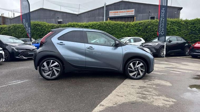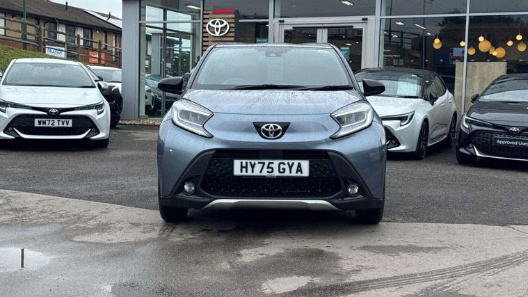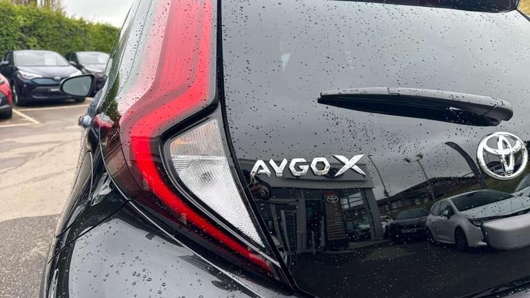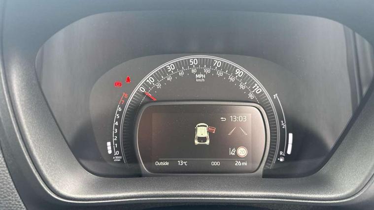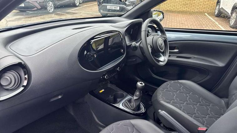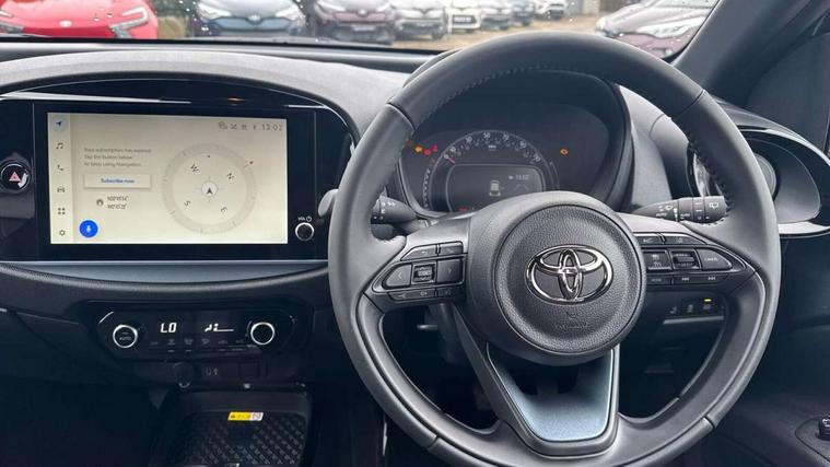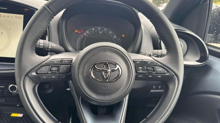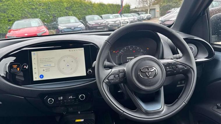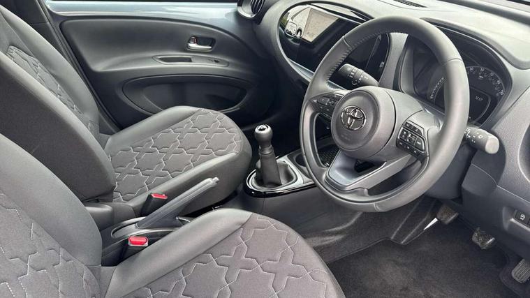 4.2" TFT colour screen, Adjustable speed limiter, Analogue speedometer, Bluetooth connectivity, Digital tachograph, Driver attention alert system, eCall emergency call system, Electric power steering, Front and rear parking sensors with auto brake, Intersection turn assist, Key reminder warning, Noise reduction kit, Pre collision system with emergency steering assist, Remote boot door release on key, Reversing camera with static guide lines, Smart entry and push button start, Smart phone integration with Apple car play/Android Auto, Speed limit display, Start and stop, Wireless charger, Vehicle Stability Control (VSC), 10.5" HD multimedia display touch screen with Toyota smart connect, 4 speakers, DAB digital audio broadcast, USB connector, Auto headlights, Auto wipers, Automatic headlights cut-off, Automatic high beam On/Off switch, Bicycle towing hook, Black contrast roof, Black fog light surrounds, Black side protection mouldings, Black wheel arch mouldings, Body colour door handles, Body coloured front bumper, Boot door scuff plate, Eclipse black rear bumper, Electric heated door mirrors, Follow me home headlights, Front and rear underruns in silver, Front fog lights, Front power windows, Gloss black door mirrors, Gloss black upper front grille, Headlight cut-off reminder, LED daytime running lights guide, LED front light guide, LED High mounted stop lamp, LED projector headlights, Manual day/night rear view mirror, Manual headlight levelling, Pagoda roof, Power adjustable door mirrors, Power back door, Privacy glass, Rain sensor, Rear combination lights LED bulb type, Rear side wing doors, Rear windscreen defogger, Rear windscreen wiper, Remote hazard lights system, Short antenna, Variable intermittent windscreen wipers, 12v power outlet - front, 2 seat bench in 2nd row, 3 spoke leather steering wheel, 50/50 split folding rear seat, Adhesive roof headlining, Adjustable speed limiter switch on steering wheel, Audio and telephone switches on steering wheel, Auto air conditioning, Black roof lining, Body colour satin anodised insert on steering wheel, Boot light, Centre room light, Chrome interior door handles, Chrome surround on air conditioning buttons, Clean air filter, Console box storage, Floor mats, Front and rear cup holders, Front head rest deco art, Front head restraints, Height adjustable driver seat, Intelligent adaptive cruise control switch on steering wheel, ISOFIX child restraint system on rear seats, Lane departure alert switch on steering wheel, Leather gearshift knob, Light blue ambient lighting in centre console, Manual tilt steering wheel, Manually reclining and sliding driver seat, Manually reclining and sliding front passenger seat, Multimedia switches on steering wheel, Partial synthetic leather upholstery, Pollen filter, Rear door pockets, Rear head restraints, Satin silver insert on gear shift knob, Single compartment glovebox with lights, Single front passenger seat, Soft tonneau cover, Sun visors with mirror on driver and passenger side, Voice recognition switch on steering wheel, Toyota safety sense pack - Aygo X, Anti lock braking system + Electronic brake force distribution, Child safety door lock, Emergency brake light signal (EBS), Hill start assist control (HAC), Passenger airbag on/off switch, Seat belt reminder for front and rear seats, Supplement restraints system (SRS) - 6 airbags, Traction control, Tyre pressure warning system, Immobiliser, Remote power door locks, Black wheel centre caps, Tyre repair kit,