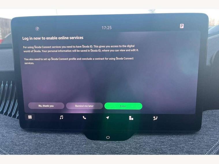 13" touchscreen display with satellite navigation, 4x USB-C ports (2x in front centre console and 2x in rear) (45W), Adaptive cruise control with speed assist, lane assist plus and traffic tram assist, Blind spot detection with door exit warning, Bluetooth system, CareConnect and Emergency Call, ChatGPT functionality, Driver fatigue sensor, Front assist with extended predictive pedestrian protection, Front cross traffic assist, PAS, Quick start all heating software functionality, Stop/start engine system, Traffic sign recognition, Turn assist with evasive assistance, Virtual Cockpit - 10.25" digital display, Voice control system, Washer for rear camera, Wireless charging for one smartphone (15W) with cooling function, Wireless smartlink apple carplay, SmartLink+ android auto, 8 Speakers, DAB Digital radio, Display cleaner, FM radio connection, Web radio connection, Acoustic side windows and interior noise suppression, Backdrop lighting, Body colour door handles, Body coloured door mirrors, Chrome window surround, Dark chrome grille surround, Electrically adjustable, heated, folding and driver side auto-dimming door mirrors with integrated indicators and logo projection, Frameless auto-dimming rear view mirror with USB-C, Ice scraper in fuel tank cap, LED 3rd brake light, Light assist with High beam control, Light assistant (coming/leaving home/tunnel light), Privacy glass, Rear fog light (x1), Rear side wing doors, Unique dark chrome design logo on alloy wheels, Windscreen wipers with rain sensor, 12V socket 1x centre console 1x boot, 2x cargo elements in boot, 2x light in boot, 3 seat bench in 2nd row, 60:40 Split folding rear seats, Bottle holders in the front doors 1.5 litre bottle and rear 1.5 litre bottle, Cup holder in front with easy open mat, Front armrest with storage box, Front comfort seats, Heated front seats, Height adjustable driver and front passenger seats with 2-way electric tilt, 4-way pneumatic lumbar support, and extendable thigh support, Height adjustable front and rear head restraints, Height adjustable front passenger seat, Illuminated glovebox, Interior lights with control switches, Isofix child seat fittings in outer rear and front passenger seats, LED front and rear reading lights, Massage function for front seats, Single front passenger seat, Skoda lettering on steering wheel, Storage compartment with cover, Storage pockets on back of front seats, Sun visors with illuminated vanity mirrors, Ticket holder on A Pillar, Tri zone climate control, Umbrella in driver's door, 3 rear seatbelts, 8 Airbags - Front driver and passenger, front side driver and passenger, centre, curtain front and rear, drivers knee, Crew protect assist, Driver and passenger seatbelts with warning light, Electronic parking brake, ESC including ABS, EBV, MSR, ASR, EDS, HBA, DSR, RBS, CBC, multi-collision brake (MKB) and Auto hold, Hill hold assist, Power operated child lock in rear doors, Alarm with interior monitoring tilt sensor and back up horn, Backrest remote release from trunk, Electronic engine immobiliser, Keyless start/stop, Remote central locking with SAFE system, Third key, Decorative front door sills,