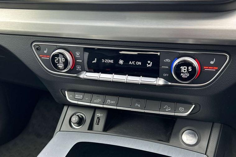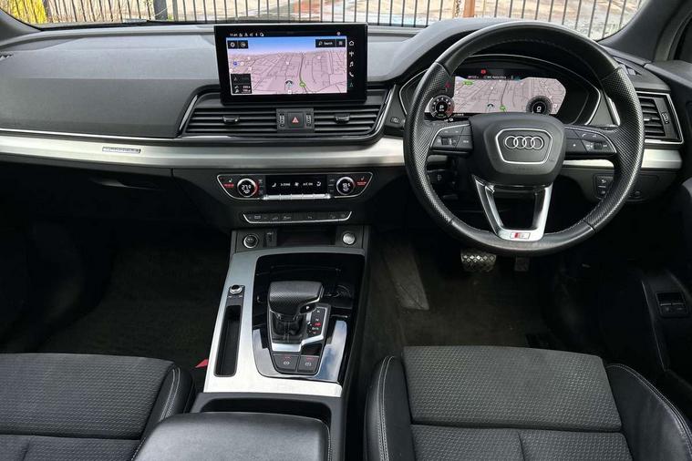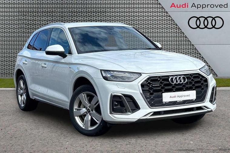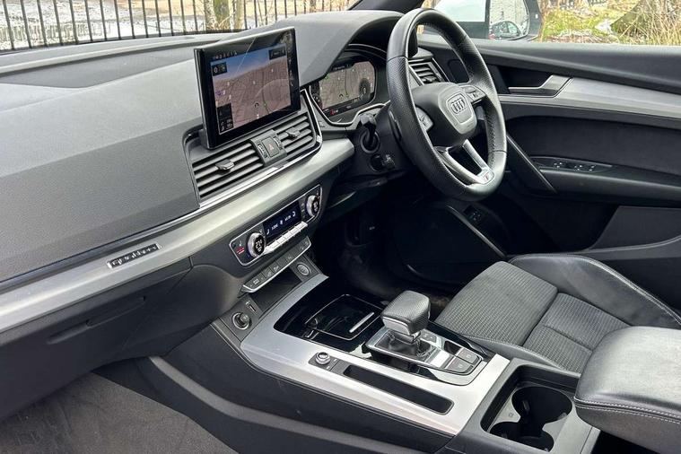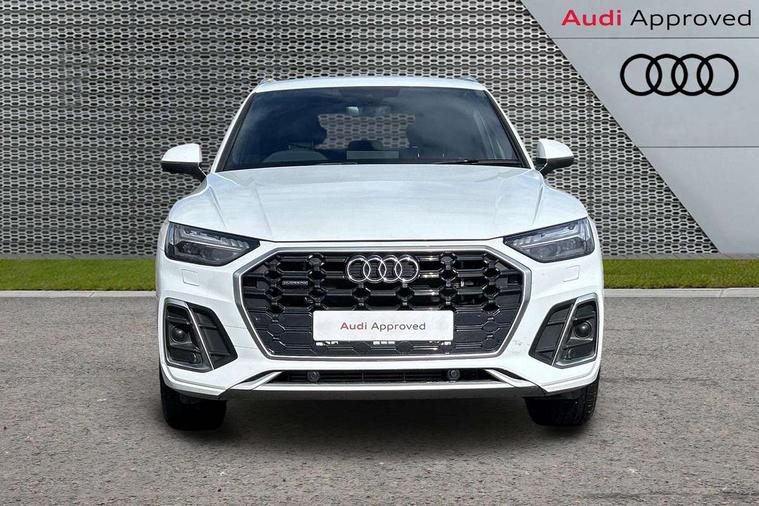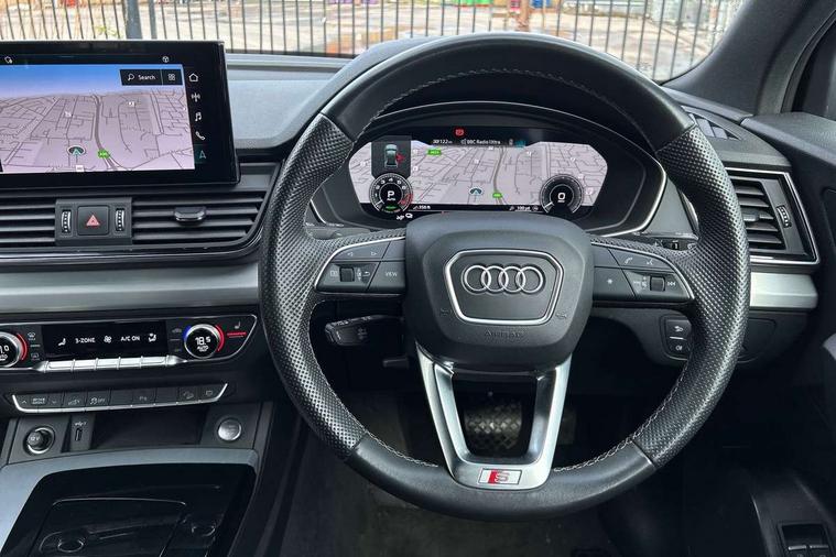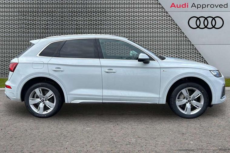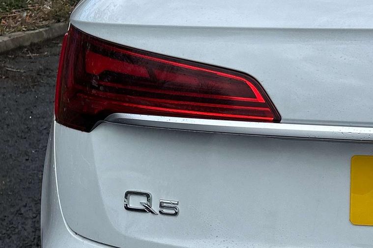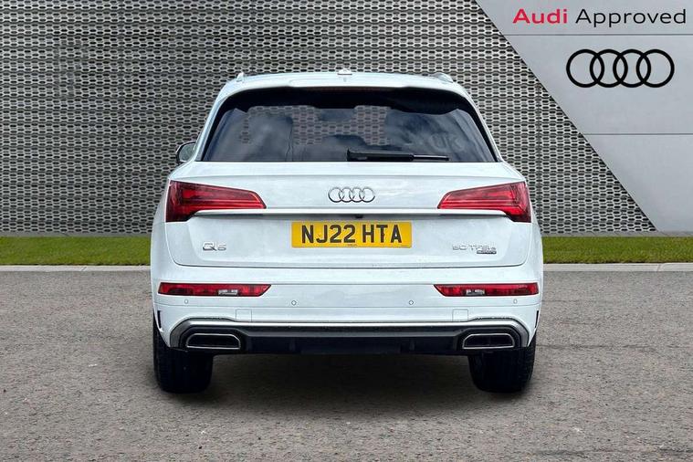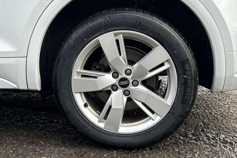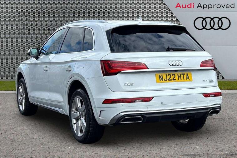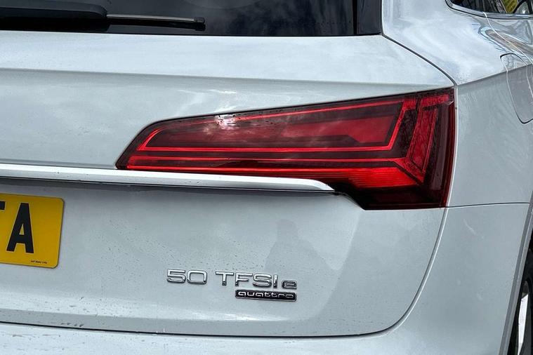 Audi connect safety and service (e-call), Audi connect with Amazon Alexa Integration, Audi drive select, Audi virtual cockpit plus with 12.3" screen and three different layout designs, Audi wireless smartphone interface, Automatic start-stop system with coasting functionality and efficiency programme, Bluetooth interface, Electro - mechanical power assisted steering, MMI navigation plus with 10.1" touch screen, Power tailgate, Reversing camera, Service interval indicator, Voice control system with Audi hotword activation "Hey Audi", 3 pin 10 amp domestic charging cable, 7.4 kW onboard charger, Dynamic suspension, Quattro on demand, Type 2 mode 3 22kW 32 amp charging cable, Type 2 socket for AC charging, 2 x USB charging port with aux input socket, DAB Digital radio, 3rd brake light, Acoustic windscreen, Aluminium roof rails, Audi matrix LED headlights with dynamic front and rear indicators, Auto dimming door mirrors, Auto dimming rear view mirror, Automatic headlights and windscreen wipers, Body colour bumpers, Body colour door mirrors, Body colour rear diffuser with matt aluminium silver surrounds, Body colour underbody protection, Chrome plated exhaust trims, Daytime running lights, Door sills in Selenite silver, Electric adjustable/heated/folding door mirrors, Front air inlet surrounds in aluminium, Front and rear electric windows, Front radiator grille in honeycomb design, Headlight washers, Lower bumpers painted in contrast Manhattan grey, Rear chrome trim strip below lights, Rear privacy glass and rear side windows, Rear side wing doors, Rear wiper, Roof bars, S Line badges on the front wings, S Line front and rear bumpers, S Line rear spoiler, S Line side skirts, 3 rear headrests, 40:20:40 split folding 3 rear bench seat in 2nd row with rear centre armrest, Black cloth headlining, Comfort front centre armrest, Contrast stitching on seats, steering wheel and gear lever gaiter, Deluxe 3 zone electronic climate control, Front/rear floor mats, Gear lever in black leather, Heated front seats, Height adjustable front head restraints, Height/reach adjustable steering column, Illuminated door sill trims with S logo, ISOFIX child seat mounting and top tether, Manual seat adjustment with 4-way electric lumbar support, Rear seat bench plus, Single front passenger seat, Sunvisors with vanity mirrors, Trunk roller cover, High gloss pack - Q5, LED interior light pack - Q5, 3 point seatbelts on all seats, 6 airbags - Driver, front passenger, curtain and side airbags, Electrically operated child locks on rear doors, Electromechanical parking brake, Electronic stabilisation control including ABS, ASR and EDL, Front passenger airbag deactivation, Hill descent control, Hill hold assist, Multi collision brake assist, Pop-up bonnet for pedestrian protection, Pre sense city, Seat belt force limiter, Seatbelt monitoring, Tyre pressure warning, Warning triangle and first aid kit, Anti theft alarm, Anti-theft wheel bolts, Keyless Go access/ignition system, Remote central locking, Matt brushed aluminium inlays, Tool kit, Tyre repair kit,