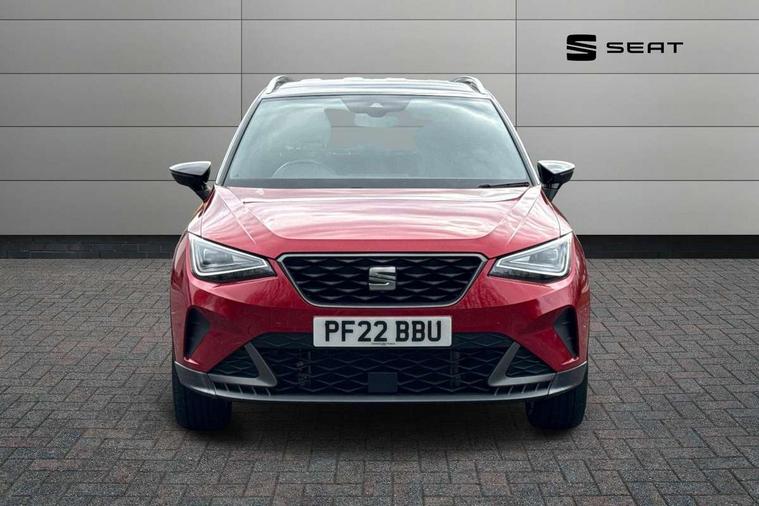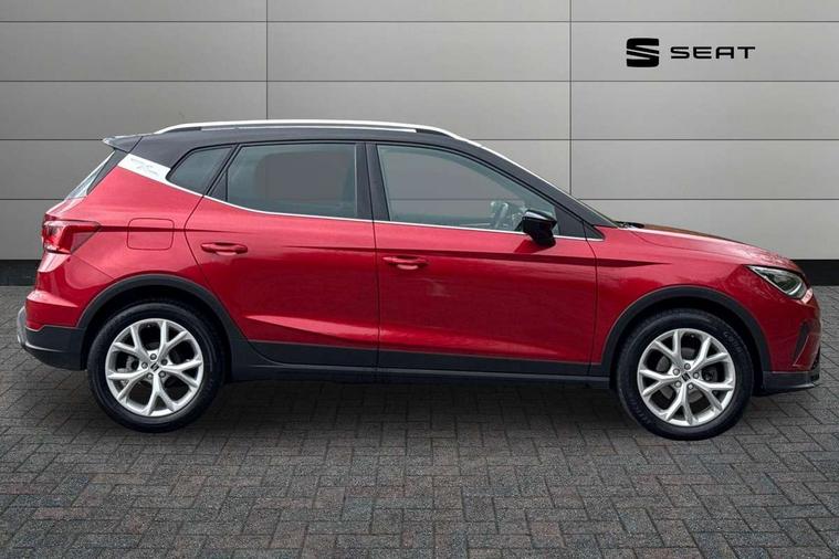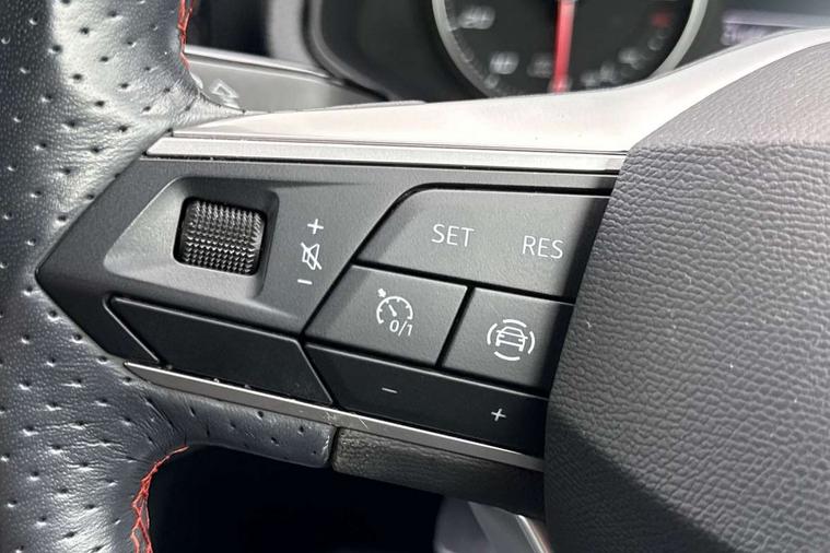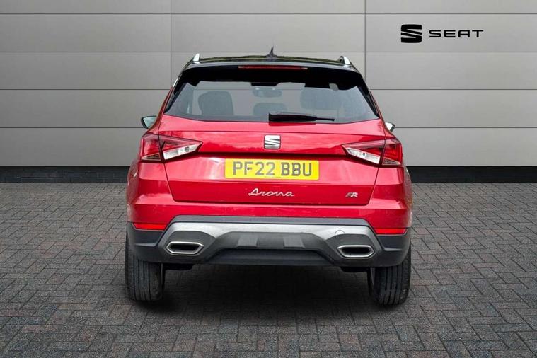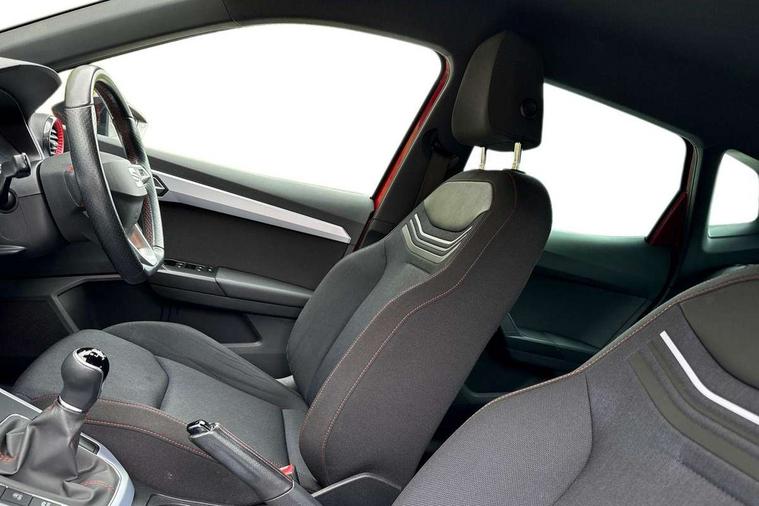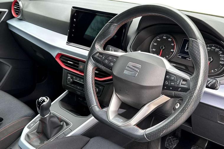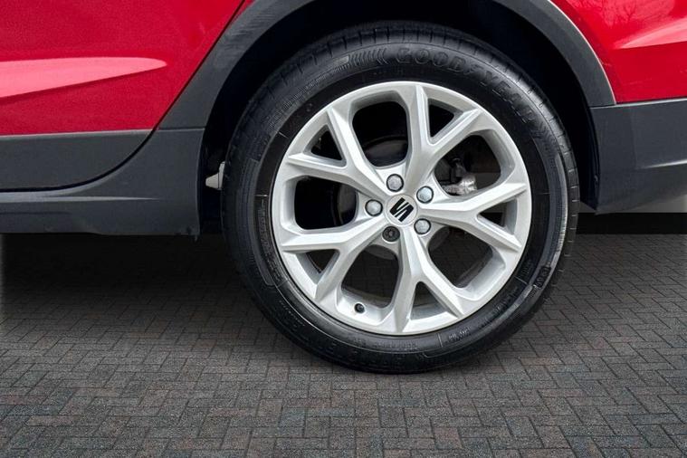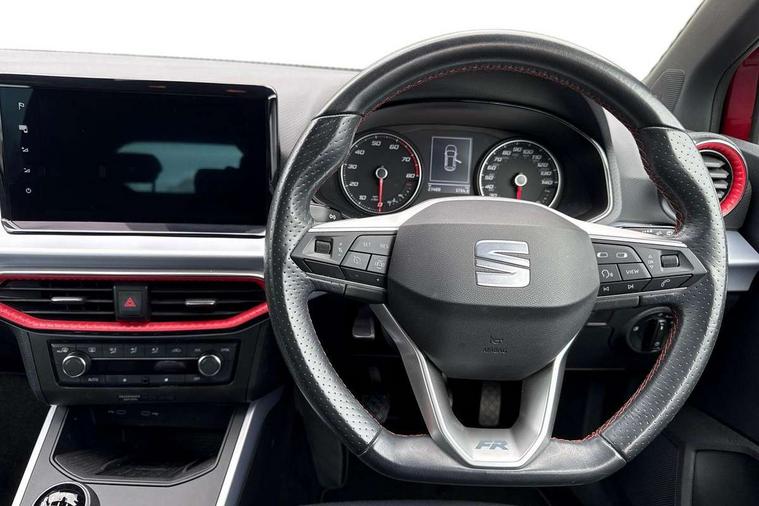 'Lights On' Reminder warning buzzer, 8" Digital cockpit, Digital clock, E-call, Electric speed sensitive power steering, Full Link Smartphone Integration with Mirror Link, Apple Car Play, Google Android Auto with USB Type C cable for Apple and Android compatibility, Lane keeping system, Low fuel warning light, Outside temperature display, Rear parking sensor, RPM counter, Seat connect with safety, service, remote and online, SEAT Drive profile - Four different models normal-sport-eco-individual, steering response, throttle response, Trip computer, Bluetooth interface for hands free and audio streaming, DAB digital radio and AM/FM radio, Steering wheel mounted audio controls, Anti theft roof antenna, Auto dimming interior rear view mirror, Automatic activation of hazard warning lights, Body coloured bumpers, Body coloured door handle inserts, Chrome roof rails and window surrounds, Dark tinted rear windows, Electric front/rear windows, Electrically adjustable, heated and folding door mirrors, Front fog lights with cornering function and rear fog light, FULL LED automatic headlights with dynamic headlight range control, coming and leaving home, LED daytime running lights, LED rear tail lights and licence plate lights, Protective side mouldings, Rain sensing wipers, Rear side wing doors, Rear spoiler, Rear window wash/wipe, Roof colour door mirrors, Third brake light, Twin exhaust pipe styling hidden exhaust pipe, Visible VIN plate, Windshield wiper with intermittent control and potentiometer, 2 cupholders, 3 seat bench in 2nd row, 60/40 split folding rear seat, Aircare filter, Black interior roof, Cloth upholstery, Double boot floor, Driver sunvisor with covered mirror + card holder, Dual zone climate control, Front courtesy light with 2x front and 2x rear reading lights, Front sport seats, Gear shift indicator, Height adjustable front seats, Height/reach adjustable steering column, Illuminated boot, Instrument lighting with brightness control, Interior ambient lighting, Interior light in footwell, central console and door panel, ISOFIX points in outer rear seats with top tether anchorage points, Passenger sunvisor with vanity mirror, Perforated flat bottomed leather steering wheel/gear knob/handbrake with red stitching and FR logo, Single front passenger seat, Two front and three rear height adjustable headrests, Connectivity pack plus - Arona, Interior chrome pack - Arona, 3 point seatbelts on all rear seats, ABS, Active front headrests, Child locks on rear doors, Driver and front passenger airbags with front passenger airbag de activation, front side and curtain airbags, Electronic stability control, Emergency Brake Assist (EBA) and front assist, Front and rear seatbelt reminder, Hill hold control, Multi-Collision braking, Tiredness recognition system, Traction control, Tyre pressure monitoring system, Alarm with back-up horn, Electronic engine immobiliser, Locking wheel bolts, Remote central locking + deadlocks, Tow away protection, Titan black dashboard, 17" Dynamic alloy wheels,