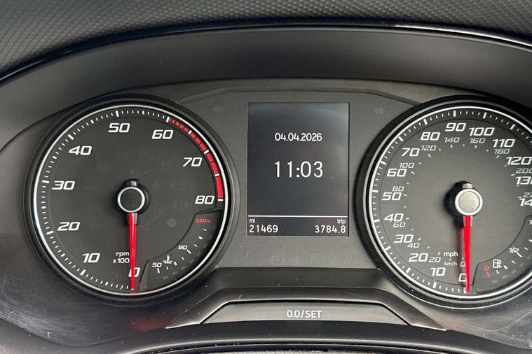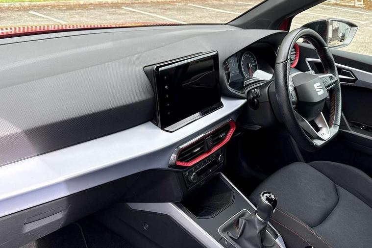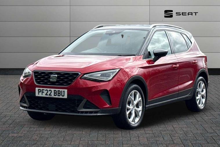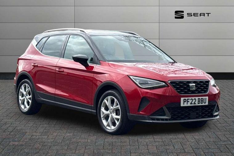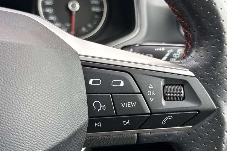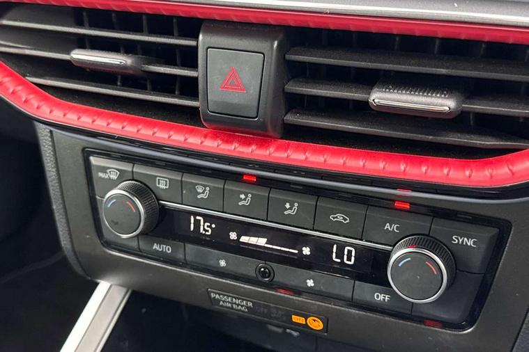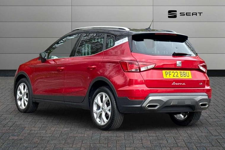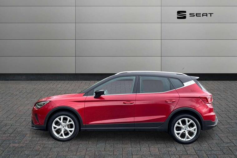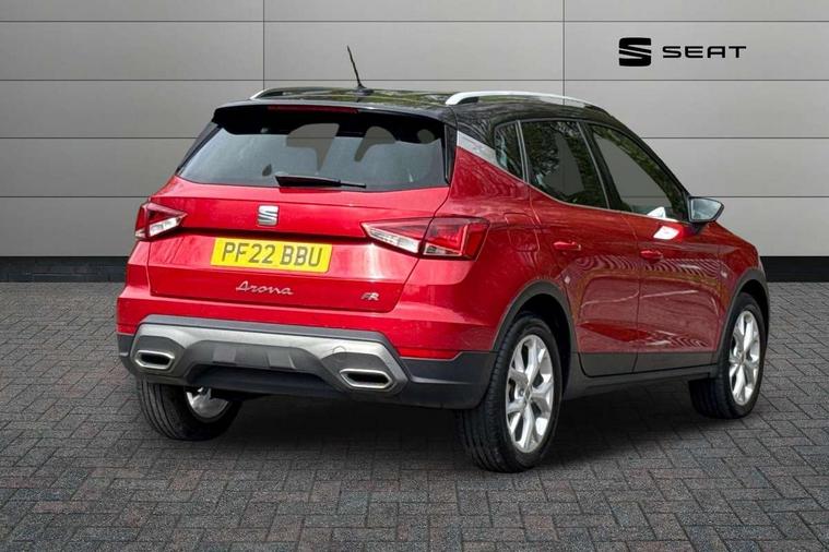 'Lights On' Reminder warning buzzer, 8" Digital cockpit, Digital clock, E-call, Electric speed sensitive power steering, Full Link Smartphone Integration with Mirror Link, Apple Car Play, Google Android Auto with USB Type C cable for Apple and Android compatibility, Lane keeping system, Low fuel warning light, Outside temperature display, Rear parking sensor, RPM counter, Seat connect with safety, service, remote and online, SEAT Drive profile - Four different models normal-sport-eco-individual, steering response, throttle response, Trip computer, Bluetooth interface for hands free and audio streaming, DAB digital radio and AM/FM radio, Steering wheel mounted audio controls, Anti theft roof antenna, Auto dimming interior rear view mirror, Automatic activation of hazard warning lights, Body coloured bumpers, Body coloured door handle inserts, Chrome roof rails and window surrounds, Dark tinted rear windows, Electric front/rear windows, Electrically adjustable, heated and folding door mirrors, Front fog lights with cornering function and rear fog light, FULL LED automatic headlights with dynamic headlight range control, coming and leaving home, LED daytime running lights, LED rear tail lights and licence plate lights, Protective side mouldings, Rain sensing wipers, Rear side wing doors, Rear spoiler, Rear window wash/wipe, Roof colour door mirrors, Third brake light, Twin exhaust pipe styling hidden exhaust pipe, Visible VIN plate, Windshield wiper with intermittent control and potentiometer, 2 cupholders, 3 seat bench in 2nd row, 60/40 split folding rear seat, Aircare filter, Black interior roof, Cloth upholstery, Double boot floor, Driver sunvisor with covered mirror + card holder, Dual zone climate control, Front courtesy light with 2x front and 2x rear reading lights, Front sport seats, Gear shift indicator, Height adjustable front seats, Height/reach adjustable steering column, Illuminated boot, Instrument lighting with brightness control, Interior ambient lighting, Interior light in footwell, central console and door panel, ISOFIX points in outer rear seats with top tether anchorage points, Passenger sunvisor with vanity mirror, Perforated flat bottomed leather steering wheel/gear knob/handbrake with red stitching and FR logo, Single front passenger seat, Two front and three rear height adjustable headrests, Connectivity pack plus - Arona, Interior chrome pack - Arona, 3 point seatbelts on all rear seats, ABS, Active front headrests, Child locks on rear doors, Driver and front passenger airbags with front passenger airbag de activation, front side and curtain airbags, Electronic stability control, Emergency Brake Assist (EBA) and front assist, Front and rear seatbelt reminder, Hill hold control, Multi-Collision braking, Tiredness recognition system, Traction control, Tyre pressure monitoring system, Alarm with back-up horn, Electronic engine immobiliser, Locking wheel bolts, Remote central locking + deadlocks, Tow away protection, Titan black dashboard, 17" Dynamic alloy wheels,