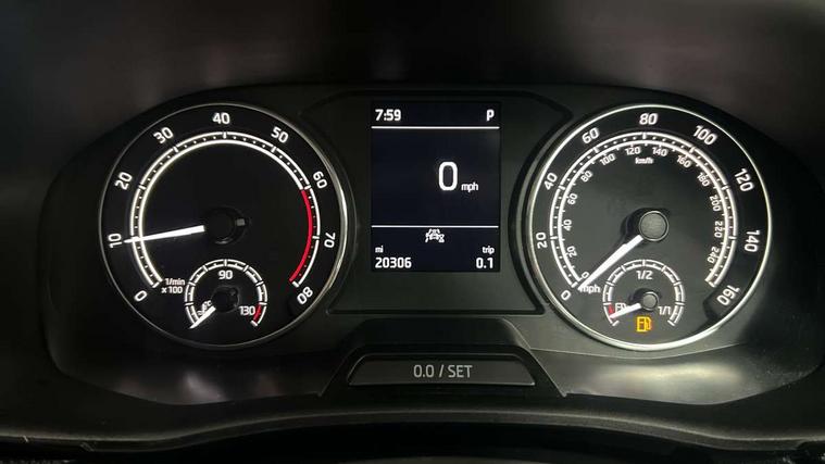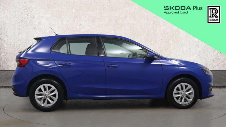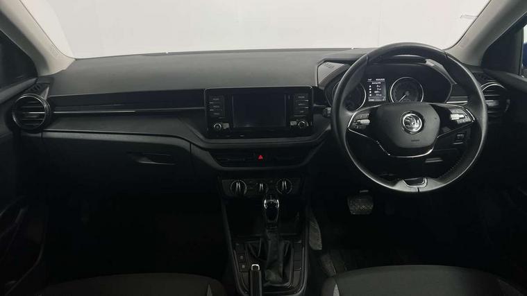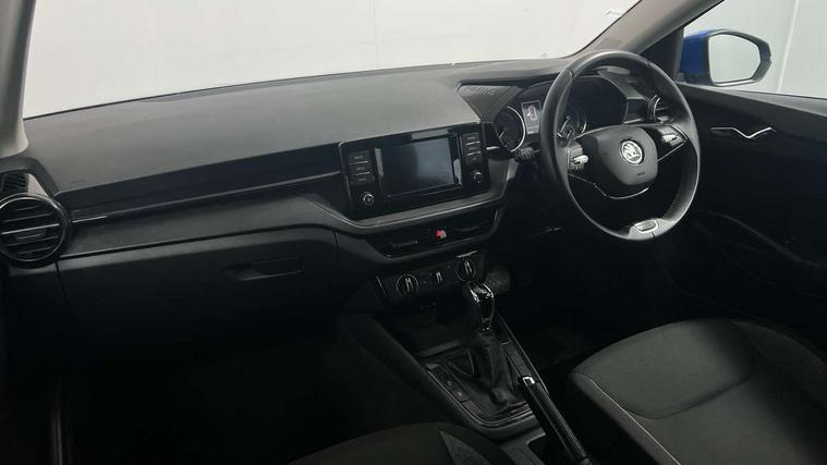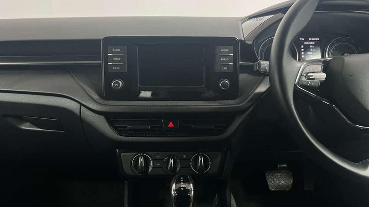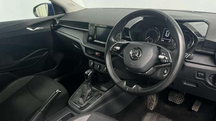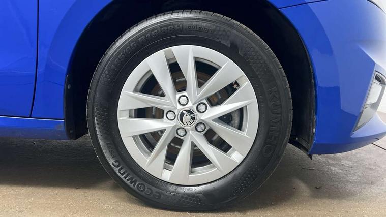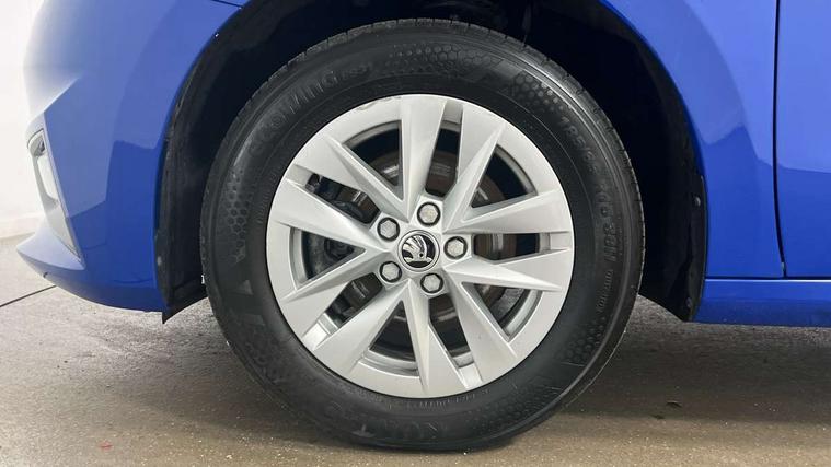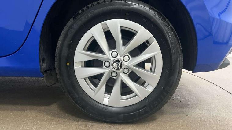 Bluetooth connection, Driver alert system - DAS, Electromechanical power steering, Exterior temperature gauge, Lane assist including road edge detection, Multifunction trip computer in black and white, Rear parking sensors, Service interval indicator, Speed limiter, 2x USB-C in the front (for data transmission and charging), 4 speakers in front, Auxiliary socket for external MP3 player, DAB digital radio reception, Radio Swing with 6.5" colour display, Basic LED Headlights, Basic rear lights, Body colour door mirrors, Body coloured bumpers, Dimming rear view mirror with black frame, Door mirror integrated indicators, Electrically adjustable and heated door mirrors, Electrically adjustable front windows with function auto up/down, Front fog lights, Front window wiper intermittent control, Headlight range control - Automatic, Ice scraper in fuel cap, LED daytime running lights with coming and leaving home feature, Mechanical adjustable rear windows, Rain sensor, Rear LED fog light, Rear side wing doors, Rear window wiper with washing nozzles, Roof mounted spoiler, SKODA tailgate lettering in chrome, Third brake light, 2 reading lights in front and 2 reading lights in rear, 2 spoke leather multifunction steering wheel, 3 rear headrests, Backrest split and folding, Central console with fixed cup holder and storage box, Chrome handbrake release button, Fabric upholstery, Gearshift knob/handle in leather, Grain satin black interior door handles, Hand brake lever handle in leather, Height adjustable front headrests, Height adjustable front seats, Height adjustable steering wheel, ISOFIX and TopTether anchorage points to the outer rear seats, ISOFIX and TopTether on the front passenger seat, Luggage compartment lighting, Manual air conditioning, Manually adjustable lumbar support in front seats, Pollen filter, Rear seat bench unsplit, Single front passenger seat, Storm grey headlining, Sun visors with mirror and airbag label on passenger side, Ticket holder, 3-point height adjustable front seats belts with pretensioner and force limiter, Automatic warning lights in case of crash, Driver and passengers airbag with switch off function, e-Call+, ESC including ABS, MSR, ASR, EDS, HBA and XDS, Front and rear seat belt warning, FRONT ASSIST (AEB City and AEB Inter Urban), Front side airbags, Head airbags, Hill hold assist, One tone horn, Pedestrian protection, Three rear 3-points safety seat belts with pretensioner and force limiter including stop function for outer rear seat belts, Tyre pressure monitoring system, Anti-theft alarm system including immobiliser, interior monitoring, backup horn, and towing protection, Central locking with radio remote control, interior controls, SAFE function and 2 foldable keys, Black painted air vents, Glossy black decorative trim, Grain satin black central console cover, Grain satin black lower decorative trim, Satin black door and side trim panel in front, Anti-theft wheel bolts protection, Super-low rolling resistance tyres,