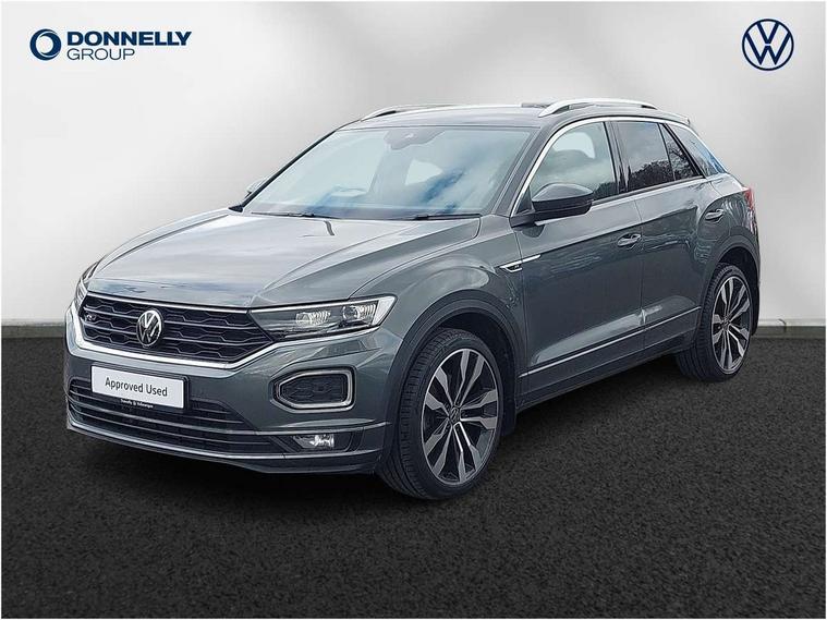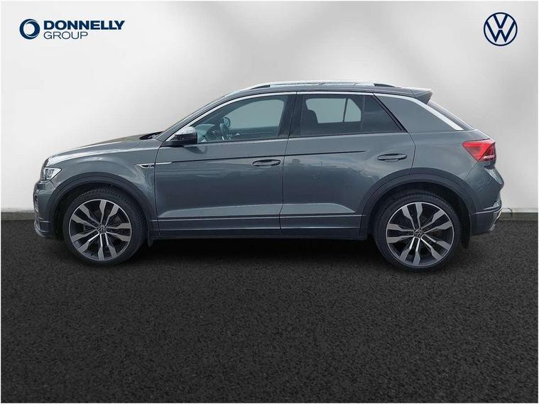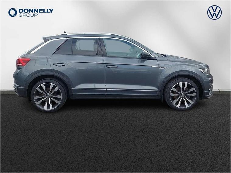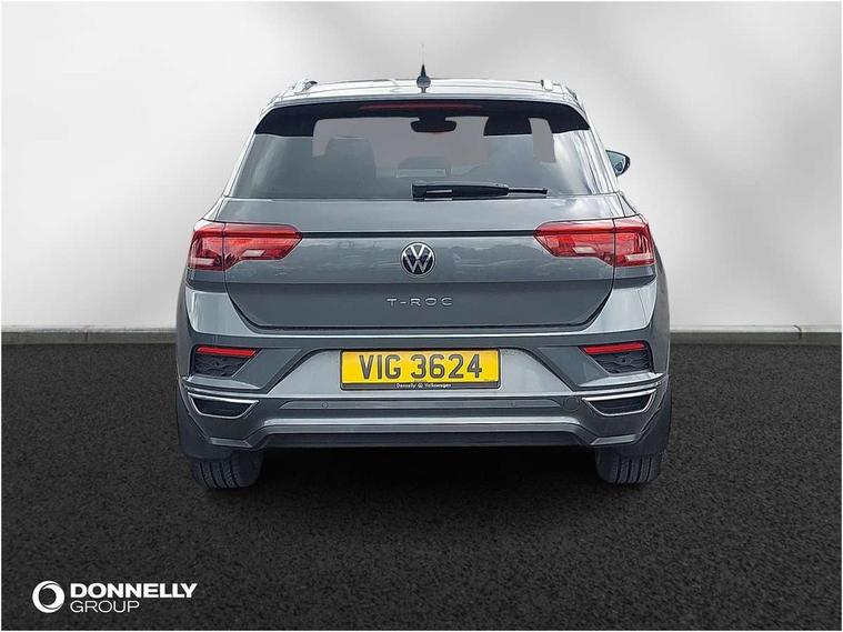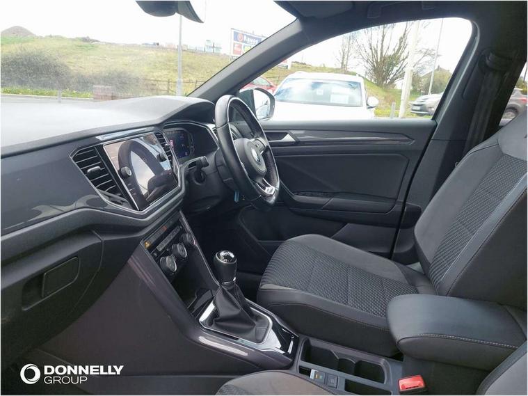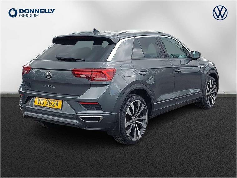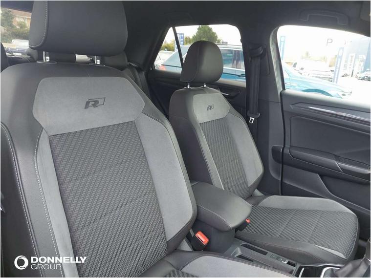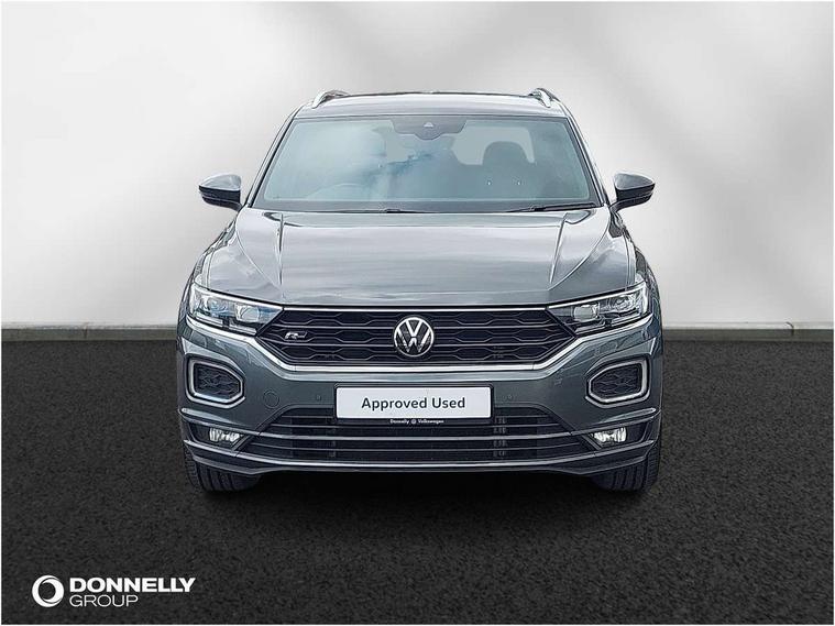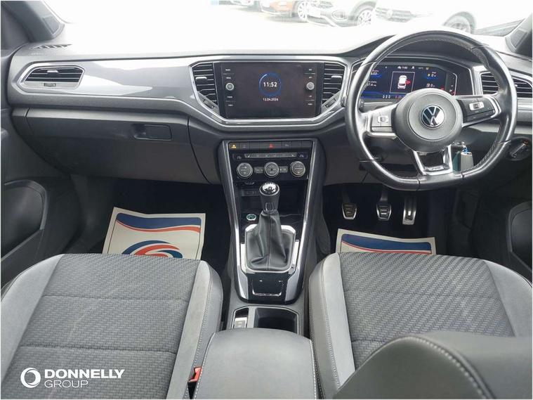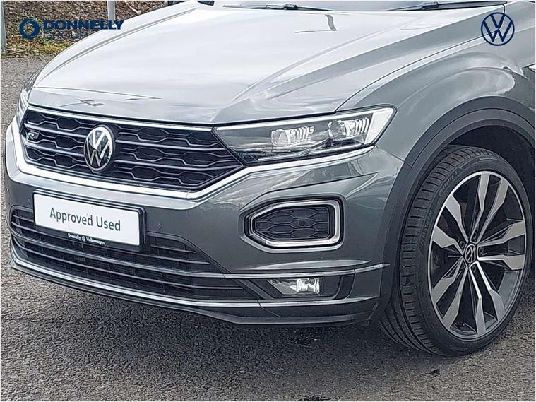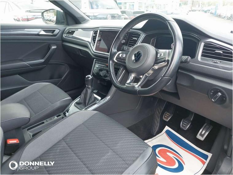 'Lights On' Reminder warning buzzer, Adaptive cruise control with front assist, radar sensor controlled distance monitoring, city emergency braking, Automatic start/stop system, Bluetooth telephone and audio connection for compatible devices, Car information display, Digital Cockpit Pro - Active info display, Discover navigation including 8" touch screen display, streaming and internet, Driver alert system with audible and visual fatigue detection system, Driver tips and journey analysis, Lane assist with warning text instrument cluster, Modified key software - reduce switch off time for key status change to Long no motion, Multifunction computer with visual gear change recommendation for fuel consumption, Service interval indicator, Think blue trainer driver tips and journey analysis, Voice activation, Wireless app connect for apple carPlay, Battery regeneration during braking, Centre arm rest including USB type C interface and USB charging socket, DAB Digital radio, Diversity antenna for FM reception, Front USB type C Interface 2X and USB charging socket, Music playback - MP3, WMA and AAC files, Premium USB cable in choice of either Apple or Android smartphone compatibility, SD card slot, Simultaneous pairing of 2 compatible mobile devices, SMS functionality - read, compose and send SMS messages using touch-screen display, Storage compartment with longitudinal and height adjustable in armrest and two rear air vents, Three route options - Fast, Short, Eco, Title and cover art display, Auto dimming interior rear view mirror, Automatic hazard lights activation under emergency braking, Black grained lower door protectors, Body colour door handles, Body colour rear roof spoiler, Chrome effect left and right trapezoid exhaust tailpipe fascia surround, Chrome trim on upper and lower radiator grille, Dusk sensor, Electrically foldable, adjustable and heated door mirrors with puddle lights and reverse activated kerb-view adjustment on passenger's door mirror, Front and rear electric windows, Front fog lights with static cornering function, Front windscreen wiper with intermittent wipe and 4 position delay, Fully galvanised body, Heated rear window, High level 3rd brake light, LED darkened rear light clusters, LED dipped and main beam headlights with automatic range adjustment including signature LED daytime running lights, LED rear number plate lights, Manual coming/automatic leaving home lighting function, Rain sensor, Rear tinted glass from B-pillar backwards approx 65% tinted, Rear wash/wipe with intermittent wipe setting, Volkswagen roundel, 2 Front and rear reading lights incorporating LED technology, 3 rear head restraints, 4 load lashing points in luggage compartment, Aluminium pedals, Ambient lighting in front footwell and light strips below trim in front doors, Black roof lining and sun visors, Branded points of interest, Carbon flag cloth upholstery, Climate control - 2 zone electronic air conditioning with automatic air recirculation and allergy filter, Drawer under drivers seat, Front + rear carpet mats, Front cupholders x 2, Front seat back storage pockets, Front sports seats with R-Line logo on seat backrest, Glovebox, Height adjustable front seats, Height/reach adjust steering wheel, Illuminated vanity mirrors, Instrument lighting, white adjustable panel illumination, Interior light delay, Isofix easy fit child seat preparation for 2 outer rear seats, Load through provision with single cup holder when folded down, Luggage compartment cover, removable, Luggage compartment lighting, R Line badge, Split folding rear seat backrests with centre armrest, Storage compartment in left and right luggage area, Storage compartment in rear doors, Storage compartments in driver and front passenger doors, Three spoke multi-function leather trimmed steering wheel and gearknob, Unique R Line door sill protectors, R line styling pack - T-Roc, Winter pack - T-Roc, 3 rear three point seatbelts, ABS, Curtain airbags, Driver and front passenger safety-optimised head restraints, Drivers and front passengers airbags with passengers deactivation switch, Drivers seatbelt reminder, Electronic parking brake with auto hold, Electronic stability control (ESC) includes ASR, EDL, EDTC and trailer stabilisation function, Front seat side impact airbags, Predictive pedestrian protection, Rigid safety cell with front and rear crumple zones, Three point height adjust front seatbelts + pretensioners, Tyre pressure loss indicator, Ventilated front and rear disc brakes, Volkswagen roadside assistance, Alarm with remote central locking and interior protection, Electronic engine immobiliser, Remote central locking with 2 remote folding keys, Shadow grey decorative inserts in dash and door panel, 19" Suzuka alloy wheels with low rolling resistance tyres and anti wheel bolts,