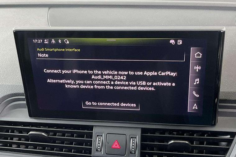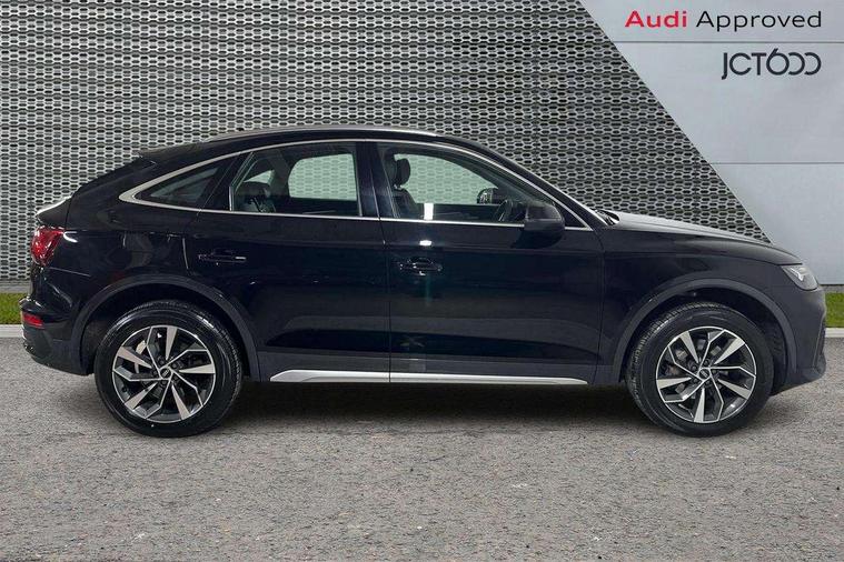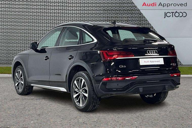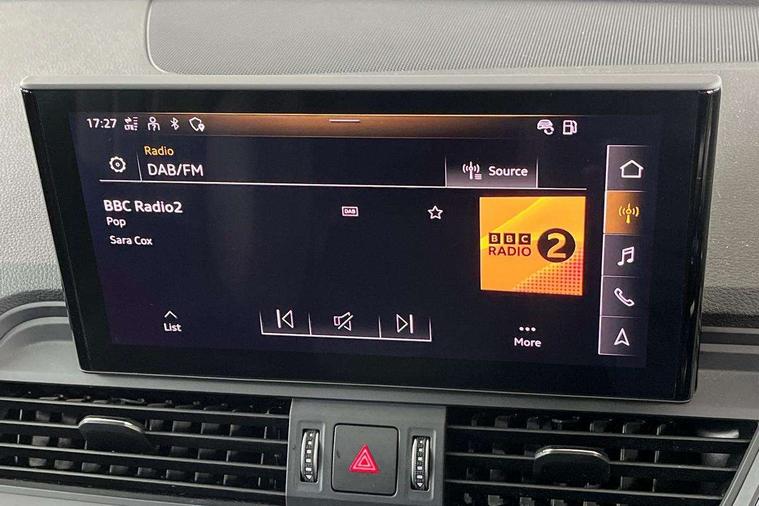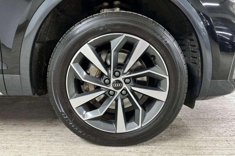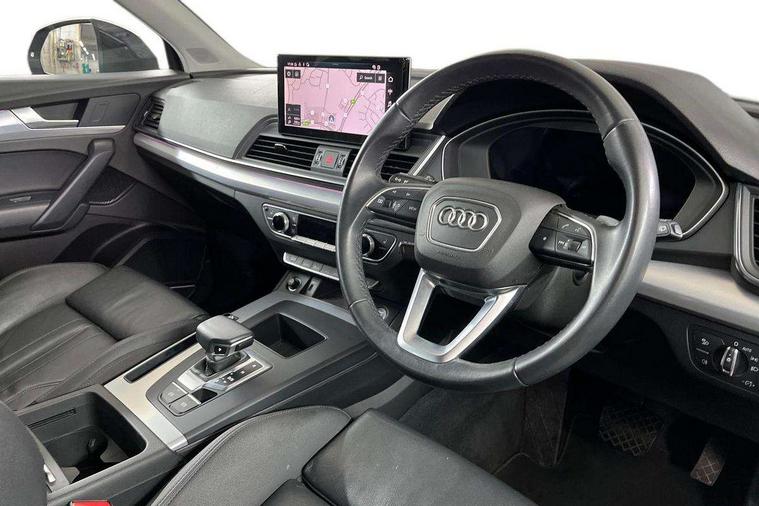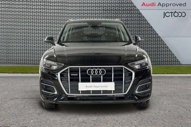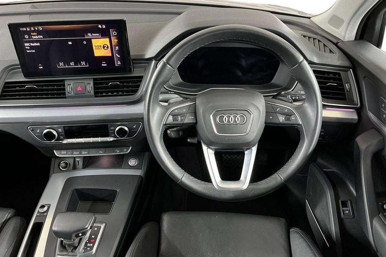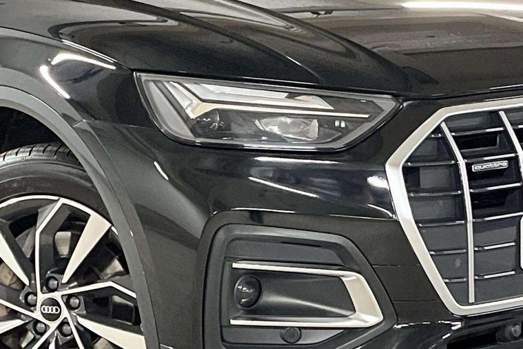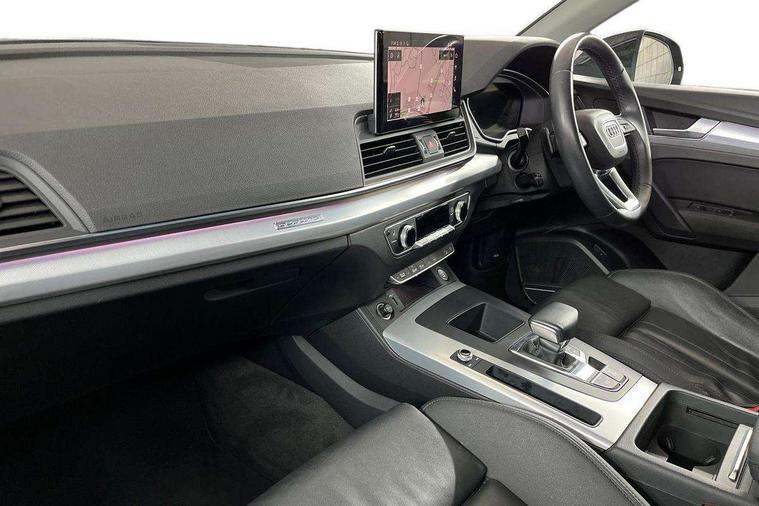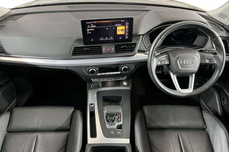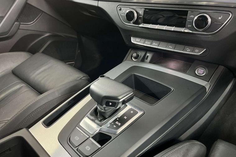 Acoustic front and rear parking sensor, Audi connect safety and service (e-call), Audi drive select, Audi virtual cockpit plus with 12.3" screen and three different layout designs, Audi wireless smartphone interface, Automatic start-stop system with coasting functionality and efficiency programme, Bluetooth interface, Cruise control + speed limiter, Electro - mechanical power assisted steering, MMI navigation plus with 10.1" touch screen, Power tailgate, Reversing camera, Service interval indicator, Voice control system with Audi hotword activation "Hey Audi", Dynamic suspension, Quattro on demand, 2 x USB charging port with aux input socket, DAB Digital radio, Acoustic windscreen, Air inlets in matt titanium black with blades in matt aluminium silver, Aluminium roof rails, Auto dimming rear view mirror, Automatic headlights and windscreen wipers, Body colour door mirrors, Chrome plated exhaust trims, Door sills in Selenite silver, Electric adjustable/heated/folding door mirrors, Front and rear electric windows, LED headlights and LED tail lights, Lower bumpers painted in contrast Manhattan grey, Matt selenite silver underbody protection, Matt twilight grey radiator grille with chrome vertical struts, Rear chrome trim strip below lights, Rear diffuser strip in selenite silver, Rear spoiler, Rear wiper, Roof bars, 3 rear headrests, 3 spoke multifunction leather steering wheel with shift paddles, 40:20:40 split folding rear seat with rear centre armrest, Deluxe 3 zone electronic climate control, Door sills trims with aluminium inlays, Front head restraints, Front/rear floor mats, Heated front seats, Height/reach adjustable steering column, ISOFIX child seat mounting and top tether, Manual seat adjustment with 4-way electric lumbar support, Removable luggage compartment floor, Silver cloth headlining, Sunvisors with vanity mirrors, Trunk roller cover, Twin leather upholstery + front sports seats, High gloss pack - Q5, LED interior light pack - Q5, 3 point seatbelts on all seats, 6 airbags - Driver, front passenger, curtain and side airbags, Electrically operated child locks on rear doors, Electromechanical parking brake, Electronic stabilisation control including ABS, ASR and EDL, Front passenger airbag deactivation, Hill descent control, Hill hold assist, Multi collision brake assist, Pop-up bonnet for pedestrian protection, Pre sense city, Seat belt force limiter, Seatbelt monitoring, Tyre pressure warning, Warning triangle and first aid kit, Anti theft alarm, Anti-theft wheel bolts, Keyless Go access/ignition system, Aluminium rhombus inlay,