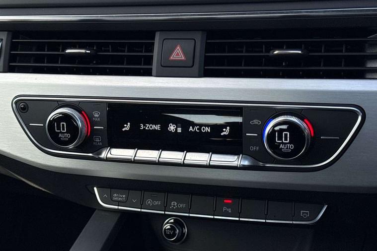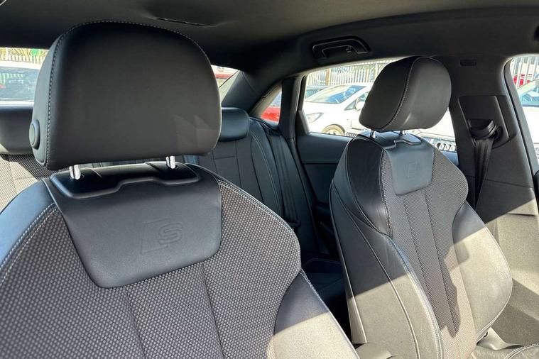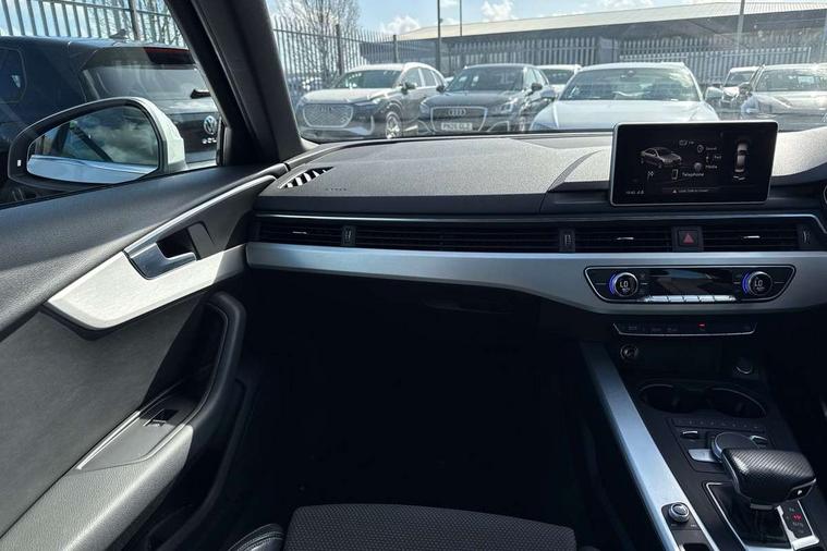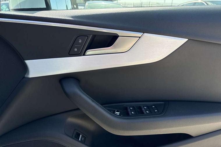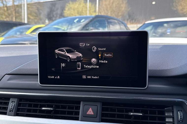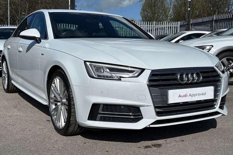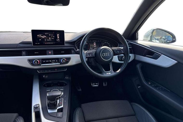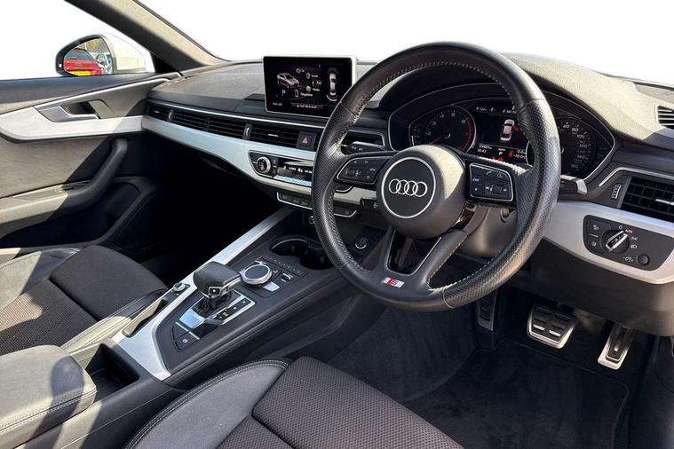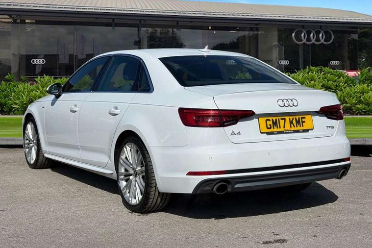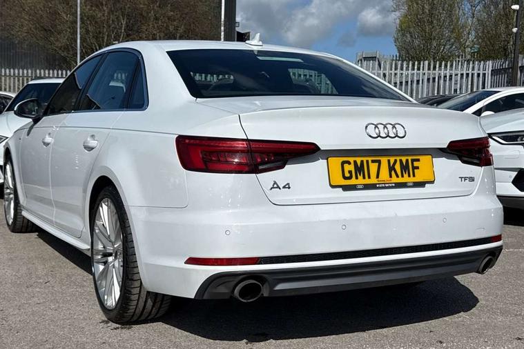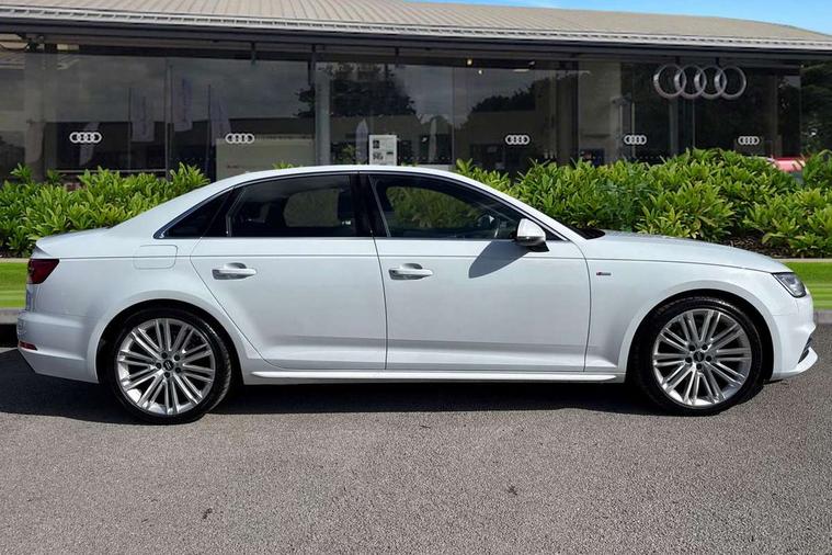 Audi drive select, Audi Pre sense collision avoidance, Audi smartphone interface, Auto boot lid opening, Electro-mechanical PAS, Service interval indicator, Stop/start button, Voice control system, 2 USB ports, Aux input, DAB digital radio module, MMI radio plus with CD player, Acoustic windscreen, Air inlets in titan black with two horizontal inlays in chrome, Auto dimming rear view mirror, Automatic headlights + automatic windscreen wipers, Body colour bumpers, Chrome door handles, Chrome rolled exhaust, Electric adjustable heated door mirrors, Electric front windows, Electric rear windows, Headlight range control, LED daytime running lights, LED indicators in door mirrors, Rear diffuser in Twilight grey matt, Roof spoiler, 3 zone climate control, Black cloth headlining, Front centre armrest with 12v socket, Front sport seats, Front/rear floor mats, Gearshift paddles, Illuminated door sill finishers, Isofix child seat preparation for front passenger/outer rear seats inc passenger airbag deactivation, Jack and tool kit, Perforated leather gearknob, Reach + rake adjustable steering column, Rear headrests, Split folding rear seats, Stainless steel foot rest, Stainless steel pedals, Sunvisors with vanity mirrors, Top tether anchor plate for isofix child seat, S line exterior styling pack - A4 Saloon, 3 point seatbelts on all rear seats, ABS/EBD, Adaptive driver and front passenger airbags, Electromechanical parking brake, ESP, First aid kit, Front head airbags, Front seatbelt pretensioners + load limiters, Front side airbags, Multi-Collision braking, Seatbelt warning, Traction control, Tyre pressure monitoring system, Warning triangle, Keyless start, Locking wheel bolts, Remote central locking, Thatcham category 1 alarm + immobiliser,