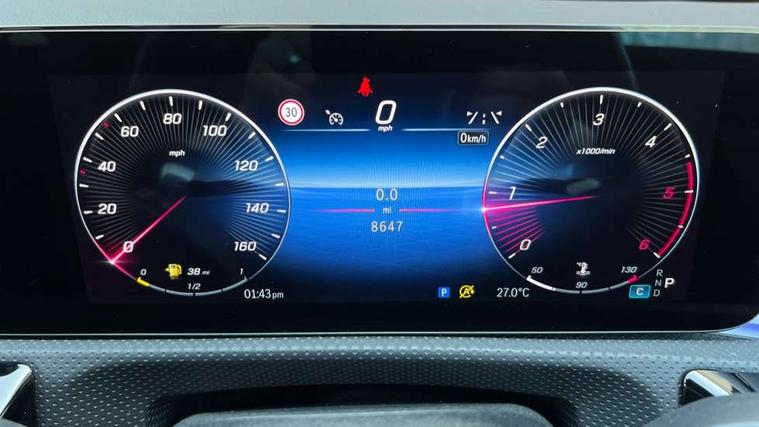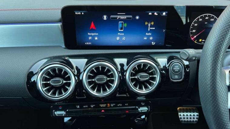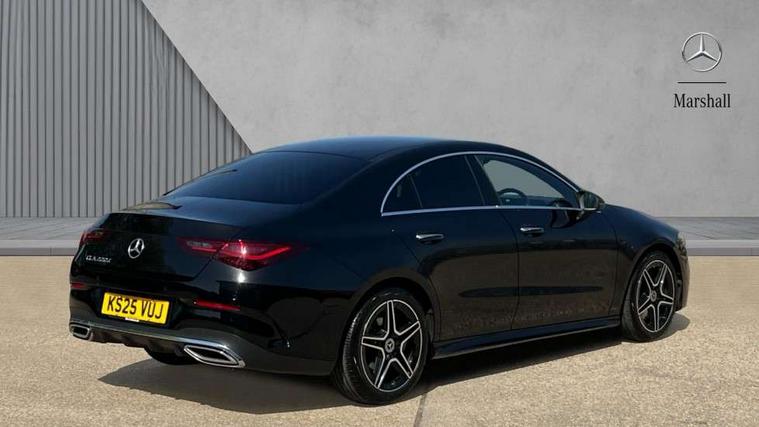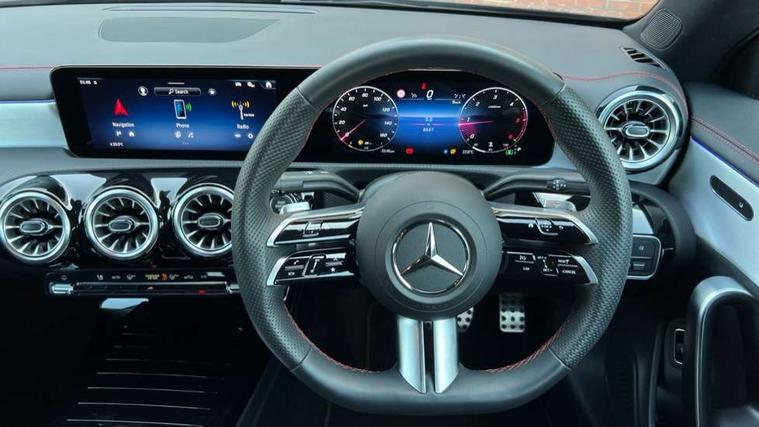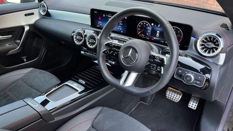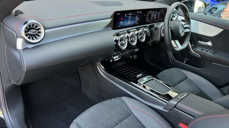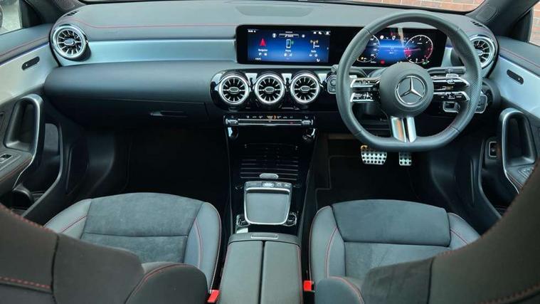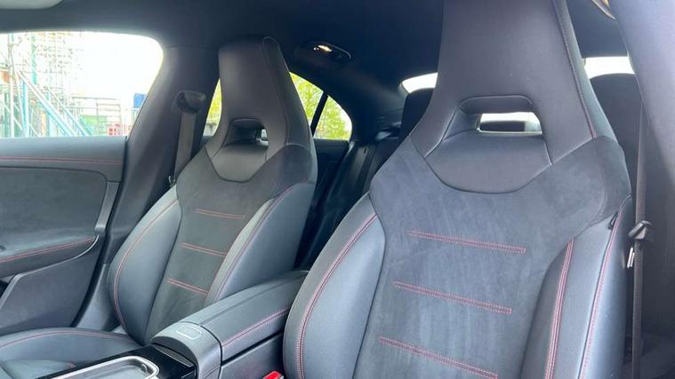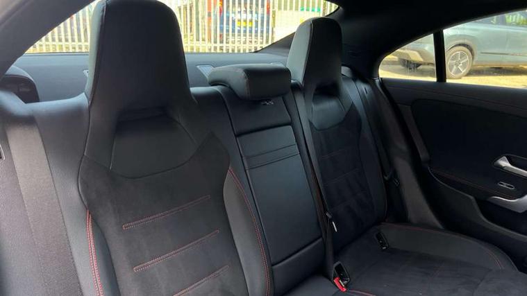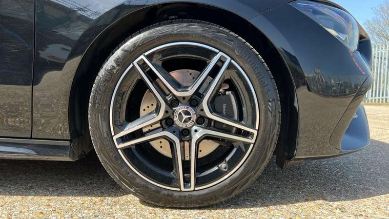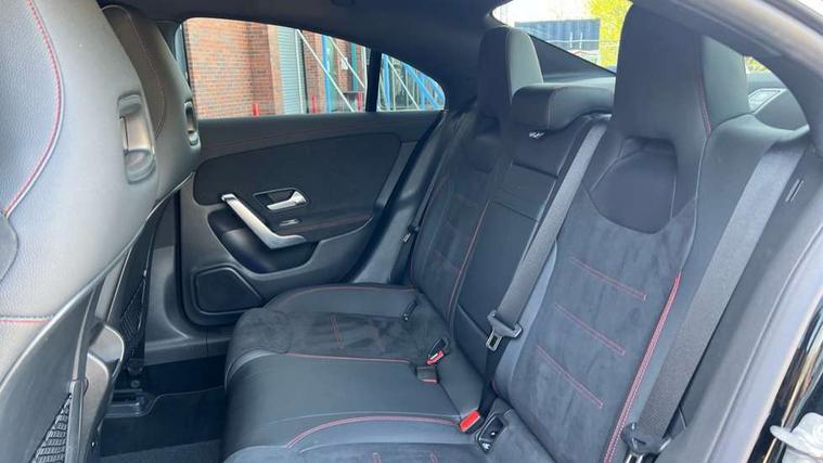 10.25 inch Instrument display with digital cockpit, 10.25 inch touchscreen central media display, Active lane keeping assist, Attention assist - Monitors steering behaviour and long journey fatigue, Blind spot assist, Bluetooth connection, Car wash mode, Cruise control with limiter, Direct steer system, DYNAMIC SELECT with a choice of driving modes (ECO, Comfort, Sport and Individual), ECO start/stop function, Fingerprint sensor, Fluid level warning indicator for fuel, oil, coolant and washer fluid, Hard-disk navigation, Hey Mercedes Voice activation, Lamp failure indicator, Mercedes me connect including emergency call system, accident recovery, breakdown and maintenance management, Mercedes me remote services, Outside temperature gauge, Owners manual in English, Pre-installation of private car share, Radio aerial integrated into front and rear windshields, Service indicator (ASSYST), Smartphone integration with Apple CarPlay and Android auto, Speed limit assist, Trip computer in multifunction display with current consumption indicator, Wireless charging in the front centre console, Comfort suspension with ride height lowering, Rear axle multi-link, DAB digital radio tuner, MBUX multimedia system, Mercedes Benz sound system (100 W) with 6 speakers, Pre installation for Mercedes Benz Link, Adaptive brake lights, AMG body styling with AMG front apron and rear apron and visible exhaust tailpipe in chrome trim elements, Body colour door handles, Electric windows, Electrically adjustable and heated door mirrors with integrated LED indicators, Exhaust system with 2 Visible tailpipe trim elements and rear apron with trim in chrome, Hand free access, Headlamp assist automatic headlamp activation, Heated glass rear windscreen + timer control, High gloss aluminium beltline strips, High level LED third brake light, Interior mirror with black reading lamps and frameless, LED high performance headlamps with integrated LED daytime running lights and adaptive highbeam assist, LED tail lamp, Privacy glass with dark tinting on rear side windows and rear window, Radiator grille with Mercedes-Benz pattern in chrome and central Mercedes star, single louvre in high-gloss black with chrome inserts, Rain sensing windscreen wipers with two sensitivity settings, Rear boot, Rear fog lamp, Rear side wing doors, Variable front intermittent wipers, Window line trim strip in high gloss aluminium, 3 seat bench in 2nd row, 3 twin spoke flattened multifunction steering wheel in nappa leather - horizontal twin spoke in high gloss black, vertical twin spoke in silver chrome, 4 way lumbar support, 40:20:40 split folding rear seat backrests, Air conditioning - One zone THERMATIC automatic climate control with automatically controlled air distribution, Air vents with surround in silver chrome, Artico man-made leather/Microcut microfibre upholstery, Automatic child seat recognition sensor, Black roof lining, Brushed stainless steel sports pedals with rubber studs, Floor mats with stitched AMG lettering, Fluorescent jacket, Front centre armrest with stowage, Galvanished gear shift paddles in silver chrome, Heated front seats, Interior lighting - 64 colour Ambient lighting, Luggage net on driver/front passenger seat backrest, Manually height and reach adjustable steering column, Rear head restraints, Single front passenger seat, Sport seats with fixed head restraints, Stowage compartment in centre console with retractable cover, Sunvisors with illuminated vanity mirrors, Twin front cupholders, Two outer rear seat isofix and top tether child seat fixing points, Keyless go comfort pack - CLA, Light and sight pack - CLA, Mirror pack - CLA, Parking pack with reversing camera - CLA, Seat comfort pack - CLA, USB package plus - CLA, Active bonnet pedestrain safety measure which detects an impact and raises bonnet by 65mm, Active brake assist includes forward collision warning system with autonomous braking, Adaptive brake assist with hold function and hill start assist, Anti lock braking system (ABS) with brake assist, Black seat belts, Bonnet with power domes, Brake calipers with Mercedes-Benz lettering, Brake pad wear warning indicator, Childproof locks manually operated for rear doors and electrically operated for rear power windows, Crash responsive emergency lighting, Driver and front passenger head and sidebags, Driver and front passenger windowbags, Drivers knee airbag, Dual stage driver and front passenger airbags, Electric parking brake, Electronic stability programme with acceleration skid control, ESP curve dynamic assist, Front and rear seatbelt reminder, Front passenger seat occupancy sensor, Perforated front brake discs, Sports braking system, Three point rear seat belts, Tyre pressure monitoring system, Warning triangle and first aid kit, Alarm system with immobiliser and interior protection -Thatcham category 1, Guard 360 deg vehicle protection - tow away protection with visual, acoustic warning, interior monitoring, preinstallation for parking damage, Remote central locking and crash sensor with emergency opening function, Light aluminium with longitudinal grain interior trim, 18" AMG 5 twin spoke light alloy wheels painted in termolite grey with high sheen finish, Summer tyres, Tirefit tyre sealant kit,
