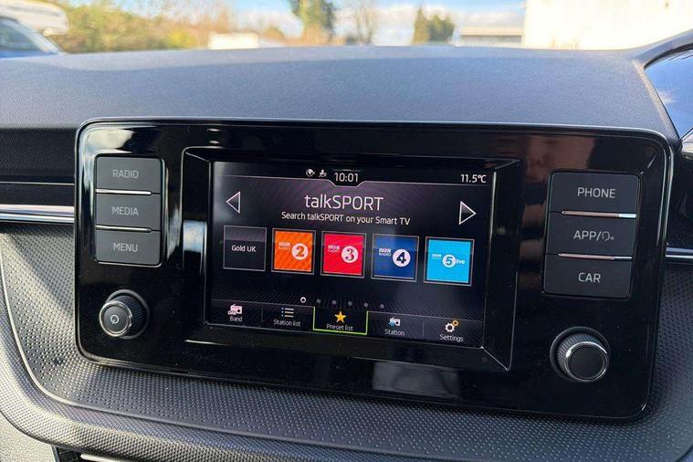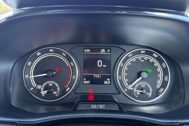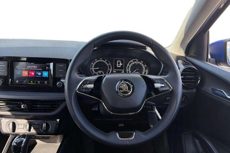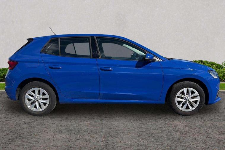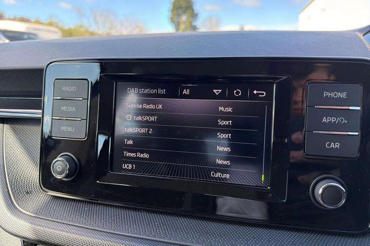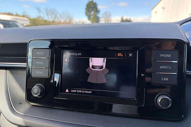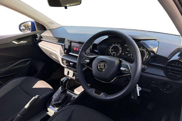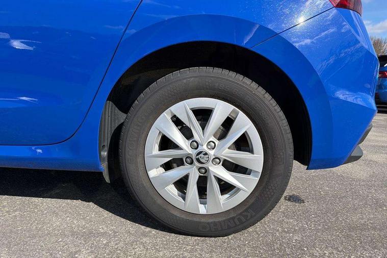 Bluetooth connection, Driver alert system - DAS, Electromechanical power steering, Exterior temperature gauge, Lane assist including road edge detection, Multifunction trip computer in black and white, Rear parking sensors, Service interval indicator, Speed limiter, 2x USB-C in the front (for data transmission and charging), 4 speakers in front, Auxiliary socket for external MP3 player, DAB digital radio reception, Radio Swing with 6.5" colour display, Basic LED Headlights, Basic rear lights, Body colour door mirrors, Body coloured bumpers, Dimming rear view mirror with black frame, Door mirror integrated indicators, Electrically adjustable and heated door mirrors, Electrically adjustable front windows with function auto up/down, Front fog lights, Front window wiper intermittent control, Headlight range control - Automatic, Ice scraper in fuel cap, LED daytime running lights with coming and leaving home feature, Mechanical adjustable rear windows, Rain sensor, Rear LED fog light, Rear side wing doors, Rear window wiper with washing nozzles, Roof mounted spoiler, SKODA tailgate lettering in chrome, Third brake light, 2 reading lights in front and 2 reading lights in rear, 2 spoke leather multifunction steering wheel, 3 rear headrests, Backrest split and folding, Central console with fixed cup holder and storage box, Chrome handbrake release button, Fabric upholstery, Gearshift knob/handle in leather, Grain satin black interior door handles, Hand brake lever handle in leather, Height adjustable front headrests, Height adjustable front seats, Height adjustable steering wheel, ISOFIX and TopTether anchorage points to the outer rear seats, ISOFIX and TopTether on the front passenger seat, Luggage compartment lighting, Manual air conditioning, Manually adjustable lumbar support in front seats, Pollen filter, Rear seat bench unsplit, Single front passenger seat, Storm grey headlining, Sun visors with mirror and airbag label on passenger side, Ticket holder, 3-point height adjustable front seats belts with pretensioner and force limiter, Automatic warning lights in case of crash, Driver and passengers airbag with switch off function, e-Call+, ESC including ABS, MSR, ASR, EDS, HBA and XDS, Front and rear seat belt warning, FRONT ASSIST (AEB City and AEB Inter Urban), Front side airbags, Head airbags, Hill hold assist, One tone horn, Pedestrian protection, Three rear 3-points safety seat belts with pretensioner and force limiter including stop function for outer rear seat belts, Tyre pressure monitoring system, Anti-theft alarm system including immobiliser, interior monitoring, backup horn, and towing protection, Central locking with radio remote control, interior controls, SAFE function and 2 foldable keys, Black painted air vents, Glossy black decorative trim, Grain satin black central console cover, Grain satin black lower decorative trim, Satin black door and side trim panel in front, Anti-theft wheel bolts protection, Super-low rolling resistance tyres,