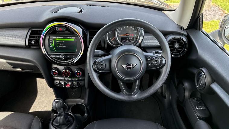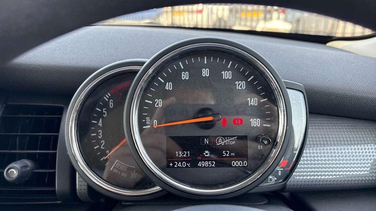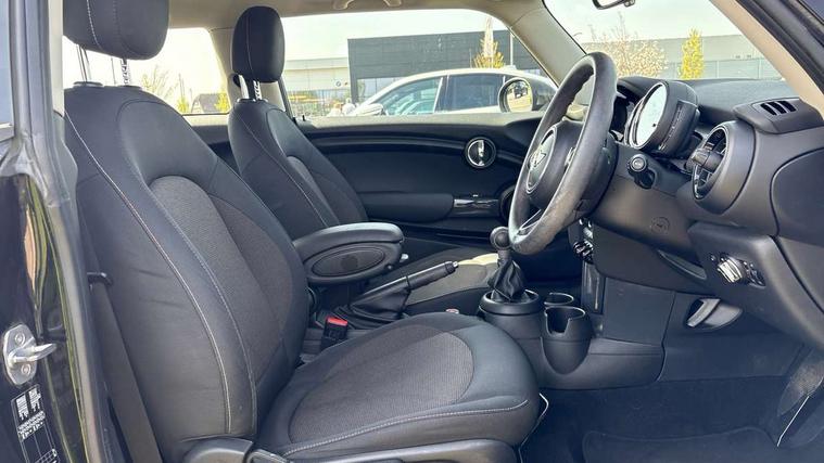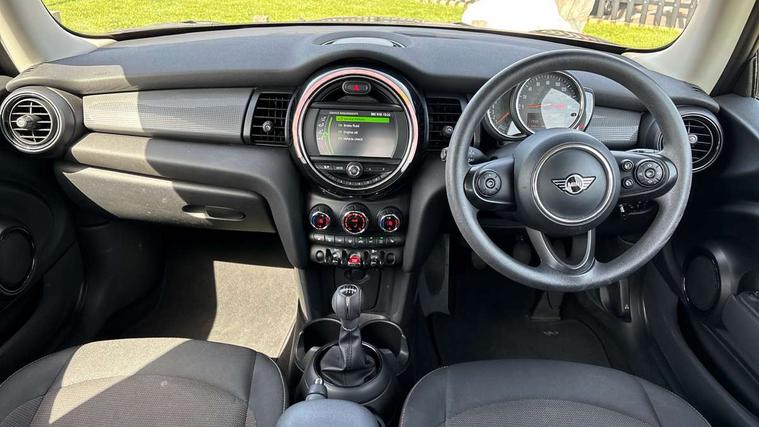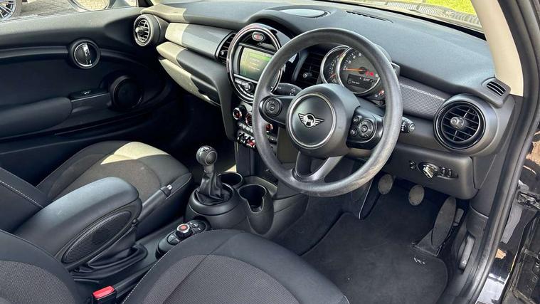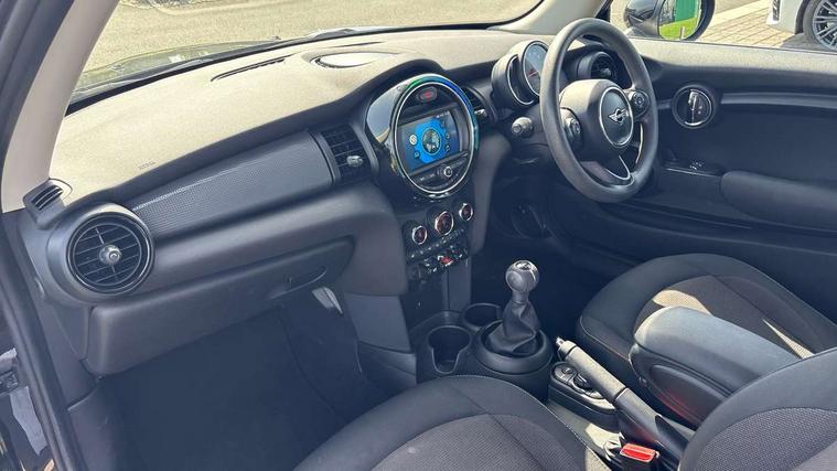 Compatible mobile phone bluetooth with audio streaming, Instrument cluster, Mini E-call, MINI TeleServices, On board computer, Service interval indicator, 6.5" touchscreen with LED ring, FM tuner and DAB digital radio, Automatic headlight activation switch, Body colour fuel filler cap, Chrome border high gloss black slats radiator grille, Dynamic brake lights, Electric front+rear windows, Heated rear window, Heated windscreen washer jets, LED headlight with closed ring and daytime driving lights, Left exhaust tailpipe with chrome finisher, Metal door sill strips with MINI imprint, Model logo Cooper on right of tailgate, Rain sensor window wipers, Rear fog lights, Rear LED lights with union jack design, Rear window wiper, Side scuttle panel with integrated indicator, Sun/heat protection glass, White indicator lenses, 12V Accessory socket in centre console, 4 lashing eyes in luggage compartment, 60/40 split folding rear seat, Chrome interior highlights, Colour line - Carbon black, Cupholders, Front and rear isofix with front passenger airbag deactivation, Glove compartment, Height and length steering column adjustment, Interior lighting with 12 basic colours selectable via toggle switch in roof, Leather gearshift lever and handbrake gaiters, LED reading lights, vanity mirror lights, front foot well light and spotlight on front seats, Manual air conditioning, Mechanical seat adjustment, driver seat height adjust, forward/back and front seats backrest, Mini logo projection on floor from drivers exterior mirror, Multifunction steering wheel, Satellite grey headlining, Storage compartments in doors, Sunvisors with vanity mirrors, Tool kit, 3 point seatbelts on all four seats, 6 Airbags - front, side, head and seat belt tensioners, Anti-lock braking system (ABS), DSC - Dynamic Stability Control, Front and rear disc brakes, Hill start assist, Single tone fanfare horn, Tyre pressure monitoring system, Alarm system with tilt sensor, monitoring doors, bonnet interior and tailgate, Electronic vehicle immobiliser, Start/stop toggle with keyless go,