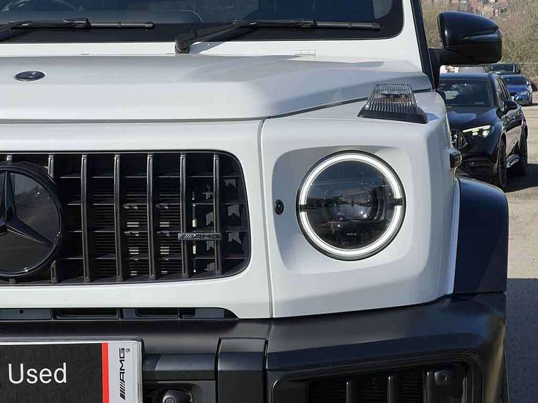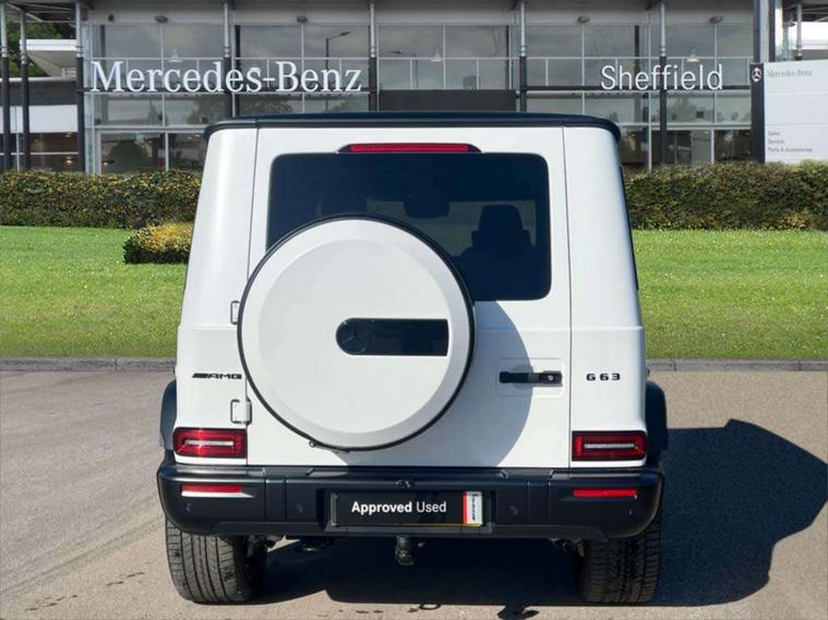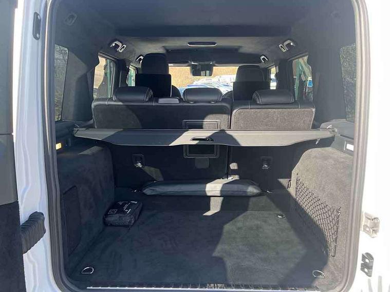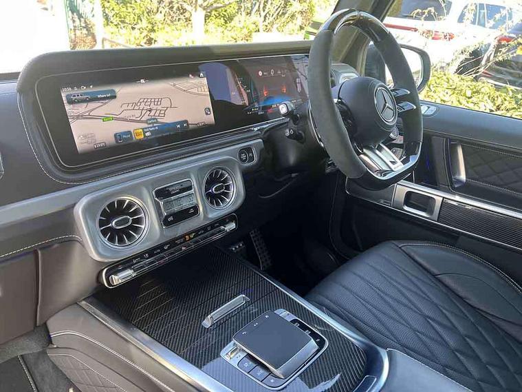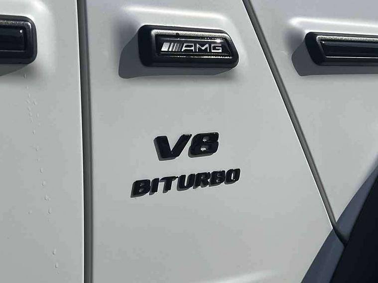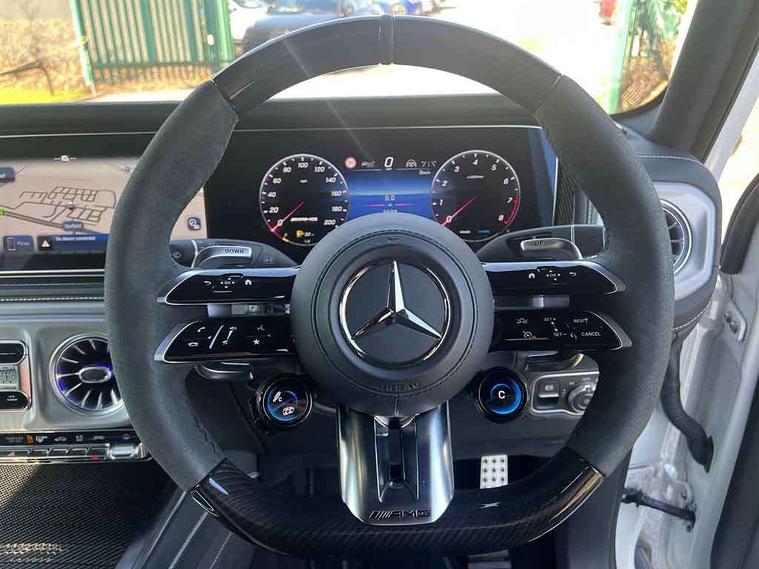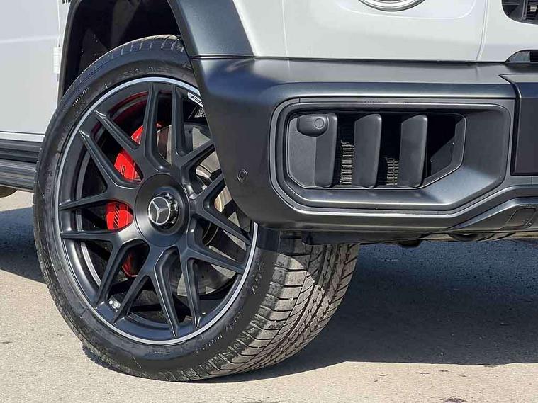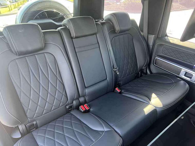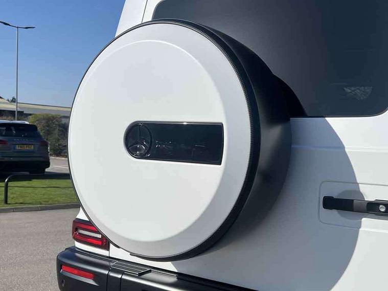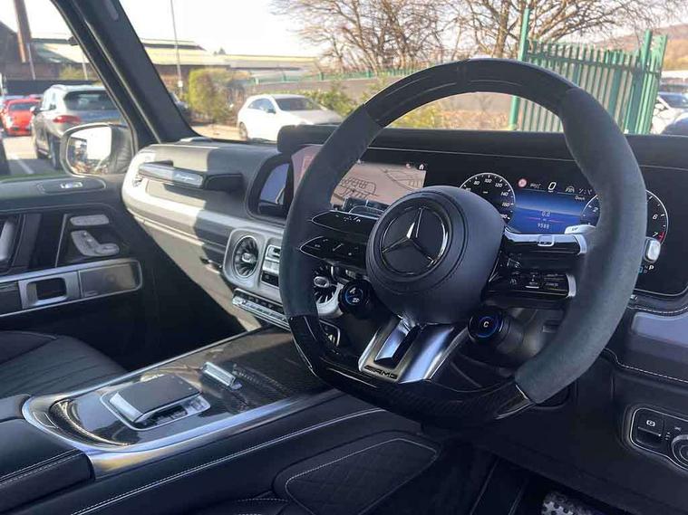 360 degree parking camera, Active parking assist with PARKTRONIC, AMG instrument cluster with dual bonded 12.3" widescreen displays, AMG specific IWC design analogue clock, Attention assist, Bluetooth interface for hands free telephone, Communications module (LTE), MBUX augmented reality for navigation, Mercedes connect me, Mercedes-Benz emergency call, PAS, Passive person presence reminder, Remote Services Premium, Service indicator (ASSYST), Smartphone integration with Apple CarPlay and Android auto, Trip computer, Widescreen cockpit with dual bonded 12.3" widescreen displays, Wireless charging, 4MATIC permanent four wheel drive, AMG Active Ride Control suspension, AMG SPEEDSHIFT 9G Tronic sports transmission with cruise control and variable speed limiter, Differential lock, Low range gear reduction (Electronically selectable while driving), Petrol Particulate Filter, Aux-in socket, Burmester 3D surround sound system, DAB digital radio module, MBUX multimedia system, Sound personalisation, 3rd brake light, Adaptive highbeam assist plus - automatic low high beam switching, AMG bodystyling with exclusive Mercedes AMG G 63 front aprons with cooling air intakes and AMG flared wheel arches in vehicle colour, AMG Crest on engine hood, AMG Crest projection in outside mirror, AMG fuel cap, Automatic headlamp activation, Automatically dimming rear view mirror, Bumper insert in night black magno, Dark tinted heat insulated glass, Door mirrors - Electrically adjustable/heated/integrated indicators, front area lighting and automatically dimming driver's mirror, Electric sunroof sliding, with one-touch opening, Front and rear electric windows, Heated windscreen, LED daytime running lights, Multibeam LED headlights with anti-dazzle feature, Privacy glass - Dark glass from B-pillar backwards, Rain sensor windscreen wipers, Rear side wing doors, Rear wiper, Simulated underguard in night black magno, Towbar, Trailer coupling with ESP trailer stabilisation, Transparent Bonnet, V8 BITURBO lettering, 1/3 to 2/3 split folding rear seats, 12V socket in centre console, rear and load compartment, 2 cup holders in front and rear, 3 seat bench in 2nd row, Ambient lighting with 64 colours and projection of brand logo, AMG floor mats with AMG lettering, AMG Performance steering wheel in carbon fibre/MICROCUT microfibre, AMG steering wheel buttons, Centre armrest between front seats with integrated stowage compartment, Cushion length adjustment with gapless cushion, Designo dinamica microfibre roof lining in Black, Electrically adjustable steering column, with automatic adjustment for entry/exit, Four illuminated stainless steel door sill panels, Front head restraints, Front seats with heated and electrically adjustable, memory function for seats, head restraints, exterior mirrors and steering wheel, Heated front seats, Heated rear seats, Heated steering wheel, Ionisation of interior air including fine particle activated charcoal filter system, Luggage compartment cover, Partition net, Rear head restraints, Single front passenger seat, THERMOTRONIC automatic climate control system with 3 climate zones and 3 climate styles - Medium, Diffuse and Focused, AMG night pack II - G Class, Assistance package with PRE-SAFE Impulse side - G Class, Stowage space pack - G class, 3x3 point rear seatbelts, ABS with Brake Assist, Airbags - windowbags, AMG high performance braking system with internally ventilated and perforated brake discs, Driver/Front Passenger airbags, Electronic four wheel traction control, ESP with ASR, Front side airbags, Hill start assist, i-Size child seat attachment system for the outer rear seats, PRE-SAFE system for preventive occupant protection, Rear door child safety locks, Rear side airbags, Red painted AMG brake calipers, Seat belts, 3-point design in black, Seatbelt pretensioners, Tyre pressure monitoring system, Anti-theft alarm system/interior protection with tow-away protection and interior monitoring systems, Dashcam, Guard 360 degree vehicle protection plus, Immobiliser, Keyless Go starting function, AMG carbon fibre trim, Full size spare wheel,