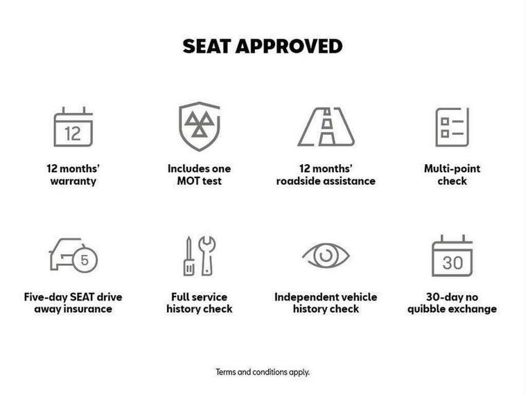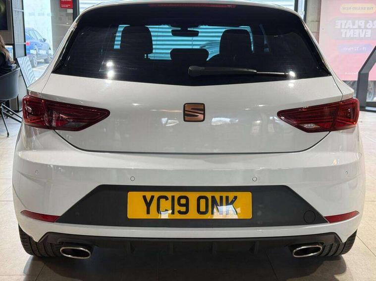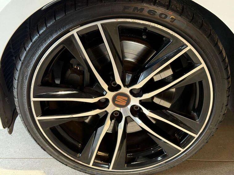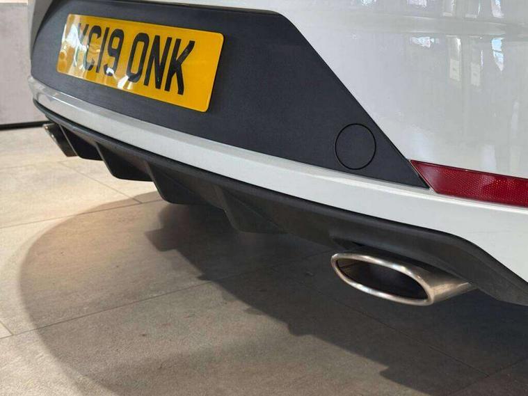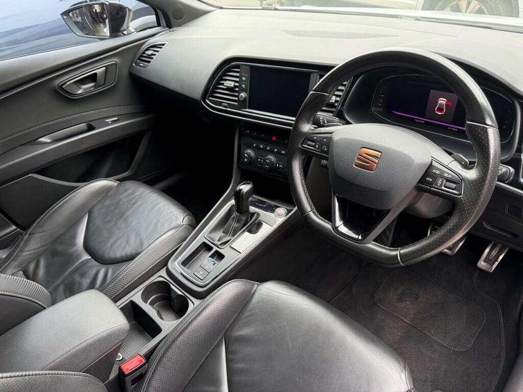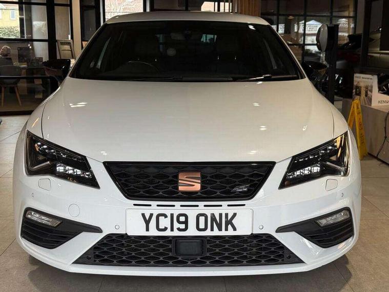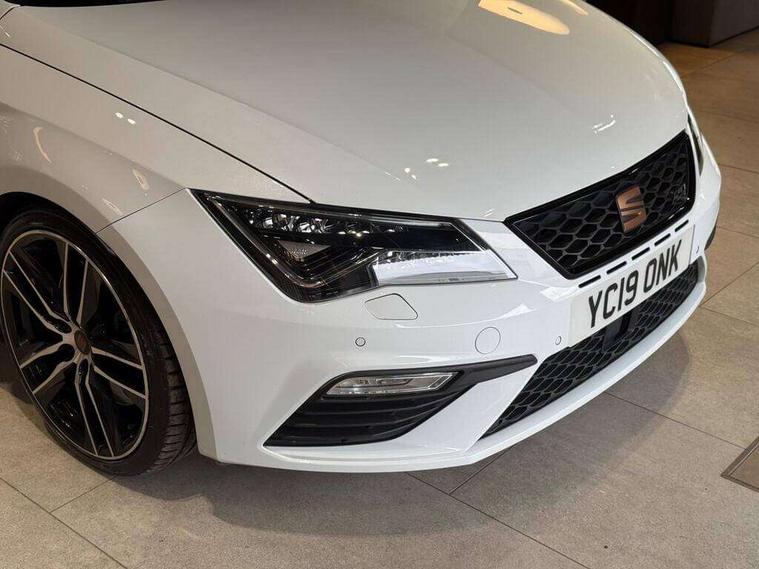 'Lights On' Reminder warning buzzer, 3D map display, 8" touch screen, Bluetooth Handsfree Phone Connection, CUPRA performance interface, Digital cockpit, Electro-mechanical progressive power assisted steering, Front and rear parking sensors, Front assist with pedestrian protection, Full Link Smartphone Integration with Mirror Link, Apple Car Play, Google Android Auto, Low fuel warning light, Navigation system (incl. media system plus), Outside temperature gauge, RPM counter, SEAT Drive profile CUPRA, SEAT logo boot release, Service interval indicator, Trip computer, Voice recognition, Wireless Smartphone charger, Dynamic chassis control, Lowered suspension, Mechanical limited slip differential, XDS electronic differential lock, 2x SD card slot, 4 USB, 8 Speakers, Auxiliary input socket, Bluetooth audio streaming, CD player, DAB Digital radio, High resolution colour driver display, Media system plus (incl. media system colour), SEAT USB media cable, Steering wheel mounted audio/phone controls, Black radiator grille, Body colour door handles, Body coloured bumpers, Dark tinted rear windows, Electric front/rear windows, Electrically adjustable door mirrors, Electrically foldable exterior mirrors with parking position and passenger-side mirror with lowering function, Exclusive Cupra front and rear bumpers, Gloss black exterior mirrors with integrated LED indicators, Heated door mirrors, High gloss black finish B and C pillars, High gloss black front grille surround, Illuminated aluminium front door sill with CUPRA logo, LED front fog lights, LED headlights with LED day time running lights + LED rear lights + LED number plate lights, LED rear fog light, Rear wash/wipe, Visible dual exhaust pipes, 12v power point in centre console, 60/40 split folding rear seat with armrest, Active front headrests and 3 rear headrests, Additional heating and ventilation outlet in rear of centre console, Black roof lining, Boot storage net, Cargo rings in boot, Driver and passenger seat height adjust, Driver and passenger sun visor, covered and illuminated mirror, driver sun visor with card holder, Driver seat lumbar adjustment, Dual zone climate control, Dust/pollen filter, Electric adjust driver's seat, Flat bottomed perforated leather steering wheel with white stitching and CUPRA logo, Front adjustable head restraints, Front armrest with storage box, Front cupholders x 2, Front seatback storage pockets, Front sport seats in leather, Front/rear floor mats, Gear shift indicator, Height/reach adjust steering wheel, High centre console with integrated box & cup holder, rear air outlet, with armrest in front seats, Illuminated door sills, Instrument lighting with brightness control, Interior copper and black detailing, Luggage tie-down hooks, Multi-colour ambient interior lighting, Passenger seat lumbar adjust, Pedals with Aluminium Cover, Rear top tether child seat ISOFIX attachment, Steering wheel gearshift paddles, Winter pack - Leon, 3 point seatbelts on all rear seats, 7 airbags - 2 front, 2 front side, 2 curtain, 1 knee, ABS + TCS, Child proof door locks, Electric handbrake, Electronic parking brake with auto hold, ESC with switch off key, ESC with tyre pressure warning indicator, ESP+EBA, Front and rear black brake calipers with cupra logo, Front seatbelt pretensioners, Front seatbelt reminder, Hill hold control, Manual passenger airbag deactivation function, Multi-Collision braking, 2 folding remote keys with window open/close function and boot opening/door mirror folding function, Central locking fuel filler cap, Engine immobiliser, Keyless entry and go, Locking wheel bolts, Remote central locking + deadlocks, Volumetric alarm with back up horn, Gloss black interior detailing, 19" Cupra Machined alloy wheels 30/2,