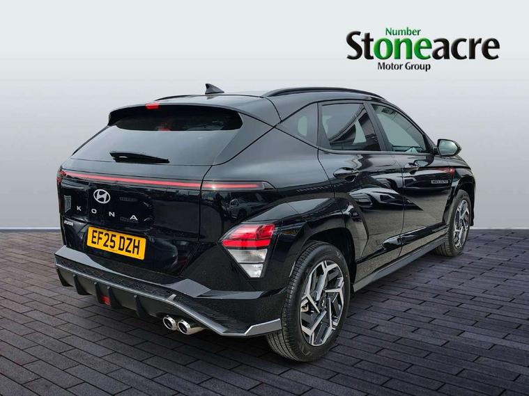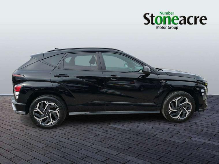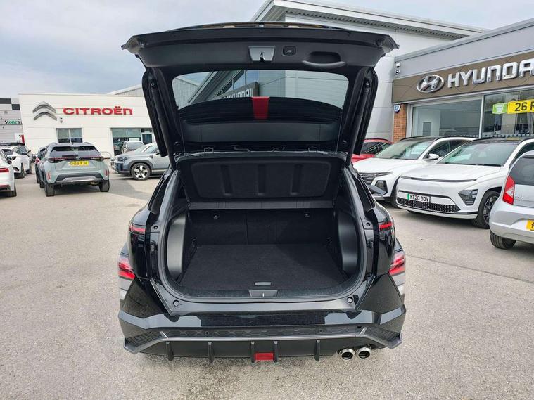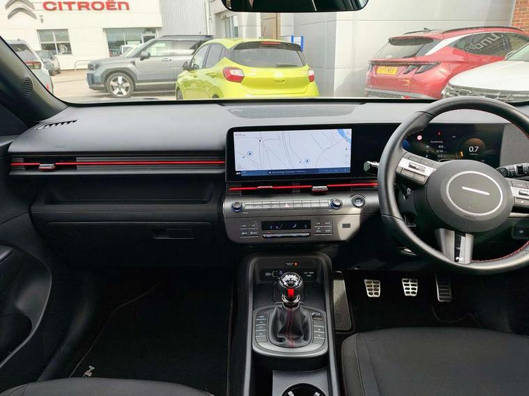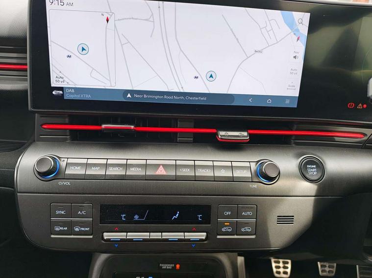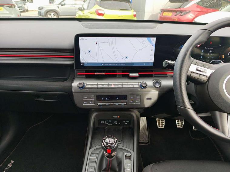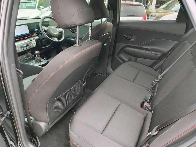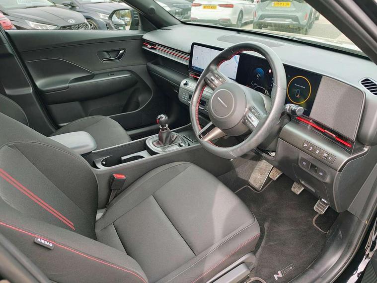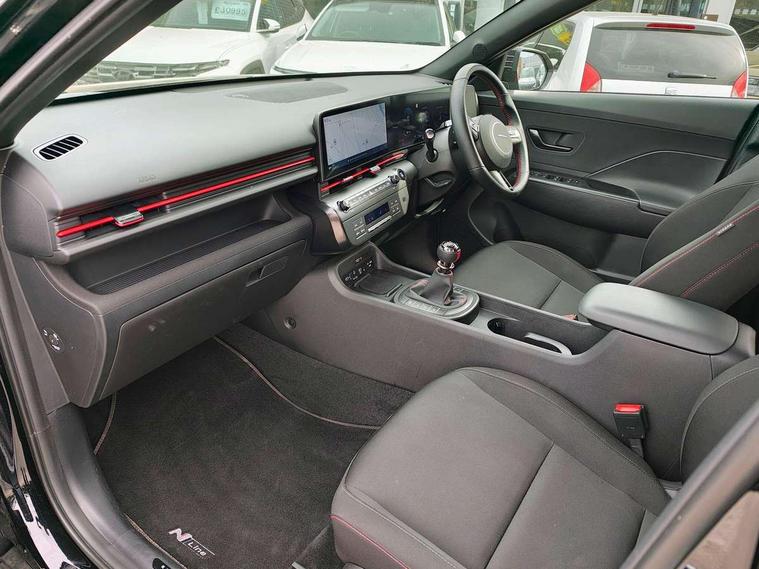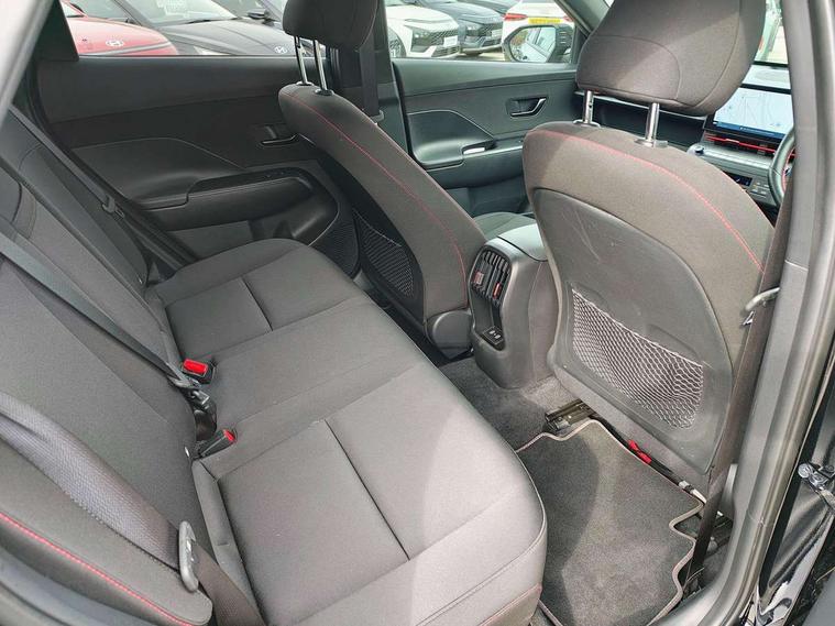 12.3" touchscreen centre console display satellite navigation with bluelink, live services and mapcare, Bluetooth connectivity with voice recognition, Cruise control, Driver status monitor (DSM), Driver supervision instrument cluster with 12.3" LCD display, eCall emergency call system, Feature on demand - Enabled, Forward collision avoidance assist (FCA 1.5) - Car, pededstrian, cycle and junction turning, Front parking sensor, Height adjustable power tailgate, Intelligent speed limit assist, Lane follow assist, Lane keep assist, Leading vehicle departure alert (LVDA), Parking system with rear camera and guidance system, PAS, Rear parking sensor, Roadside assistance, Wireless phone charging pad, Wireless Smartphone Integration includes Apple CarPlay and Android auto, 2 front USB C and 2 rear USB C charging points, DAB Digital radio, Speakers - Front, rear and tweeters, Steering wheel audio, phone and cruise controls, Auto dimming rear view mirror, Automatic headlights with dusk sensor, Automatic windscreen wipers with rain sensor, Body colour exterior door handles, Body coloured wheel arch inserts, Door mirror LED indicator lights, Electric front windows with anti-trap mechanism and one touch control, Electric rear windows, Electrically adjustable and heated door mirrors, Full LED MFR headlights, Gloss black door mirrors, LED daytime running lights, LED upper and lower rear lights, Power folding door mirrors, Privacy glass - Rear windows and tailgate, Rear roof spoiler with integrated LED brake light, Rear side wing doors, Rear wiper, Roof rails, Solar glass with front door glass and windscreen, Tinted glass in front and rear doors, Windscreen auto defog function, 12V power outlet in front console, 2 zone climate control, 3 seat bench in 2nd row, 40/20/40 split folding rear seat, Adjustable head restraints, Aluminium pedals, Ambient lighting, Driver and passenger front seat pockets, Driver's seat lumbar support, Driver/passenger manual seat height adjustment, Driver/passenger sunvisors and illuminated vanity mirrors, Floor mats, Heated front seats, Heated rear seats, Heated steering wheel, Height/reach adjustable steering column, Leather wrapped steering wheel and gear knob, LED centre interior light, LED front interior light, Luggage compartment LED lighting, Luggage shelf, Metal paint effect interior door handles, N Line cloth upholstery, Rear centre armrest with cupholders, Single front passenger seat, Vertical adjustment rear head restraints, N Line exterior design pack - Kona, Trailer wiring package - Kona, Airbag - front, front side, curtain and centre front airbag, Anti-lock brake system (ABS), Childproof rear door locks, Downhill brake control, Electric parking brake, Electronic stability control, Fixed 3 point for second row centre passenger seatbelt, Hill start assist control (HAC), Rear seat alert, Tyre pressure monitoring system, Alarm/immobiliser, Rear occupant alert, Remote central locking, Smart key with keyless entry and start/stop button, Five year annual vehicle health checks, Temporary mobility kit (TMK),