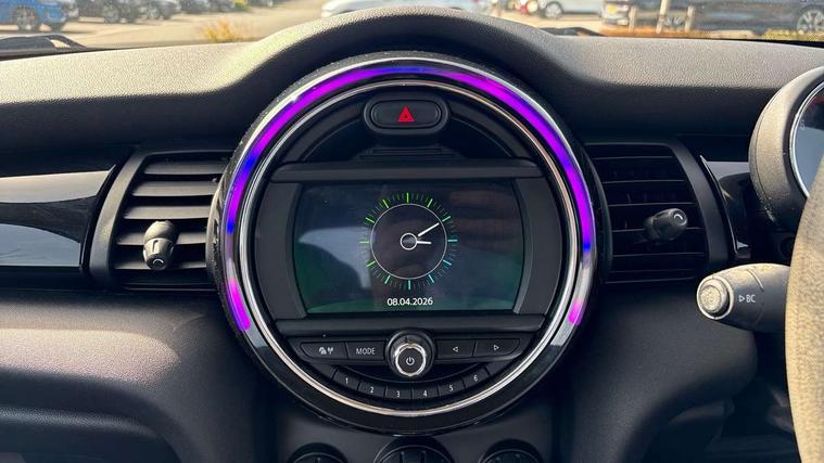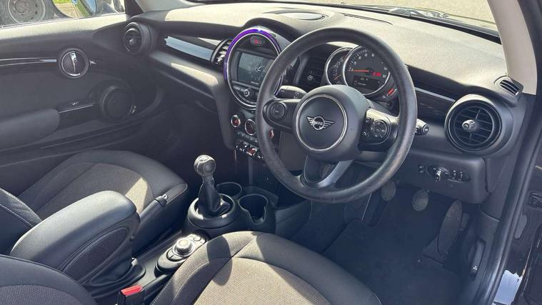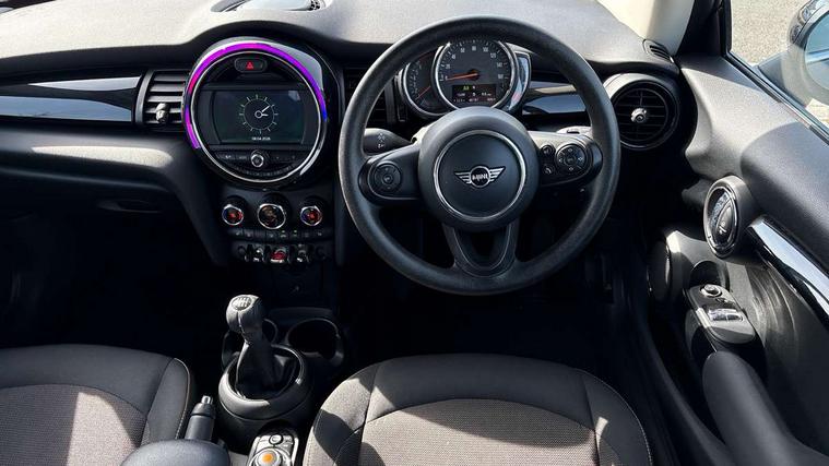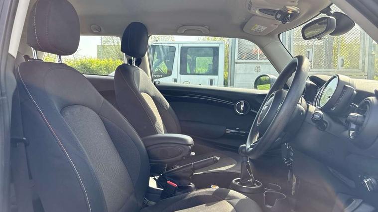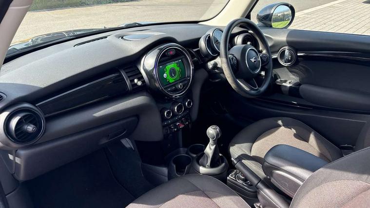 Compatible mobile phone bluetooth with audio streaming, Instrument cluster, Mini E-call, MINI TeleServices, On board computer, Service interval indicator, 6.5" touchscreen with LED ring, FM tuner and DAB digital radio, Automatic headlight activation switch, Body colour fuel filler cap, Chrome border high gloss black slats radiator grille, Dynamic brake lights, Electric front windows, Heated rear window, Heated windscreen washer jets, LED headlight with closed ring and daytime driving lights, Left exhaust tailpipe with chrome finisher, Metal door sill strips with MINI imprint, Model logo Cooper on right of tailgate, Rain sensor window wipers, Rear fog lights, Rear LED lights with union jack design, Rear window wiper, Side scuttle panel with integrated indicator, Sun/heat protection glass, White indicator lenses, 12V Accessory socket in centre console, 4 lashing eyes in luggage compartment, 60/40 split folding rear seat, Chrome interior highlights, Colour line - Carbon black, Cupholders, Front and rear isofix with front passenger airbag deactivation, Glove compartment, Height and length steering column adjustment, Interior lighting with 12 basic colours selectable via toggle switch in roof, Leather gearshift lever and handbrake gaiters, Manual air conditioning, Mechanical seat adjustment, driver seat height adjust, forward/back and front seats backrest, Mini logo projection on floor from drivers exterior mirror, Multifunction steering wheel, Satellite grey headlining, Storage compartments in doors, Sunvisors with vanity mirrors, 3 point seatbelts on all four seats, 6 Airbags - front, side, head and seat belt tensioners, Anti-lock braking system (ABS), DSC - Dynamic Stability Control, Front and rear disc brakes, Hill start assist, Single tone fanfare horn, Tyre pressure monitoring system, Alarm system with tilt sensor, monitoring doors, bonnet interior and tailgate, Electronic vehicle immobiliser, Start/stop toggle with keyless go, Tool kit,