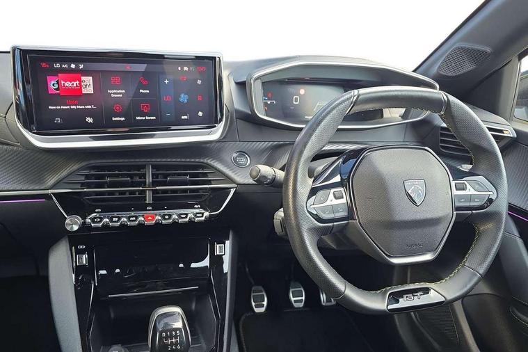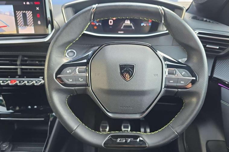 Bluetooth telephone facility, Drive mode select (Eco/Normal/Sport), Driver attention warning, Emergency call service, Exterior temperature indicator with ice warning, Front and rear parking sensors, Multi function trip computer, PEUGEOT i-Cockpit with 10" configurable 3D colour head up instrument panel, PEUGEOT i-Cockpit with 10" HD capacitive colour touchscreen, PEUGEOT i-Cockpit with compact steering wheel, PEUGEOT SOS and assistance, Push button start, Smart phone docking station, Smartphone 15W wireless charging plate, Speed limit recognition and recommendation, Start/stop system, Wireless mirror screen with apple carplay and android auto, 6 Speakers - 2 tweeters and 4 door speakers, DAB Digital radio, Peugeot i-connect infotainment system - 10in HD touchscreen, AM/FM/DAB digital radio, Wifi Mirroring, Bluetooth & 2 USB connection, USB-A socket (x1) and USB-C socket (x1) - rear, USB-C data and charge socket and USB-C charge socket in front, Voice recognition for radio, navigation and telephony features, 2 X Rear number plate lights, Acoustic windscreen, Antenna - Gloss Black 'fin' design, Automatic hazard light activation upon heavy brake application, Body coloured exterior door handles, Dark tinted rear side and tailgate windows, Diamond black rear spoiler (roof), Door sills protection with PEUGEOT signature lettering, Electric heated and power folding door mirrors with courtesy floor lighting, Frameless electrochrome interior rear view mirror, Full LED headlights with automatic height adjustment and PEUGEOT smartbeam assist, Gloss black B pillar, Gloss black door mirror shells, Gloss black front bumper grille with body colour accents, Gloss black rear cluster connecting strip, Gloss black wheel arch extensions, Gloss black window weatherstrips, GT model designation badging on C pillar, GT model designation badging on tailgate, Headlights left on audible warning, LED 3 claw horizontal rear lighting signature (with daylight function) and LED brake lights, indicators and reversing lights, LED daytime running lights with distinctive 3 claw signature, LED front indicators, LED third brake light, Model designation badges front and rear in basalt grey, One touch electric front/rear windows with pinch protection, Rear bumper with gloss black finish, Rear reversing lights, Rear side wing doors, Rear windscreen wiper triggered automatically in reverse gear, Roof spoiler, Tailgate with heated rear windscreen and wiper blade, Variable front intermittent wipers, 1/3 to 2/3 split folding rear seats, 12V socket, 3 seat bench in 2nd row, 8 Colour personalisable ambient lighting, Adamite green contrast stitching to front and rear armrest, front centre console, dashboard facia, Aluminium pedals, Automatic mono zone climate control air condition, Boot lighting, Driver and front passenger dynamic seats, Driver and front passenger seat manual adjustment in longitudinal and back rest angle, Driver and front passenger seat mechanical height adjustment, Driver and passenger sun visors, front footwells and central storage with LED lighting, Electric power steering with reach and rake adjustable steering column, Front centre armrest with storage compartment, Front LED interior light, front LED reading spotlights(x2), rear LED reading spotlight(x2), Gear shift indicator, High centre console with 2 cup holders, Luxury carpet mats, Map pockets on the backs of the front seats, Multi function full grain perforated leather steering wheel with adamite green stitch detail and 'GT' emblem, Passenger seat height adjuster, Piano keys gloss black plated toggle switches to access main functions of the vehicle, Rear centre headrest, Roof lining - Mistral black, Seatbelt unfastened on the move audible and visual alert for front and rear seats, Single front passenger seat, Visibility pack - 208, 2x Isofix child seat fitting on outer rear seats, 3 rear 3 point seatbelts, ABS (Anti-lock Braking System) with EBD (Electronic Brakeforce Distribution) and EBA (Emergency Braking Assistance), Active safety brake with night function/cyclists/pedestrians, Child locking functionality on rear doors, Driver and front passenger airbag with passenger airbag deactivation, Driver/front passenger side airbags, Electric parking brake, ESP with Hill Assist, Front and rear curtain airbags, Front and rear disc brakes, Front optimised safety headrests and 3 x rear retractable headrests with height adjustable, Front three point retractable seatbelts with force limiters, Remote plip(x2) for locking, unlocking, includes emergency key blade, Tyre pressure monitoring system, Acoustic vehicle alert system (AVAS), Alarm - Connected, volumetric , perimetric, anti lift sensor, Automatic door locking when moving off, Deadlock, Electronic code immobiliser, Peugeot Open and Go System, Remote central locking, Carbon effect Dashboard, front and rear door panel finish, 17" Yanaka two tone diamond cut alloy wheels wheels includes gloss black inserts, Space saver spare wheel,