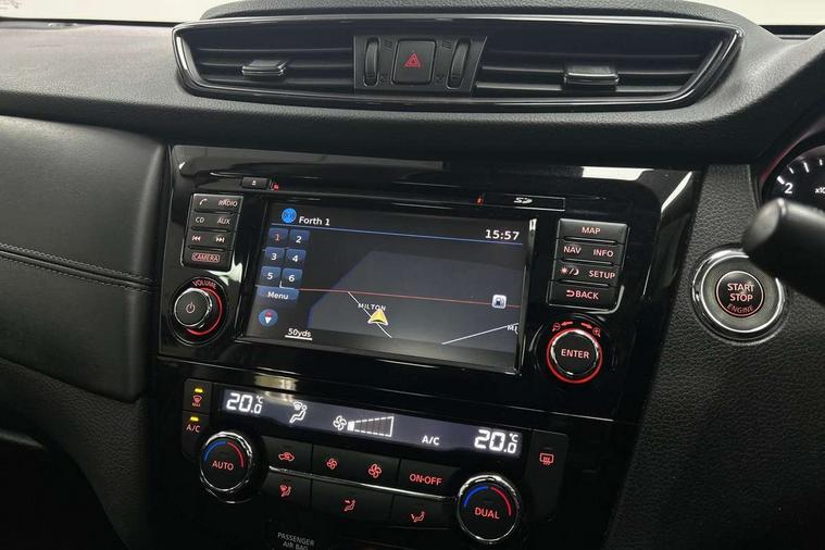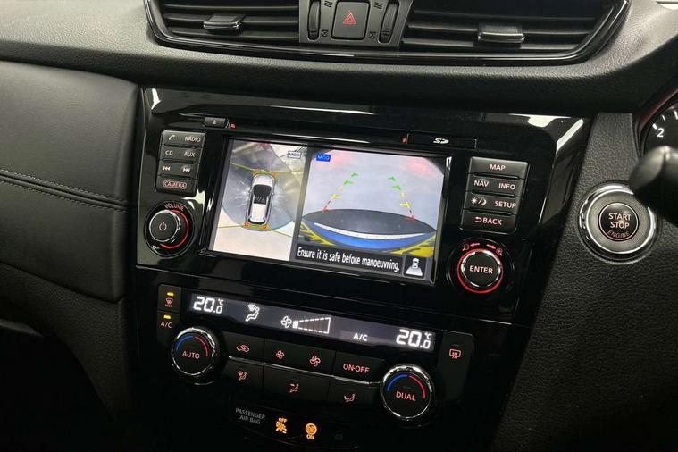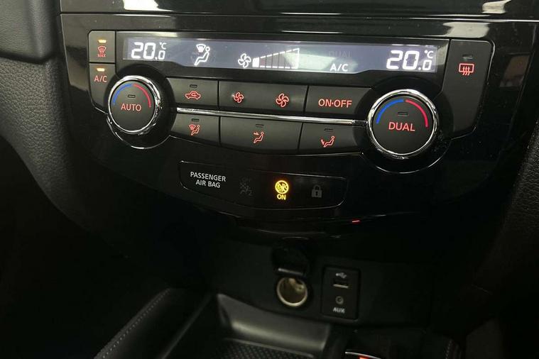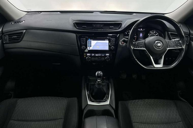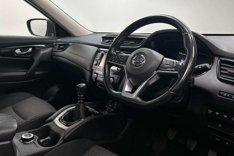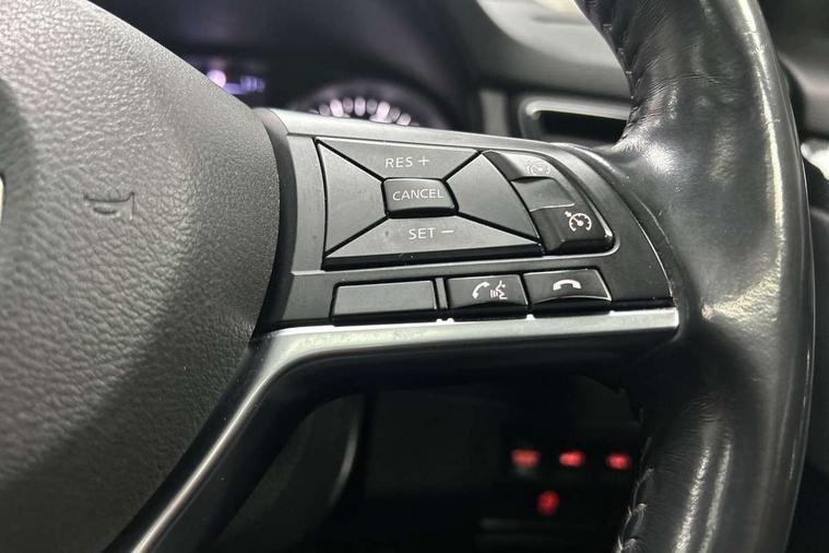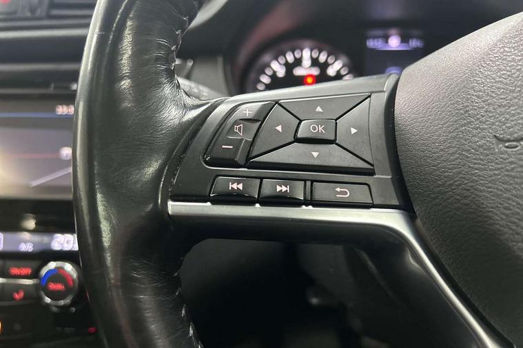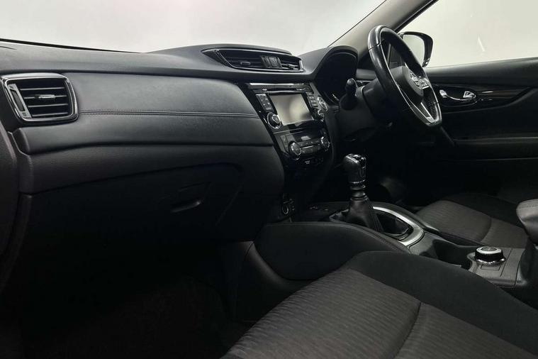 5" TFT driver information centre, Around View Monitor, Attention assist, Automatic tailgate opening, Bluetooth phone integration system, Cruise control + speed limiter, Engine start button, Front and rear parking sensors, Lane departure warning system, Nissan connect sat nav system, PAS, Traffic sign recognition, Trip computer, 6 speakers, Audio remote control in steering wheel, DAB Digital radio, Radio/CD, Smartphone apps, USB/aux input socket, Auto dimming rear view mirror, Automatic headlights, Automatic rain sensing wipers, Black honeycomb front grille, Body colour door mirrors, Chrome door handles, Chrome window surround, Electric folding door mirrors, Electric heated door mirrors, Front and rear power windows, Front fog lights, LED daytime running lights, Panoramic sunroof, Rear privacy glass, Satin silver roof rails, Shark fin roof aerial, 3 rear headrests, 60/40 split rear bench seat, Centre console storage box/armrest, Cloth upholstery, Configurable luggage board system, Dual zone climate control, Front and rear door pockets with bottle holders, Front cupholders, Height adjustable driver/front passenger seats, Height adjustable front headrests, Individual rear reading lights, Isofix child seat attachment, Leather steering wheel and gear knob, Lumbar support, Pollen filter, Rake/reach adjustable steering wheel, Rear armrest, Synthetic leather instrumental panel inserts, Synthetic leather knee pad, 3 point seatbelts on all seats, ABS, Child locks on rear doors, Driver and passenger airbags, EBD + Brake Assist, Electronic parking brake, ESP + traction control, First aid kit, Front and rear curtain airbags, Hill hold assist, Intelligent emergency braking with pedestrian recognition, Seatbelt warning, Tyre pressure monitoring system, Warning triangle, Alarm, Immobiliser, Intelligent Key, Remote central locking, Full size spare wheel,