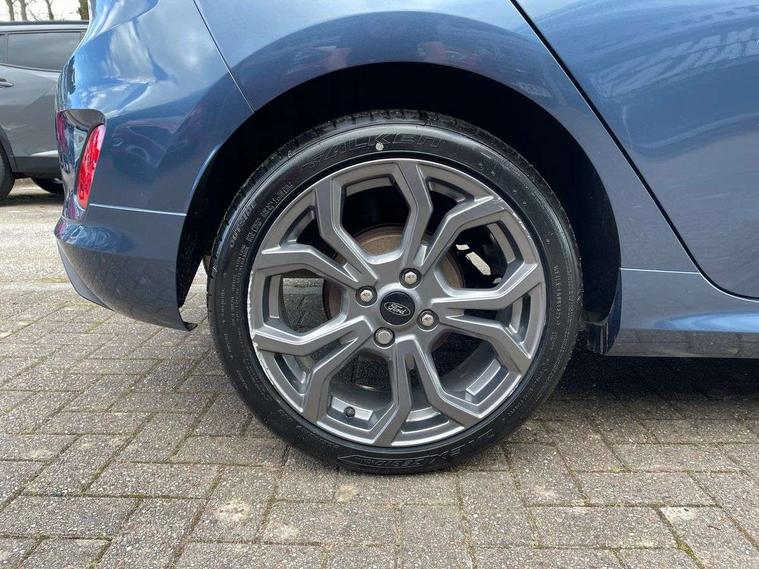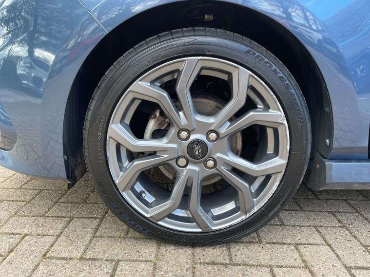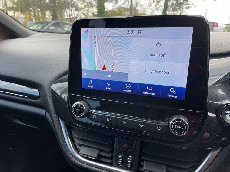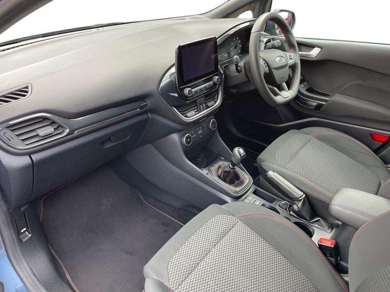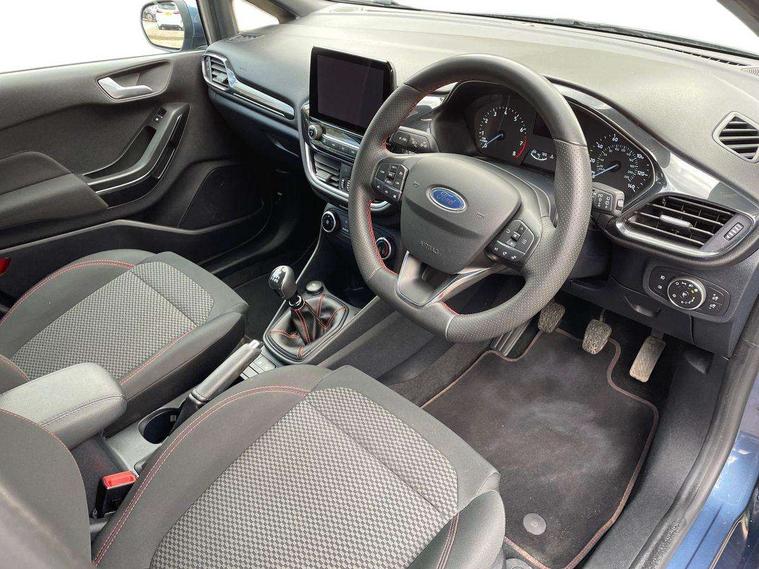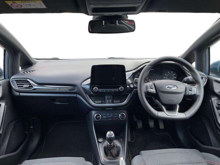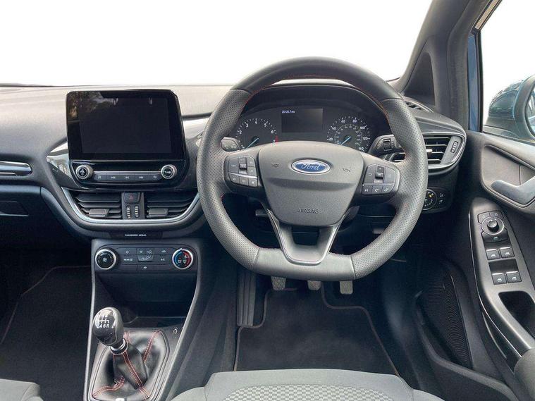 Bluetooth system, Electric power steering, Ford easy fuel, Ford SYNC 3 Navigation system incl 8" touchscreen, 7 speakers, FordPass connect, Apple carplay, android auto, voice control and emergency assistance, Rear parking distance sensors, Selectable drive modes (Normal, Sport, Track), Trip computer, Sports suspension, 2 USB ports, Auxiliary input socket, DAB Digital radio, Steering wheel mounted controls, Body colour bumpers, Body colour door handles, Body colour large rear spoiler, Body coloured electrically operated and heated door mirrors with side indicators, Cornering front fog lights, Electric front windows/one touch facility, Electric rear windows, LED Night signature to rear lights, Quickclear heated windscreen, Rain sensing wipers and auto dimming rear view mirror, Rear privacy glass, Rear wiper, Unique ST-Line upper grille & full bodystyling kit with ST-Line wing badges, 3 spoke flat bottomed leather steering wheel, 60/40 split folding rear seat, Adjustable head restraints, Black headlining, Boot carpet, Centre console with opening armrest, 2x cupholders, 12v and USB, Chrome inner door handles, Cloth upholstery, Footwell illumination, Front floor mats in velour, Front map reading lights, Front seat and rear pockets, Illuminated glovebox, Leather gaiter, Load area light, Manual 2 way passenger seat adjust, Manual 4-way driver seat adjust, Manual air conditioning, Overhead console with sunglasses holder, Pollen filter, Rake/reach adjustable steering wheel, Sensico wrapped steering wheel, Sports front seats, NCAP Pack - Fiesta, 3 point seatbelts on all rear seats, ABS+EBA, Curtain airbags, Driver and passenger airbags, Drivers knee airbag, Electronic stability control with hill start assist, Front passenger airbag deactivation, Front side airbags, Seatbelt warning, Two tone horn, Tyre pressure monitoring system, Keyless start with 'Ford Power' starter button, MyKey system, Remote central locking & engine immobiliser, Thatcham Cat.1 alarm, 17" 5 spoke alloy wheels with rock metallic finish,