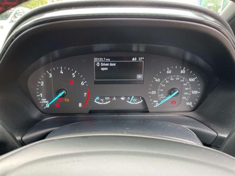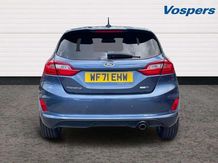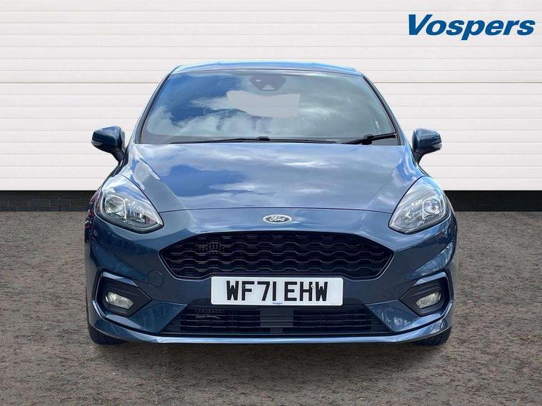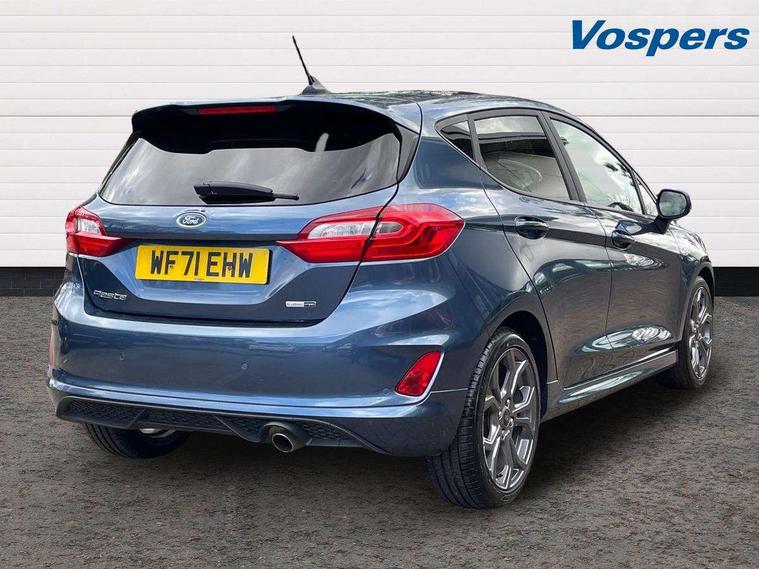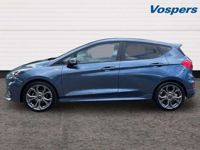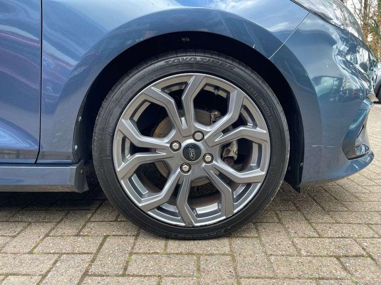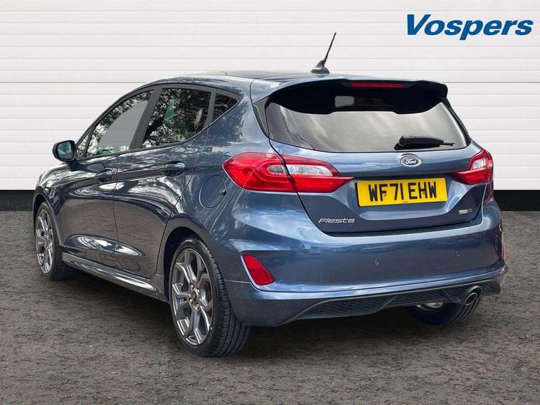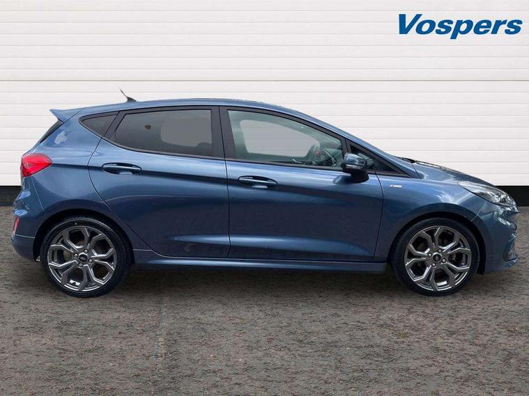 Bluetooth system, Electric power steering, Ford easy fuel, Ford SYNC 3 Navigation system incl 8" touchscreen, 7 speakers, FordPass connect, Apple carplay, android auto, voice control and emergency assistance, Rear parking distance sensors, Selectable drive modes (Normal, Sport, Track), Trip computer, Sports suspension, 2 USB ports, Auxiliary input socket, DAB Digital radio, Steering wheel mounted controls, Body colour bumpers, Body colour door handles, Body colour large rear spoiler, Body coloured electrically operated and heated door mirrors with side indicators, Cornering front fog lights, Electric front windows/one touch facility, Electric rear windows, LED Night signature to rear lights, Quickclear heated windscreen, Rain sensing wipers and auto dimming rear view mirror, Rear privacy glass, Rear wiper, Unique ST-Line upper grille & full bodystyling kit with ST-Line wing badges, 3 spoke flat bottomed leather steering wheel, 60/40 split folding rear seat, Adjustable head restraints, Black headlining, Boot carpet, Centre console with opening armrest, 2x cupholders, 12v and USB, Chrome inner door handles, Cloth upholstery, Footwell illumination, Front floor mats in velour, Front map reading lights, Front seat and rear pockets, Illuminated glovebox, Leather gaiter, Load area light, Manual 2 way passenger seat adjust, Manual 4-way driver seat adjust, Manual air conditioning, Overhead console with sunglasses holder, Pollen filter, Rake/reach adjustable steering wheel, Sensico wrapped steering wheel, Sports front seats, NCAP Pack - Fiesta, 3 point seatbelts on all rear seats, ABS+EBA, Curtain airbags, Driver and passenger airbags, Drivers knee airbag, Electronic stability control with hill start assist, Front passenger airbag deactivation, Front side airbags, Seatbelt warning, Two tone horn, Tyre pressure monitoring system, Keyless start with 'Ford Power' starter button, MyKey system, Remote central locking & engine immobiliser, Thatcham Cat.1 alarm, 17" 5 spoke alloy wheels with rock metallic finish,