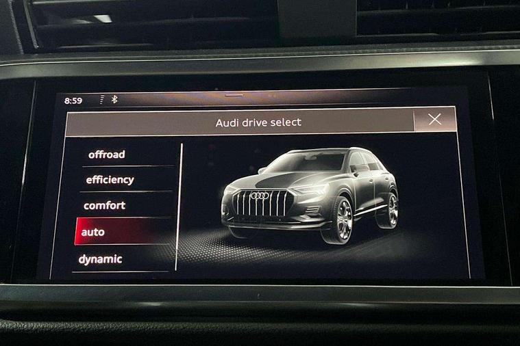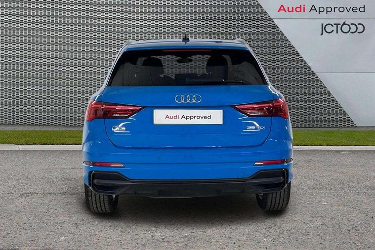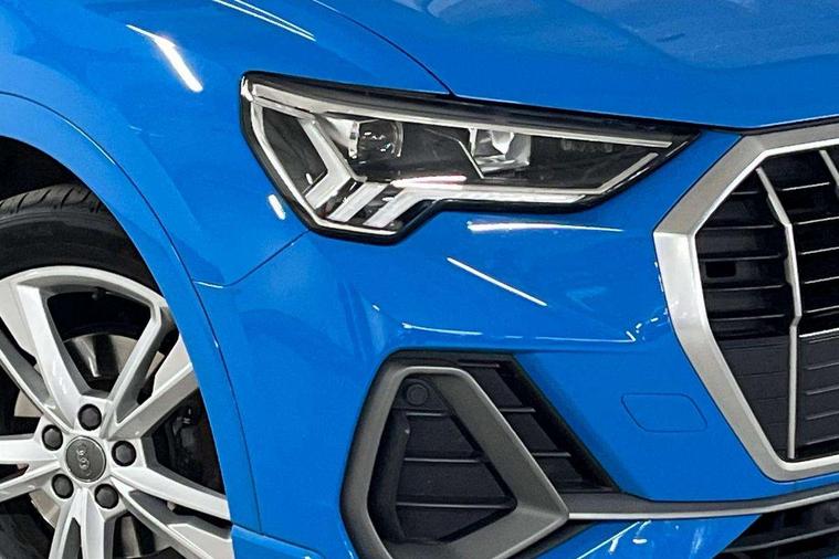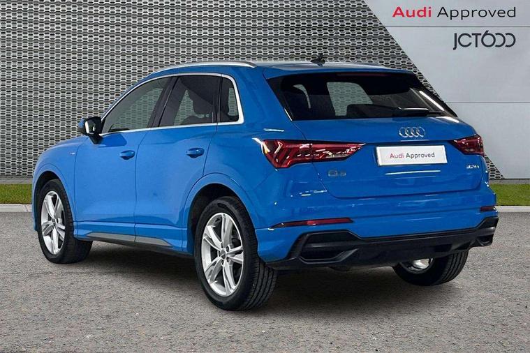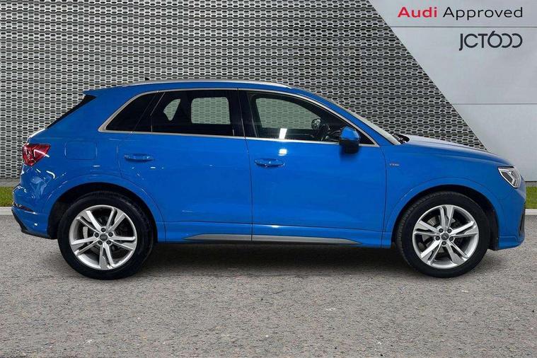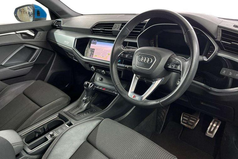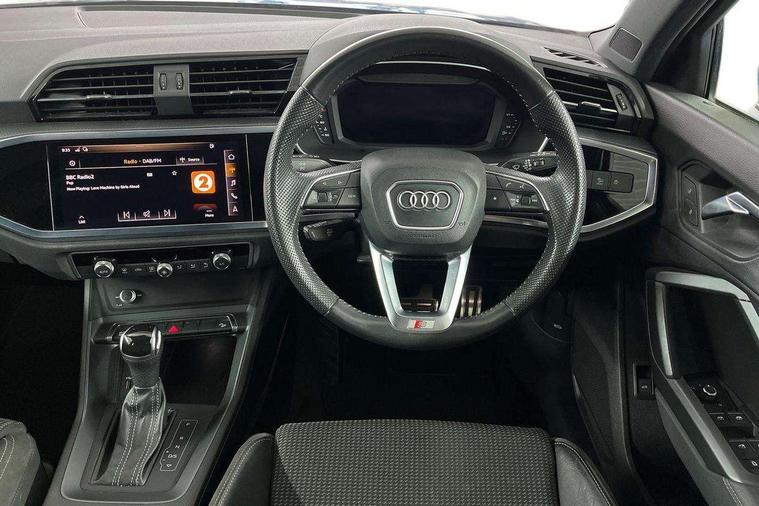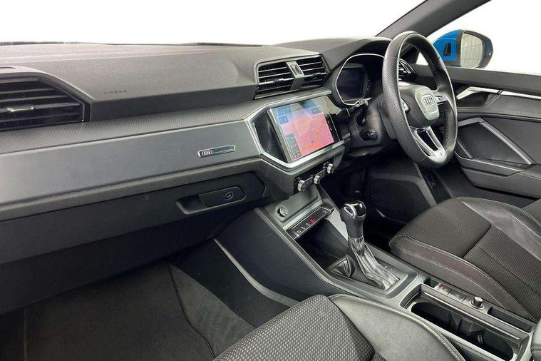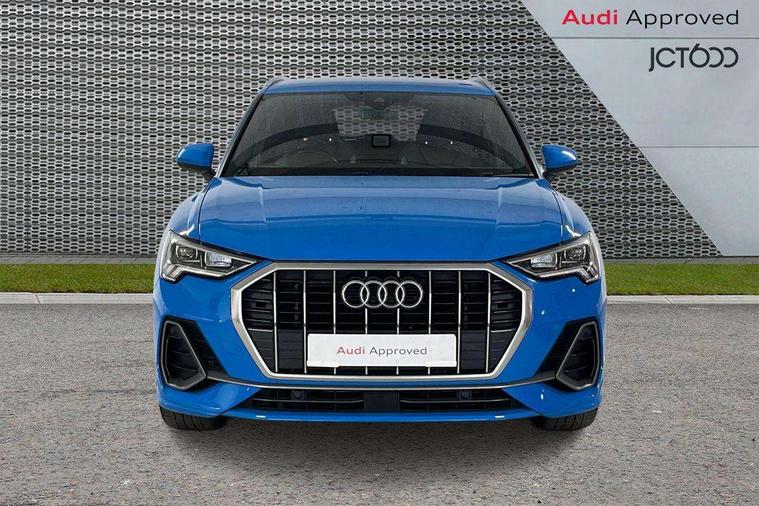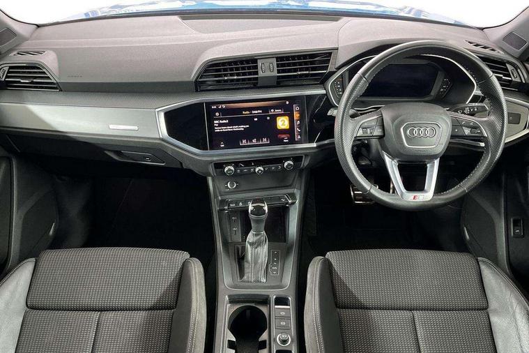 Dark matt brushed aluminium inlay, Leatherette door armrest, MMI touch colour display in gloss black with aluminium surround, Non smoking pack - Q3, Anti theft alarm, Anti theft wheel bolts, Audi pre-sense front with pedestrain and cyclist recognition, Remote central locking, 1 x USB type C and 1 USB type A charging points, 6 speakers, DAB digital radio module, 3x3 point rear seatbelts, 6 airbags - Driver, front passenger, curtain and side windows, Electrically operated child locks on rear doors, Electromechanical parking brake, Electronic stabilisation control including ABS, ASR and EDL, Hill descent control, Hill hold assist, Pre sense basic, Seatbelt monitoring, Tyre pressure warning, Warning triangle and first aid kit, Acoustic windscreen, Aluminium roof rails, Aluminium window trim, Auto dimming frameless rear view mirror, Body coloured bumpers, Electrically folding, adjustable and heated door mirrors with integrated LED side indicators and kerb view function for passenger side, Front and rear electric windows, Front fog lights, Front side air inlets in matt platinum grey, Front spoiler blade in matt platinum grey, Grille vertical bars in aluminium silver/Matt, High gloss black finish B and C pillars, LED headlights with LED daytime running lights and dynamic rear indicator, LED rear lights, Privacy glass, Rain and light sensors, Rear diffuser strip in matt titanium black, S Line badge on wings, S Line front and rear bumpers, Side skirt insert in matt Platinium grey, Silver chrome grille surround, Titanium black radiator grille, 12V socket in rear centre console, 40:20:40 split folding rear seat, 60:40 forwards/backwards position and backrest angle, Adjustable rear seat bench/backrest with centre armrest and cupholder, Aluminium door sill trims, Black cloth headlining, Dual zone electronic climate control, Front and rear black floor mats with contrast stitching in rock grey, Front and rear headrests, Front and rear roof module including reading lights, Front centre armrest with storage compartment and angle adjustment, Glove compartment lighting, Height and reach adjustable steering wheel, Illuminated door sill trims with S logo, ISOFIX child seat mounting and Top Tether with front passenger airbag deactivation, Luggage compartment light, Manual front seats with height adjustment, Perforated leather gearknob, Stainless steel luggage compartment sill finisher, Stainless steel pedals, Apple CarPlay, Audi connect safety and service (e-call), Audi drive select, Audi lane departure warning, Audi side assist, Audi smartphone interface, Audi Virtual Cockpit - 10.25" display, Bluetooth interface, Camera based traffic sign recognition, MMI Navigation Plus with high resolution 10.1 inch touchscreen colour display, Power opening/closing tailgate, Progressive steering, Service interval indicator, Start stop system with recuperation, Voice control system with natural language interaction, Diesel particulate filter, Sports suspension,