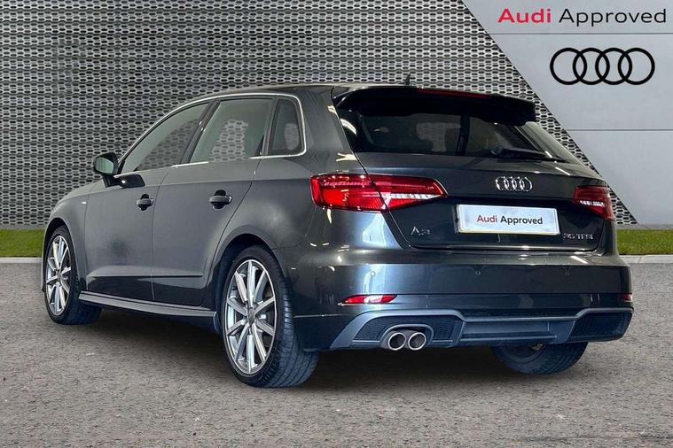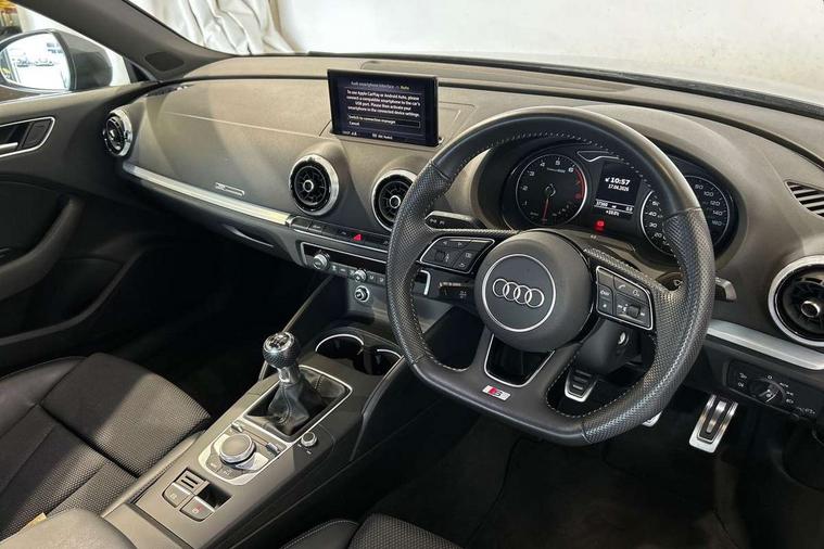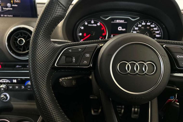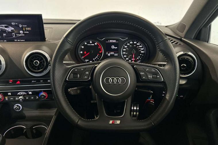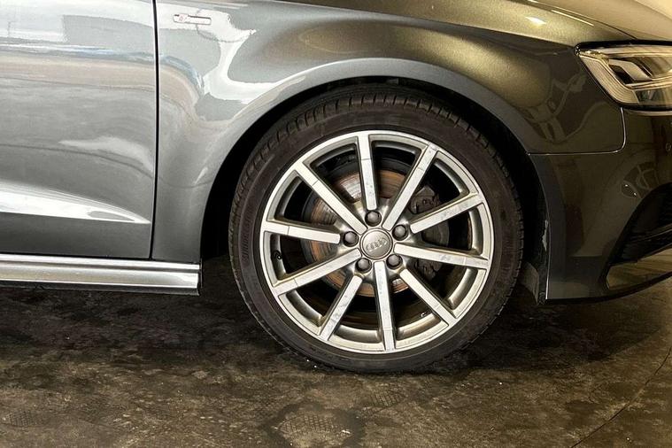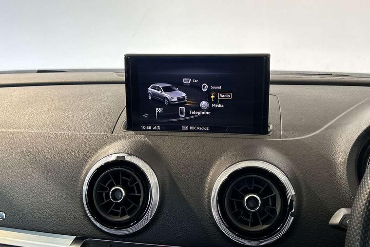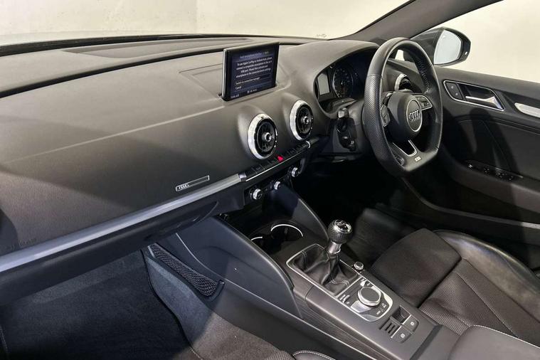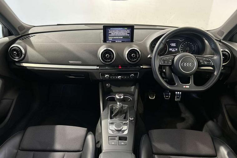 Audi connect, Audi drive select, Audi smartphone interface, Automatic start/stop system, Colour driver's information system display, Electro - mechanical power assisted steering, Mobile telephone preparation - bluetooth interface, SD card based satellite navigation system, Service interval indicator, Speed limit display, Voice control system, Voice recognition for navigation system, 2 USB interfaces and Aux-In jack, Audi music interface, CD player, DAB Digital radio, MMI radio plus with 7" colour MMI screen and MMI controller, Aluminium window trim, Auto dimming rear view mirror with light and rain sensors, Body colour door mirrors, Chrome exhaust tailpipes, Electric front windows, Electric rear windows, Electrically adjustable and heated door mirrors with integrated LED side indicators, Heated windscreen washer jets, LED daytime running lights, Matt black radiator grille, Rear wiper, S line badges on front wings, S Line body styling with front & rear bumpers and side skirts, radiator grille and rear diffuser insert, roof spoiler, Sport specific side air inlet grille and diffuser insert, 3 adjustable rear headrests, 3 spoke flat bottomed multi-function leather sport steering wheel, 4 lashing points to secure luggage, Adjustable front centre armrest, Black cloth headlining, Dual zone electronic climate control, Front and rear interior lights with delay, Front/rear floor mats, Glovebox light, Height and reach adjustable steering wheel, Illuminated door sill trims with S logo, Isofix child seat preparation for front passenger/outer rear seats inc passenger airbag deactivation, Stainless steel pedals, Storage compartments in doors side trims, centre console and under front drivers seat, LED interior light pack - A3/RS3, Non smoking pack - A3, Storage and luggage pack - A3/RS3, 3 point seatbelts on all seats, ABS/EBD, Active bonnet, Active front headrests, Airbags - front driver/passenger, front & rear side, curtain, drivers knee, ASR, EDL, Electromechanical parking brake, ESC - Electronic Stability Control + traction control, Front passenger airbag deactivation, Hill hold assist, Manual rear child locks, Multi-Collision braking, Seatbelt warning, Tyre pressure warning, Warning triangle and first aid kit, Anti theft alarm, Anti-theft wheel bolts, Remote control central locking, Thatcham category 1 alarm + immobiliser, Aluminium air vent surrounds, Aluminium trim elements, Matt brushed aluminium inlays, Tool kit, Tyre repair kit,