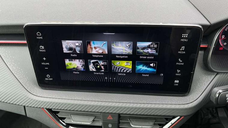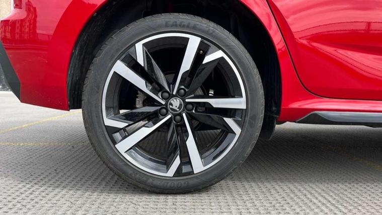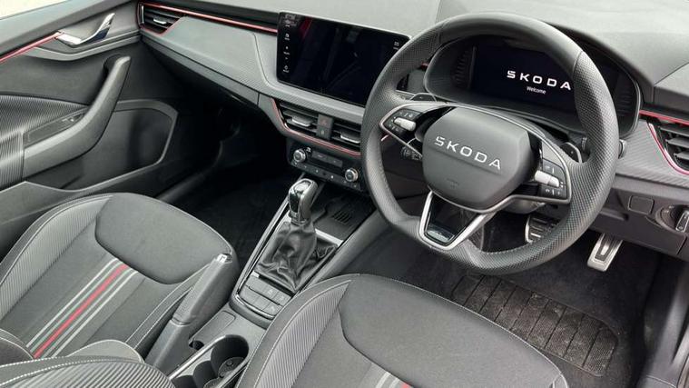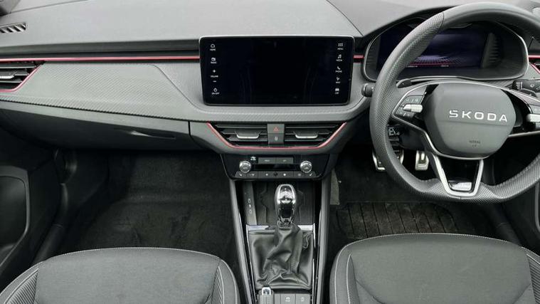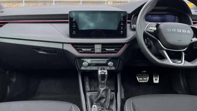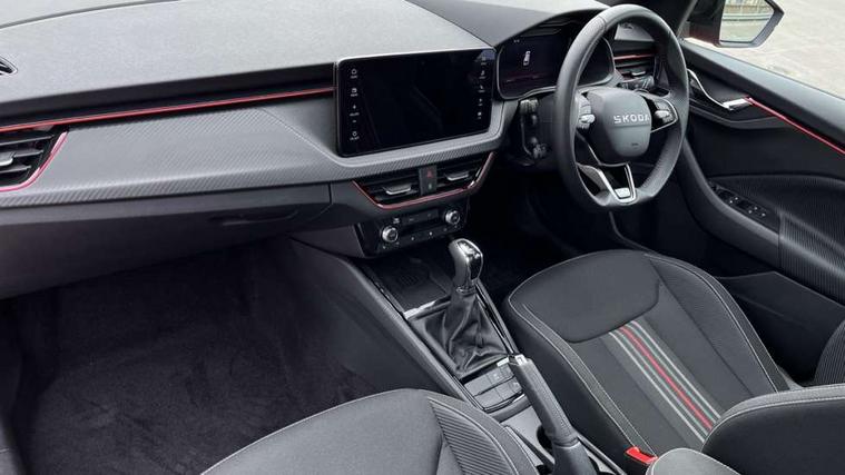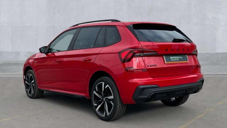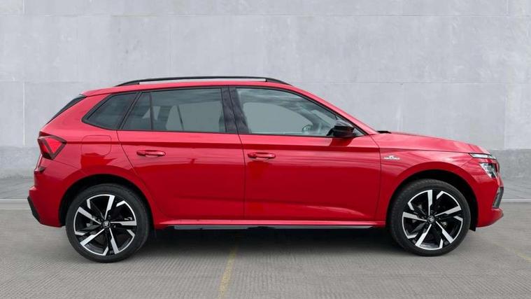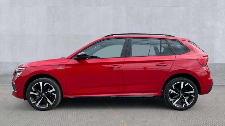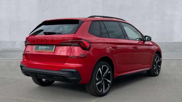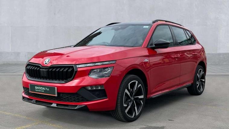 Advanced driver attention and drowsiness monitor, Bluetooth system, E-call, Front assist system, PAS, Rear parking sensors, Rear view camera, Service indicator, Speed limiter, Traffic sign recognition, Virtual cockpit with 10.25" display, Voice control system, Wireless smartlink, 4 USB C ports, 8 Speakers, 9.2" Skoda navigation display, DAB Digital radio, Auto dimming rear view mirror, Automatic headlight control with coming home and leaving home feature, Black door mirrors, Black radiator grille, Black rear diffuser, Black roof spoiler, Body colour bumpers, Body colour door handles, Boot lettering in black, Extended tailgate glass, Fixed panoramic sunroof with black roof rails, Front and rear electric windows, Heated rear window, LED daytime running lights, LED high beam, LED low beam, LED third brake light, Light sensors, Monte carlo plaque, Privacy glass, Rear side wing doors, Rear wiper, Ticket holder inside windscreen, 12V socket in luggage compartment, 3 seat bench in 2nd row, Aluminium pedals, Ambient lighting in white/red, Art leather carbon decor inserts, Art leather carbon door inserts, Black roof lining, Cargo elements, Chrome inner door handles, Driver and passenger sun visors with vanity mirror, Dual zone climate control, Front and rear roof lights, Front centre armrest, Front head restraints, Glove compartment with illumination, Height adjustable driver seat, Height adjustable front passenger seat, Ice scraper, Inner circulation control with pollen filter, ISOFIX on front passenger seat, Isofix preparation for back seats, Leather gearknob and handbrake lever, Manual lumbar support for front seats, Monte Carlo cloth upholstery, Net package and top tether hooks in boot space, Net under rear shelf, Pocket on the back of both front seats include mobile phone pockets, Rake/reach adjustable steering wheel, Reading lights, Rear centre armrests, Red hotstamping, Single front passenger seat, Sports seats, Textile floor mats, Third rear headrest, Top tether for front passenger seat, Umbrella in driver's door, Light and view plus package - Kamiq, 3x3 point rear seatbelts, Airbags - driver and front passenger, Disc brakes, ESP, Extended and predictive pedestrian/cyclist protection, Front passenger airbag deactivation switch, Front side airbags with curtain airbags, Hill hold control, Manual leather parking brake, Manual rear child locks, One tone horn, Seatbelt reminder for driver an co-driver, Traction control, Tyre pressure monitor, Anti-theft alarm system with interior monitoring, backup horn, towing protection and remote central locking with SAFE system, Anti-theft wheel bolts, Electronic engine immobilizer, 18" Ursa black diamond cut alloy wheels,