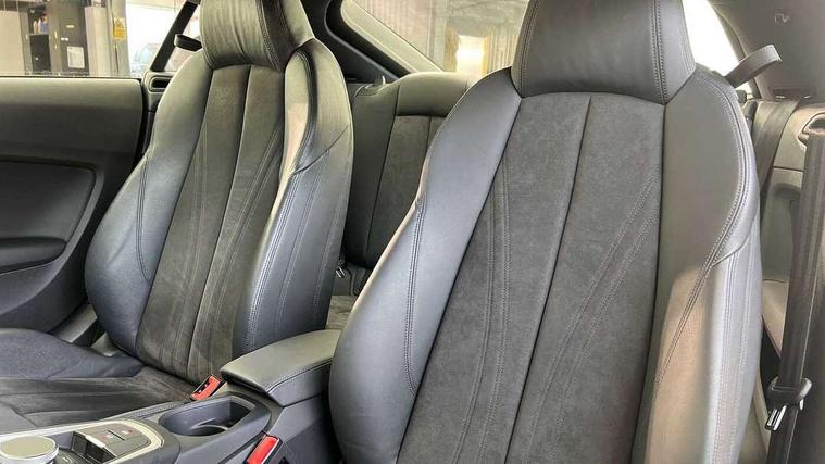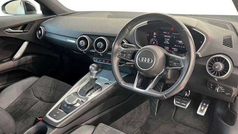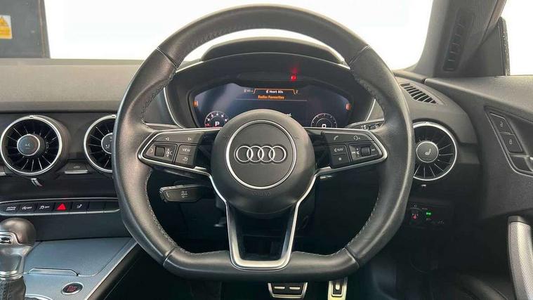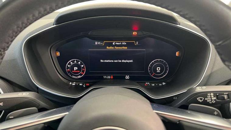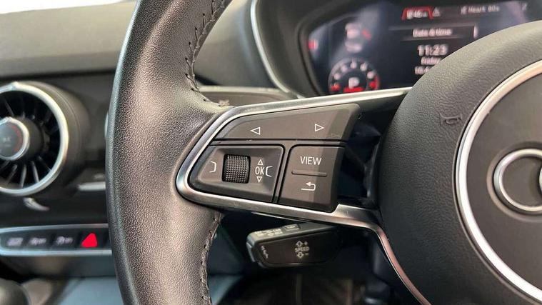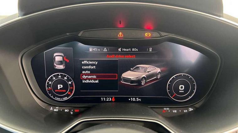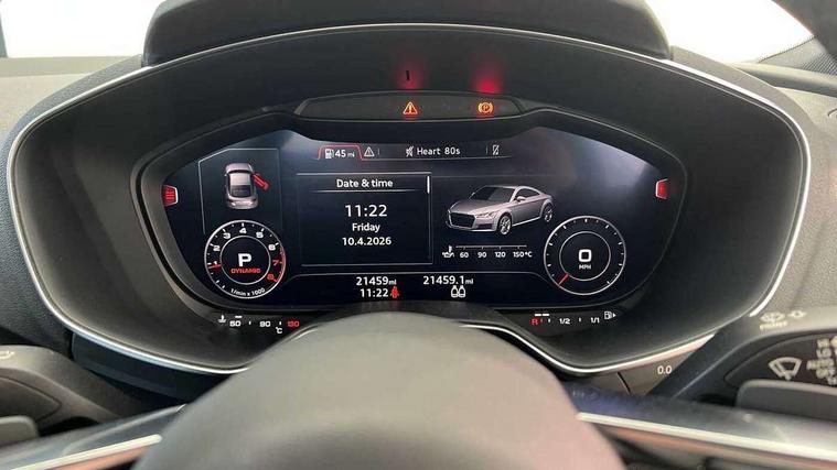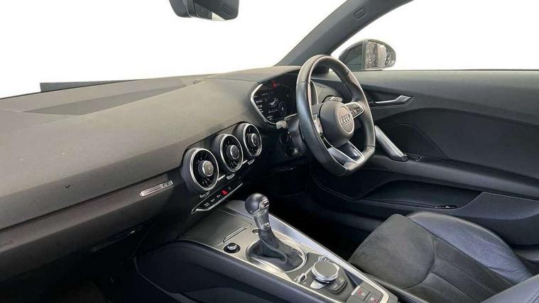Audi drive select with 4 Pre configured modes, Audi smartphone interface, Audi virtual cockpit - 12.3" high-resolution LCD display with fully customisable instrument cluster, Cruise control + speed limiter, Emergency call service, MMI touch panel, Mobile phone preparation with bluetooth interface, Progressive power assisted steering, Service interval indicator, Start/Stop system with energy recuperation, TP memo, Sports suspension, AM/FM radio, Bluetooth audio streaming, DAB Digital radio, MMI Radio with CD player and SD/XC card slot, Auto dimming rear view mirror, Electric folding door mirrors, Electric front windows, Electrically adjustable and heated door mirrors with integrated LED side indicators, Front fog lights, Green tinted heat insulating glass, LED 3rd brake light, Light and rain sensors, Rear boot, Retractable rear boot spoiler, Sunband for windscreen, Xenon headlights with LED daytime running lights with automatic headline range control + LED rear lights, brake lights and rear indicators, 12V socket, 2 rear seats, 3 spoke flat bottomed high multi-function leather sport steering wheel with gearshift paddles, Alcantara/Leather upholstery includes seat centre panels, door trim inserts in black Alcantara with side bolsters, head restraints in black leather, Aluminium door sill trims, Front centre armrest, Front passenger seat, Front sports seats, Heated front seats, Height adjustable driver's seat, Height adjustable front head restraints, Height/reach adjust steering wheel, ISOFIX child seat mounting for front passenger seat with airbag deactivation, Rear head restraints, Rear top tether child seat ISOFIX attachment, Split folding rear seat, Black styling pack - TT, Non smoking pack - TT/TT RS, 3 point front seat belts, ABS, ASR traction control, Curtain airbags, Driver and front passenger airbag with front passenger airbag deactivation, EDL traction control, Electromechanical parking brake, ESP, First aid kit, Front side airbags, Head airbags, Hill hold assist, Seatbelt warning, Tyre pressure loss indicator, Warning triangle, Anti theft alarm, Anti theft wheel bolts, Immobiliser, Keyless Go, Remote central locking, Aluminium design inlays, Tool kit, Tyre repair kit,