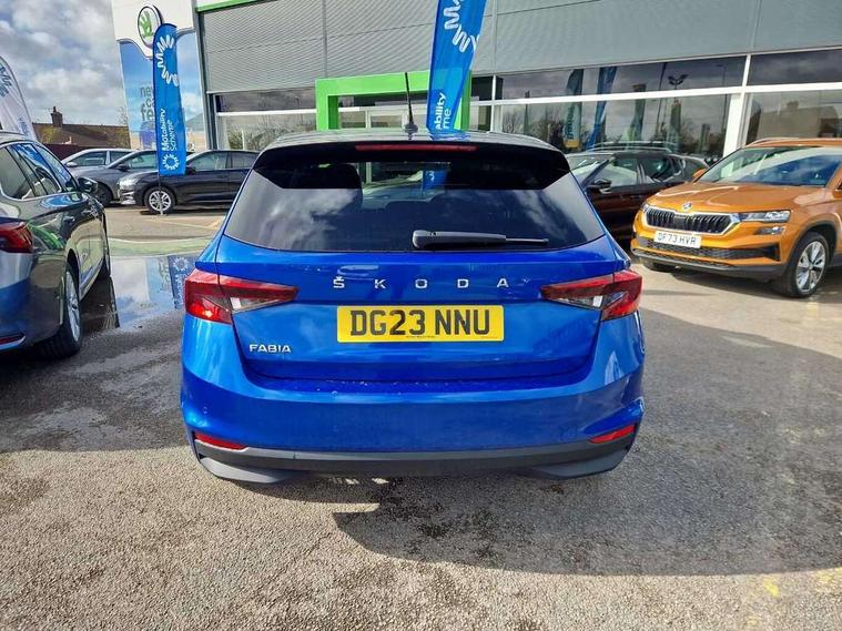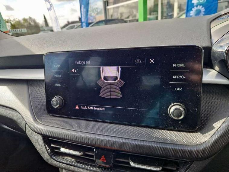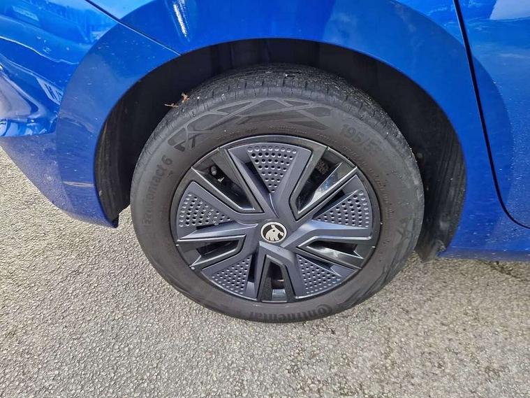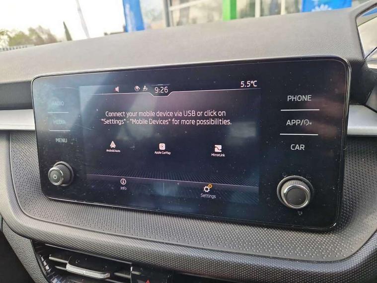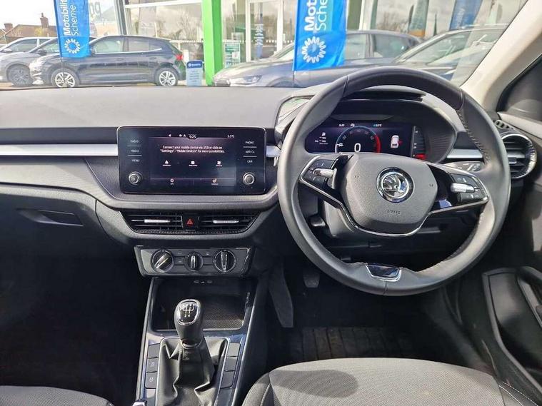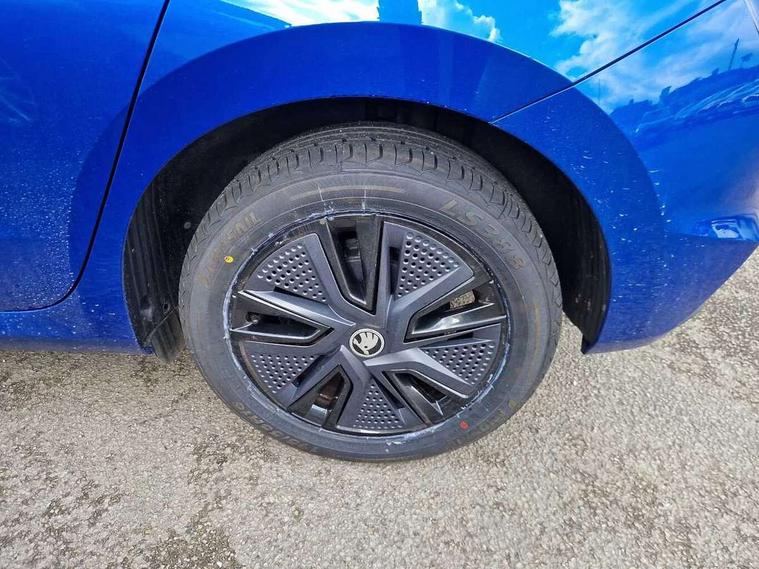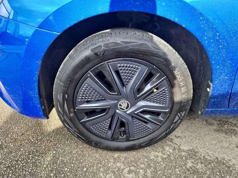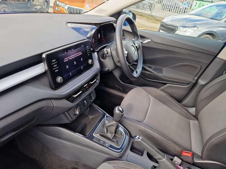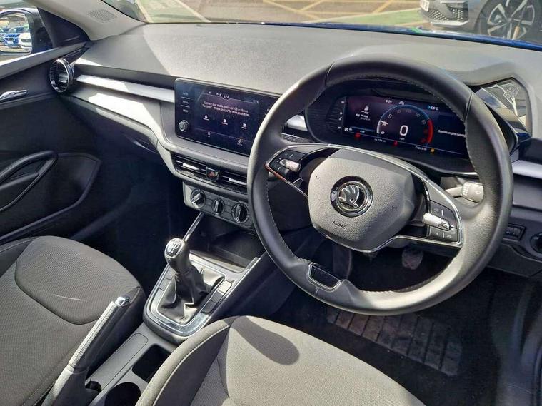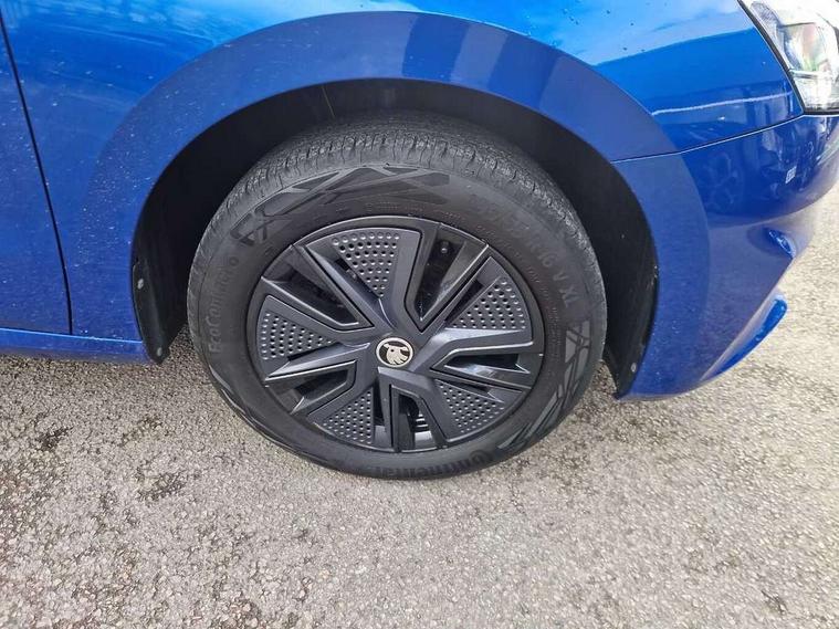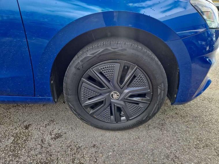 Bluetooth connection, Driver alert system - DAS, Electromechanical power steering, Exterior temperature gauge, Lane assist including road edge detection, Service interval indicator, Virtual cockpit with 10.25" colour display, 2x USB-C in the front (for data transmission and charging), 6 Speakers (4 in front and 2 in rear), Auxiliary socket for external MP3 player, Bolero radio with 8" colour display, DAB digital radio reception, Basic rear lights, Body coloured bumpers, Dimming rear view mirror with black frame, Door mirror integrated indicators, Electrically adjustable and heated door mirrors, Electrically adjustable front windows with function auto up/down, Front window wiper intermittent control, Headlight range control - Automatic, Ice scraper in fuel cap, LED daytime running lights with coming and leaving home feature, Mechanical adjustable rear windows, Privacy glass, Rear LED fog light, Rear side wing doors, Rear window wiper with washing nozzles, Roof mounted spoiler, SKODA tailgate lettering in chrome, Third brake light, 3 rear headrests, Backrest split and folding, Central console with fixed cup holder and storage box, Chrome handbrake release button, Fabric upholstery, Gearshift knob/handle in leather, Grain satin black interior door handles, Hand brake lever handle in leather, Height adjustable front headrests, Height adjustable steering wheel, ISOFIX and TopTether anchorage points to the outer rear seats, ISOFIX and TopTether on the front passenger seat, Luggage compartment lighting, Pollen filter, Rear seat bench unsplit, Single front passenger seat, Storm grey headlining, Sun visors with mirror and airbag label on passenger side, Ticket holder, Umbrella in drivers door, 3-point height adjustable front seats belts with pretensioner and force limiter, Automatic warning lights in case of crash, Driver and passengers airbag with switch off function, e-Call+, ESC including ABS, MSR, ASR, EDS, HBA and XDS, Front and rear seat belt warning, FRONT ASSIST (AEB City and AEB Inter Urban), Front side airbags, Head airbags, One tone horn, Pedestrian protection, Three rear 3-points safety seat belts with pretensioner and force limiter including stop function for outer rear seat belts, Tyre pressure monitoring system, Anti-theft alarm system including immobiliser, interior monitoring, backup horn, and towing protection, Anodized cross line upper decorative trim, Colour Edition air vents, Grain satin black central console cover, Grain satin black lower decorative trim, Satin black door and side trim panel in front, Anti-theft wheel bolts protection, Super-low rolling resistance tyres,