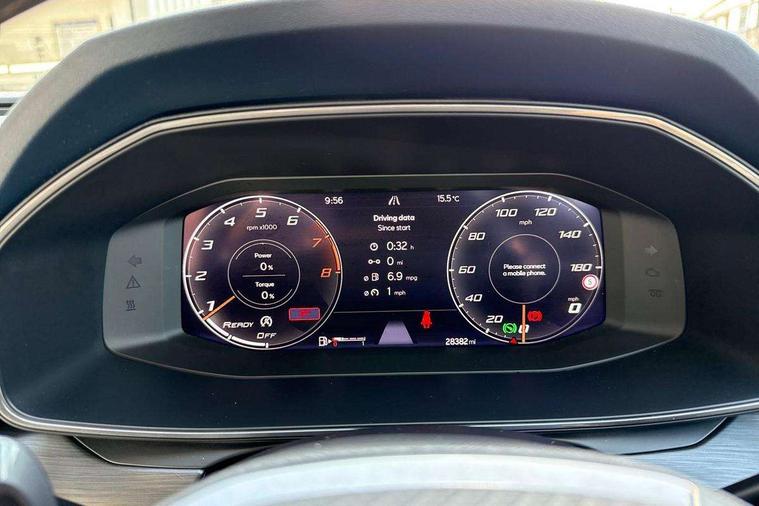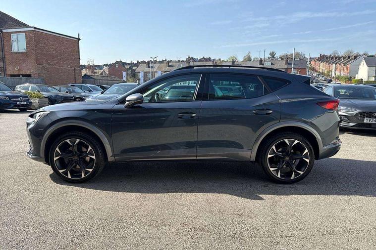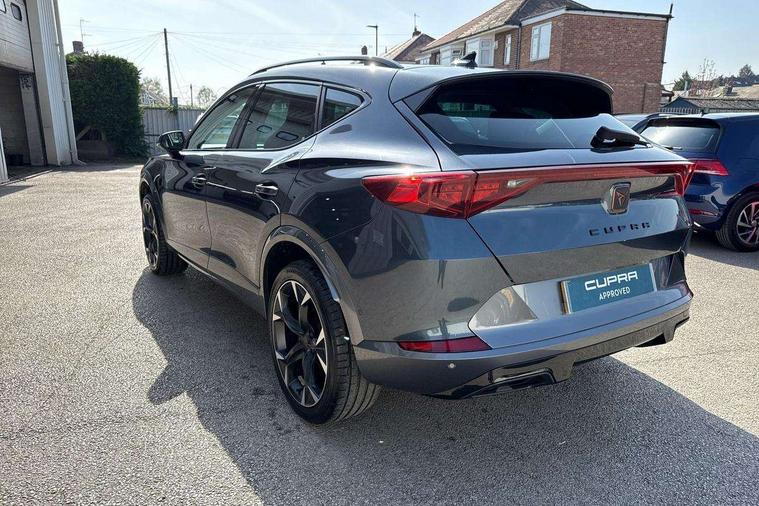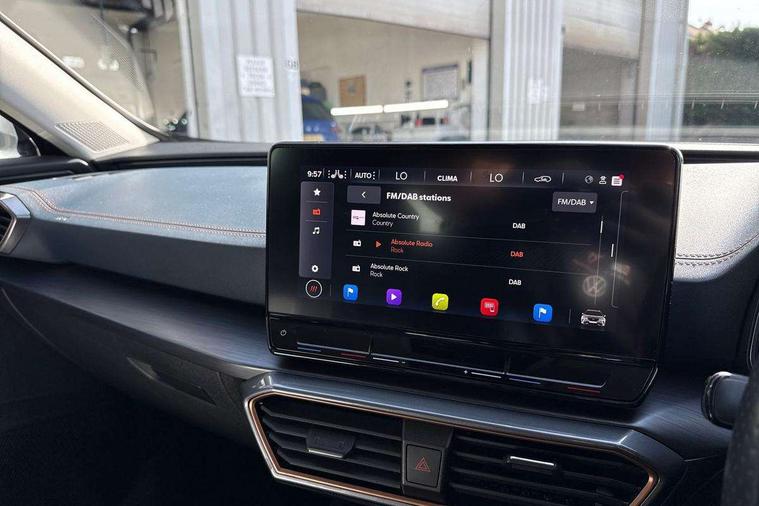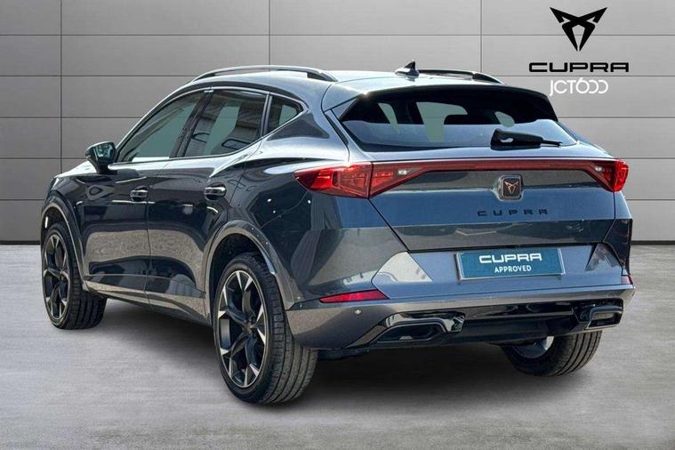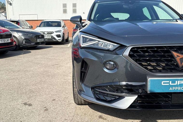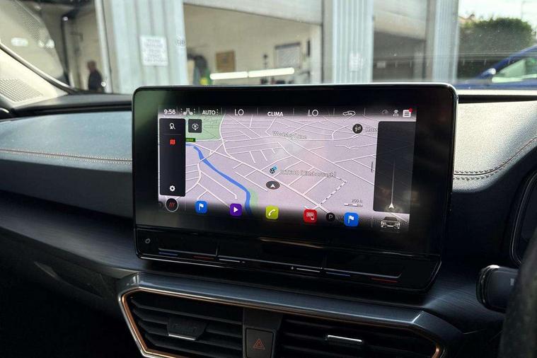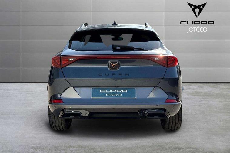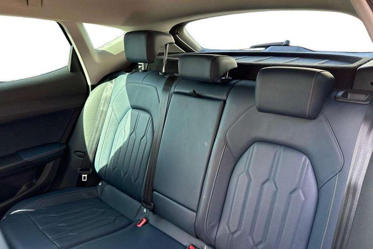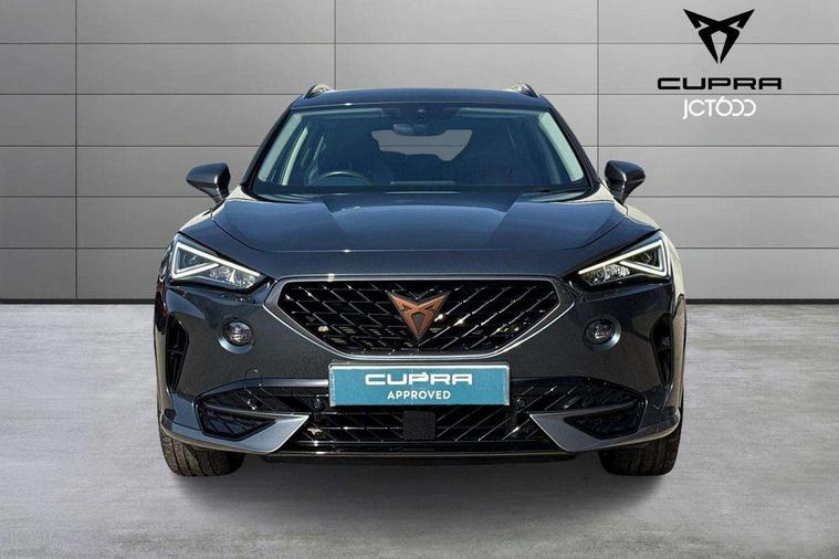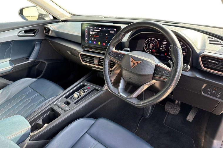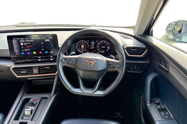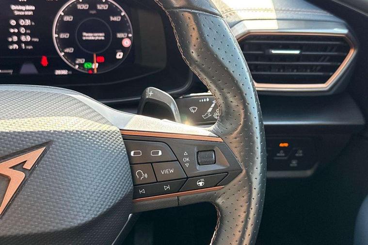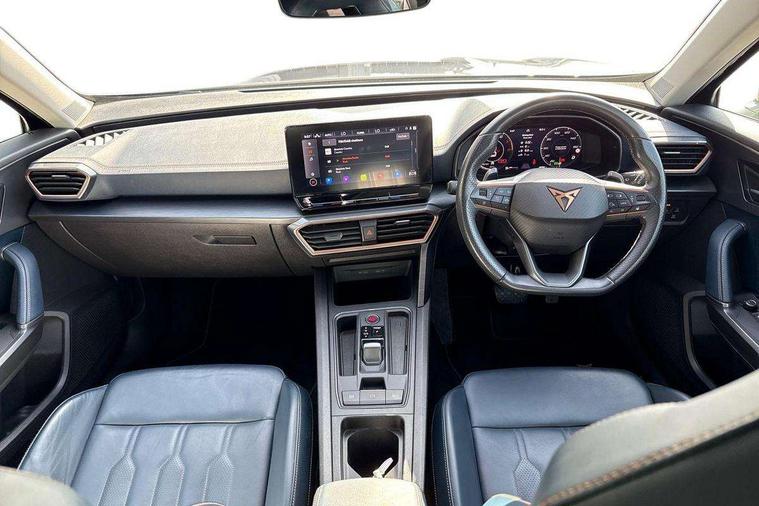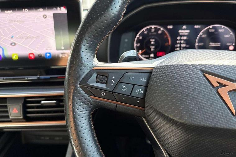 Digital cockpit and configurable dashboard, Driver alert system, Driving profile selection, E-call, Forward collision warning with automatic braking, Lane assist, Navigation system with 12'' Touchscreen Display, Park assist (inc front/rear parking sensors), PAS, Predictive adaptive cruise control with speed limiter, Rear view camera, RPM, trip computer, outside temp gauge, instrument light brightness, low fuel warning light, lights on reminder, gearshift indicator, Service interval indicator, Start/stop system with regenerative braking, Voice control system, Wireless apple carplay, Wireless phone charger, Electronic locking differential and dynamic traction support, Standard suspension, 2 front and 2 rear USB type C sockets, Auxiliary input socket, DAB radio, Auto dimming rear view mirror, Body colour door handles, Body coloured bumpers, Dark grey wing mirror, Daytime running light with automatic headlight control and coming home feature, Dynamic headlight range control, Electric front/rear windows, Electrically adjustable heated and folding door mirrors with memory function, Front fog lamps with cornering function, Gloss black roof rails and window surrounds, LED Headlights, LED Taillights with dynamic indicator, Rain sensing wipers, Rear diffuser with black simulated exhaust pipes, Rear side wing doors, Rear wash/wipe, Third brake light, Tinted rear windows, Welcome lights, 12v power supply in centre console, 12V socket, 12v socket in loadspace, 2 front and 2 rear reading lights, 230V socket, 3 seat bench in 2nd row, 60/40 split rear bench seat with armrest and mechanical seat release, Dust/pollen filter, Front and rear head restraints, Front centre armrest, Height/reach adjust steering wheel, Illuminated interior front door sills, Illuminated sunvisor with mirror, Isofix, Leather multi function heated steering wheel with gear shift paddles, Luggage tie-down hooks, Single front passenger seat, Three zone climate control with control panel in rear, Variable luggage/load compartment floor, Wraparound lighting, Genuine Nappa leather Pack - Cupra, 3 point seatbelts on all rear seats, ABS, Brake control system - ESC and brake booster, Child proof door locks, Driver and front passenger airbags with front passenger airbag de-activation, Electronic parking brake, Front and rear disc brakes, Front side curtain airbags, Hill hold control, Seat belt reminder for front and rear seats, Tyre pressure monitoring system, Anti theft alarm system, Keyless entry and start system (KESSY), Locking wheel bolts, Copper and aluminium interior detailing, 19" 'Exclusive' machined sport matte black and silver alloy wheels,