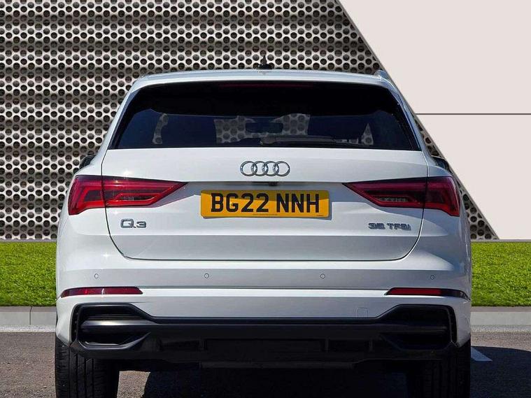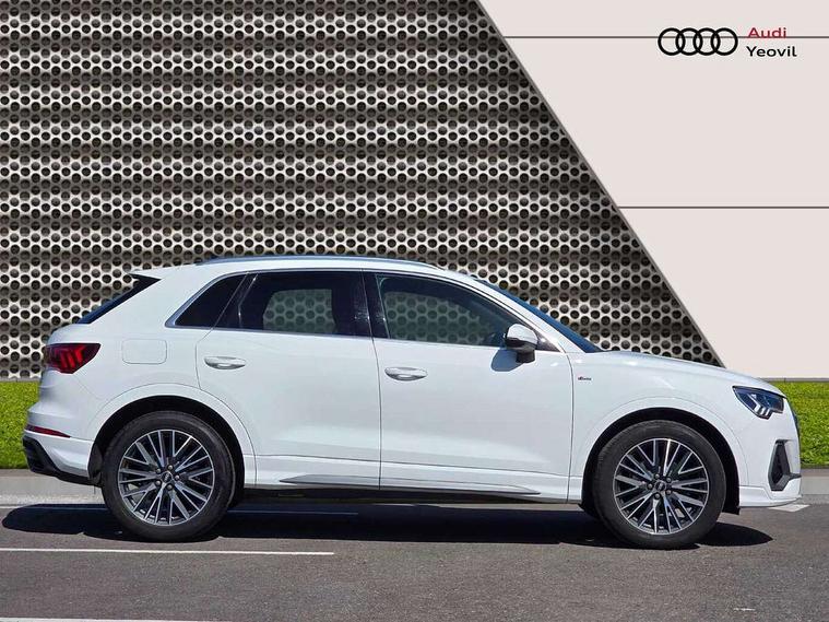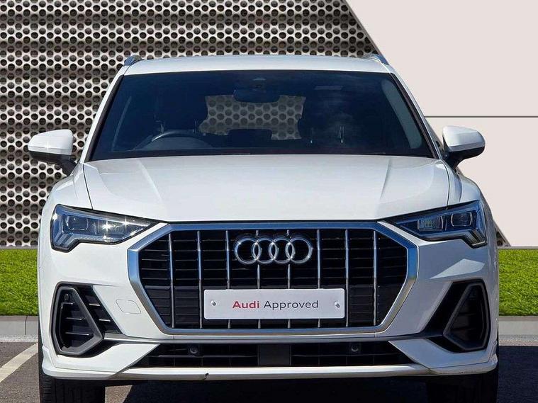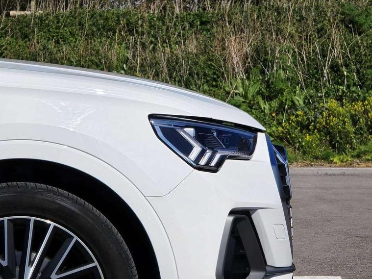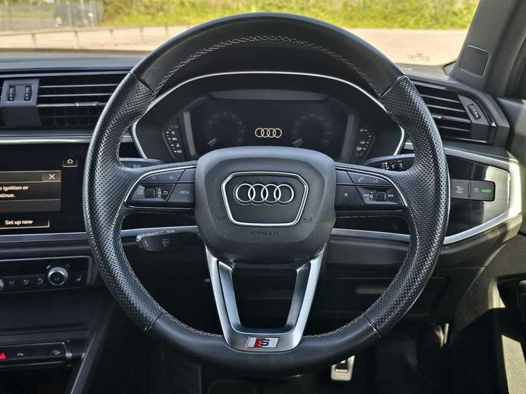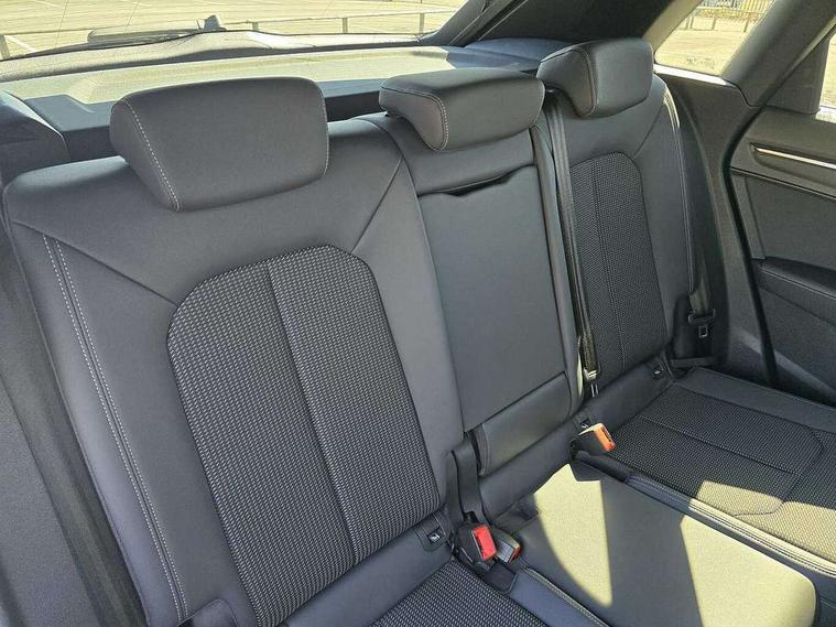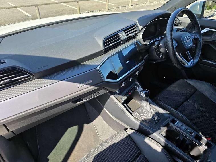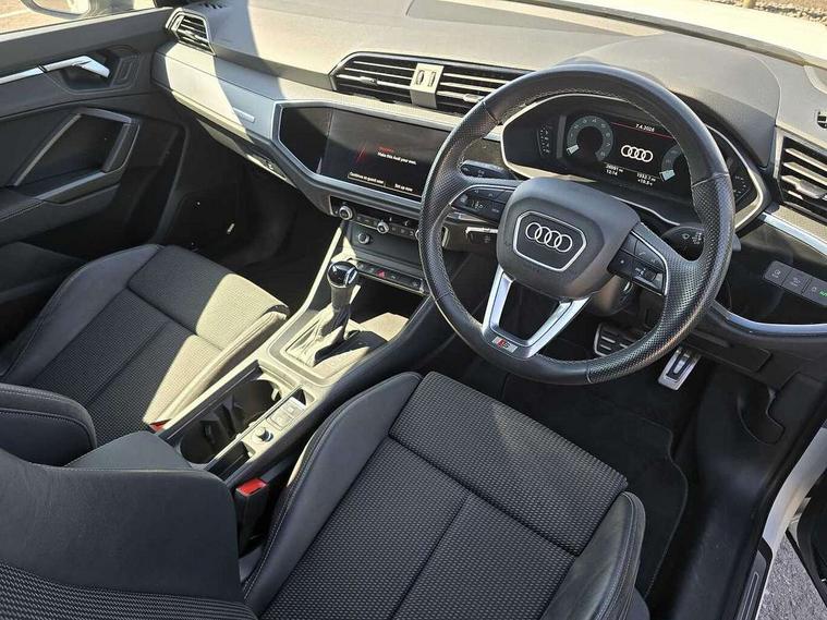 Amazon alexa Integration, Audi connect safety and service (e-call), Audi drive select, Audi lane departure warning, Audi Virtual Cockpit - 10.25" display, Bluetooth interface, Camera based traffic sign recognition, MMI Navigation Plus with high resolution 10.1 inch touchscreen colour display, Power operated tailgate, Progressive steering, Service interval indicator, Smartphone interface includes wireless Apple carplay/Android Auto, Start stop system with recuperation, Voice control system with natural language interaction, 48V Mild hybrid technology, Sports suspension, 2 USB-C ports with charge and data functions, 6 passive loudspeakers, DAB digital radio module, Acoustic windscreen, Aluminium roof rails, Aluminium window trim, Auto dimming frameless rear view mirror, Body coloured bumpers, Electrically folding, adjustable and heated door mirrors with integrated LED side indicators and kerb view function for passenger side, Front and rear electric windows, Front fog lights, Front side air inlets in matt platinum grey, Front spoiler blade in matt platinum grey, Grille vertical bars in aluminium silver/Matt, High gloss black finish B and C pillars, LED headlights with LED daytime running lights, LED rear lights, LED third brake light, Privacy glass dark tinted rear and rear-side windows (from B-pillar backwards), Rain and light sensors, Rear diffuser strip in matt titanium black, Rear side wing doors, Rear wiper, S line badges on front wings, S Line front and rear bumpers, Side skirt insert in matt Platinium grey, Silver chrome grille surround, Titanium black radiator grille, Variable front intermittent wipers, 12V socket in rear centre console, 3 seat bench in 2nd row, 40:20:40 folding with manual adjustment for 60:40 forwards/backwards position and backrest angle, Adjustable rear seat bench/backrest with centre armrest and cupholder, Black cloth headlining, Dual zone electronic climate control, Front and rear black floor mats with contrast stitching in rock grey, Front and rear headrests, Front and rear roof module including reading lights, Front centre armrest, Glove compartment lighting, Height and reach adjustable steering wheel, Illuminated door sill trims with S logo, ISOFIX child seat mounting for front passenger with airbag deactivation and outer rear seat including top tether attachment point for outer rear seats, Luggage compartment light, Manual front seats with height adjustment, Perforated leather gearknob, Single front passenger seat, Stainless steel luggage compartment sill finisher, Stainless steel pedals, Non smoking pack - Q3, 3x3 point rear seatbelts, 6 airbags - Driver, front passenger, curtain and side windows, Audi pre-sense front with pedestrain and cyclist recognition, Electromechanical parking brake, Electronic stabilisation control including ABS, ASR and EDL, Front seatbelt reminder, Hill descent control, Hill hold assist, Manual child lock in rear doors, Pre sense basic, Seatbelt monitoring, Tyre pressure warning, Warning triangle and first aid kit, Anti theft alarm, Anti theft wheel bolts, Immobiliser, Remote central locking, Dark matt brushed aluminium inlay, Detail dashboard around MMI touch colour display in glass look, black with surround in aluminium look, Leatherette door armrest, Tool kit, Tyre repair kit,