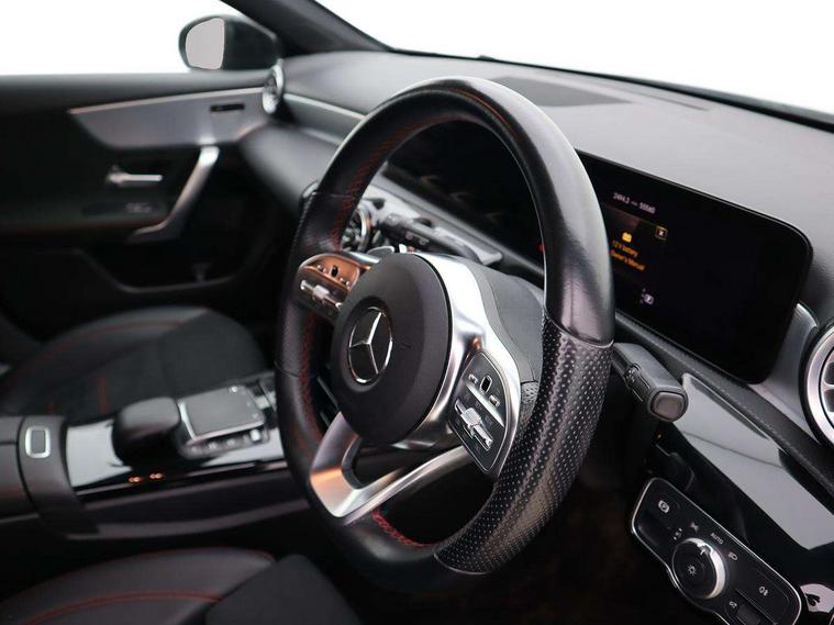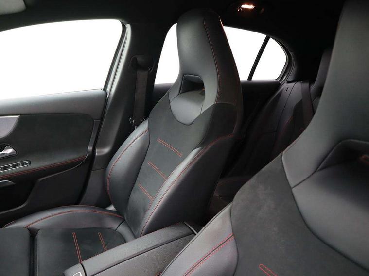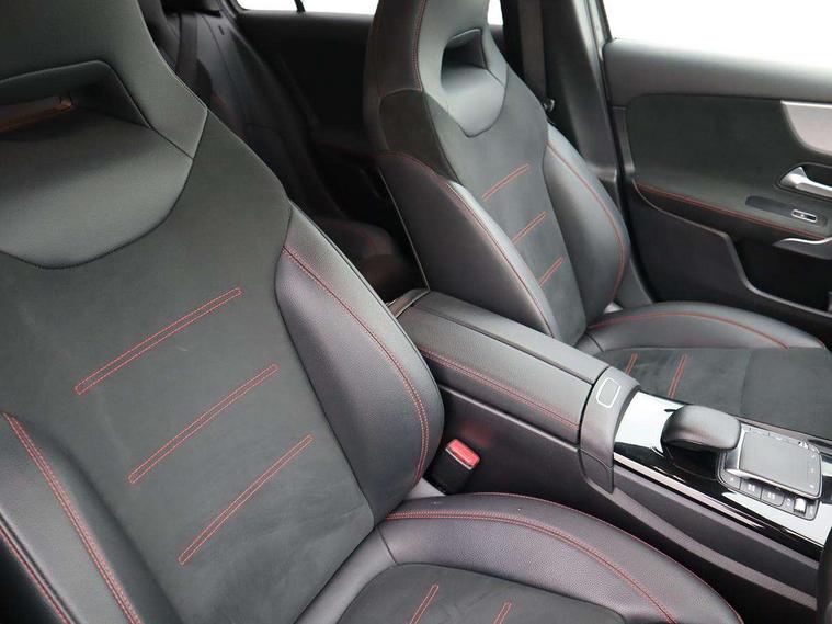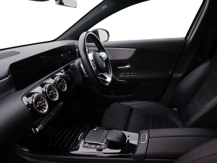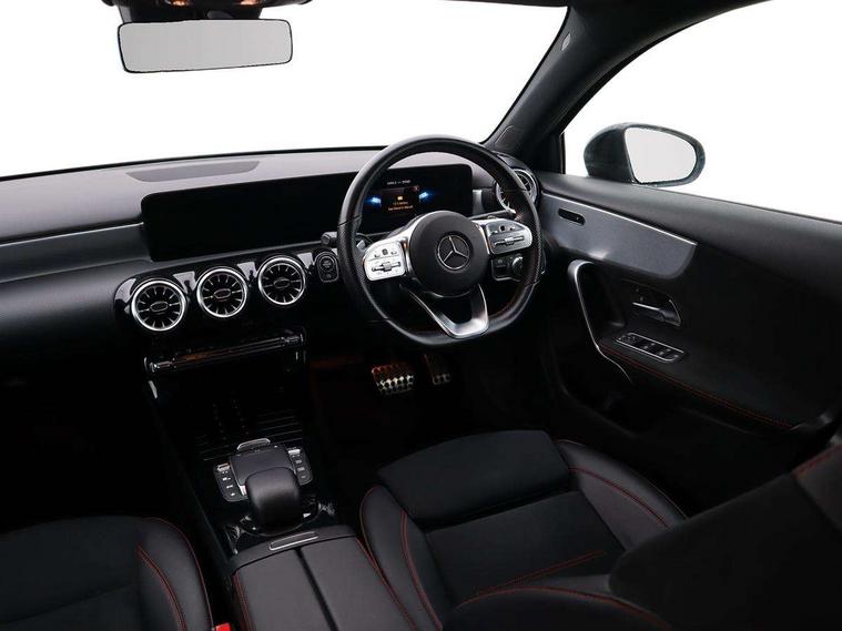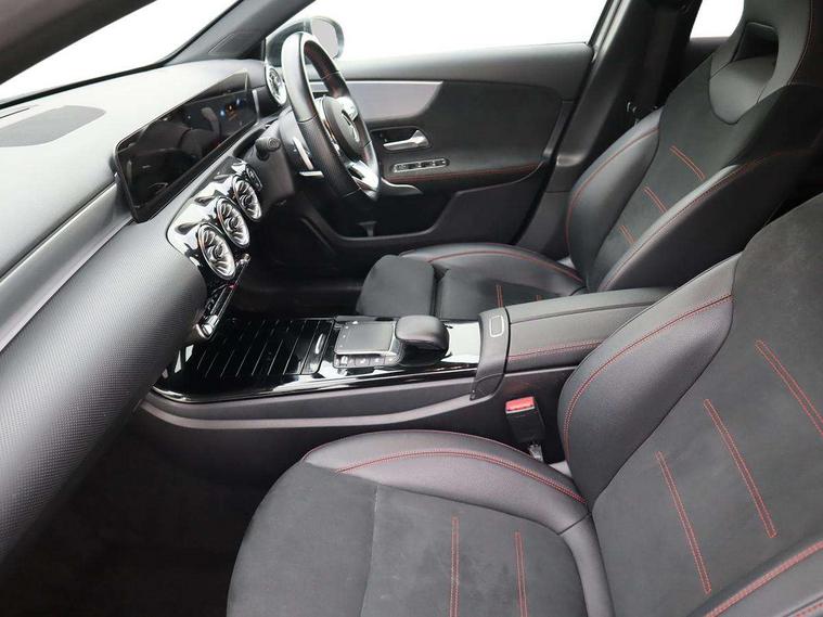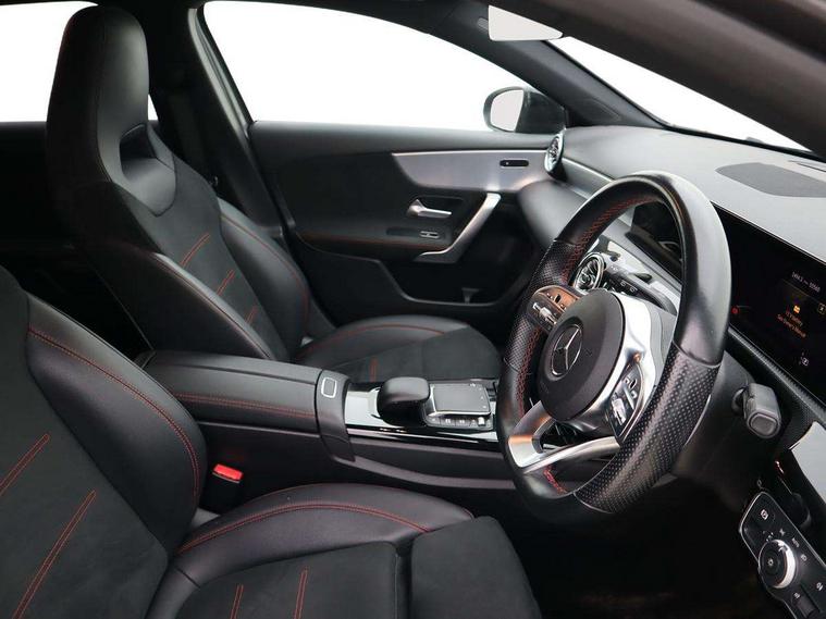10.25" Digital instrument cluster display screen, 10.25" media display, 180 degree rear view camera with parking guidelines, Active parking assist with visual and audible warning of detected obstacles, Attention assist, Brake pad wear indicator warning light, Car wash mode, Cruise control + speed limiter, Direct steering, Dual bluetooth interfaces, DYNAMIC SELECT with a choice of driving modes (ECO, Comfort, Sport and Individual), ECO start/stop function, Fluid level warning indicator for fuel, oil, coolant and washer fluid, Hard-disk navigation, Hey Mercedes Voice activation, Lamp failure indicator, Lane keeping system, Mercedes me connect including emergency call system, accident recovery, breakdown and maintenance management, Mercedes me remote services, Outside temperature gauge, Owners manual in English, Pre-installation for private car sharing, Preinstallation for Mercedes Benz link, Service indicator (ASSYST), Smartphone integration with Apple CarPlay and Android auto, Speed limit assist, Speed sensitive power steering, Trip computer, Ultrasonic sensors positioned in the front and rear bumpers, Lowered comfort suspension, Rear axle torsion beam, 2 USB ports (type C) in rear stowage compartment and one in front of center console, 6 speakers, DAB Digital radio, MBUX multimedia system with DAB digital radio and touchpad including satellite navigation, Mercedes-Benz sound system - 100W, 4 Electric Front and Rear windows, Adaptive brake lights, AMG bodystyling - Front apron with splitter in chrome, rear apron with chrome trim and chrome visible trim elements in tailpipe, Automatic headlights, Black weather strip, Body colour bumpers, Body colour door handles with chrome inserts, Body colour side skirt, Electric adjustable and heated door mirrors with integrated LED side indicators, Exclusive diamond radiator grille, Exhaust system - Twin visible tailpipes in polished stainless steel, Headlamp assist automatic headlamp activation, Heated glass rear windscreen + timer control, LED High level third brake light, LED high performance headlamps with integrated LED daytime running lights, LED tail lamp, Privacy glass, Radio aerial, Rain sensing windscreen wipers with two sensitivity settings, Rear fog lights, Rear side wing doors, Rear wiper, 3 seat bench in 2nd row, 3 Spoke flat bottom leather multi function steering wheel with perforated leather in grip area, 40:20:40 split folding rear seats, Artico man-made leather/Microfibre Dinamica upholstery with red contrast stitching, Auto Mercedes-Benz child seat recognition sensor, Black air vents with surround in silver chrome, Black roof lining, Brushed stainless steel sports pedals with rubber studs, Controller on centre console with chrome surround, Floor mats with AMG lettering, Front centre armrest with storage compartment, Front seat backs luggage nets, Galvanished gear shift paddles on steering wheel, Heated front seats, Height/reach adjustable steering column, Illuminated Mercedes Benz lettering front door sills with changeable cover, Interior lighting - 64 colour Ambient lighting, Interior mirror with reading lamps in black and frameless, Manual height adjustable front seats, Rear armrest with 2 cupholders, Rear head restraints, Seat occupancy sensor for front passenger seat, Single front passenger seat, Sports seats with integrated headrests, Stowage compartment in centre console with retractable cover, Sunvisors with illuminated vanity mirrors, Touchpad on center console, Twin front cupholders, Two zone thermotronic luxury automatic climate control, Light and sight pack - A Class, Mirror package - A Class, Night pack - A Class Saloon/Hatchback, Seat comfort pack - A Class, 3 rear 3 point seatbelts, ABS with Brake Assist, Active bonnet, Active brake assist includes forward collision warning system with autonomous braking, Adaptive brake assist with hold function and hill start assist, Childproof locks manually operated for rear doors and electrically operated for rear power windows, Crash responsive emergency lighting, Driver and passenger head and side airbags, Drivers knee airbag, Dual stage driver/passenger airbags, Electronic parking brake, ESP curve dynamic assist, ESP with ASR, Front and rear seatbelt reminder, Front brake callipers with Mercedes Benz lettering, ISOFIX and top tether child seat fixing points in two outer rear seats, Tyre pressure monitoring system, Warning triangle and first aid kit, Window airbags, Alarm system/interior protection/immobiliser, Keyless entry lock/unlock, Keyless Go, Remote central locking and crash sensor with emergency opening function, Urban guard vehicle protection system with immobiliser and interior protection, Black seatbelts, Matrix look light longitudinal grain aluminium trim element, 18" AMG 5 twin spoke light alloy wheels aerodynamically optimised painted in black with highsheen finish, Summer tyres, Tirefit sealant kit,
