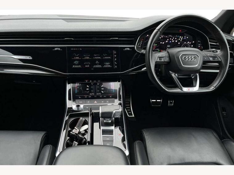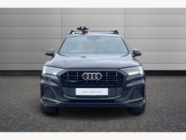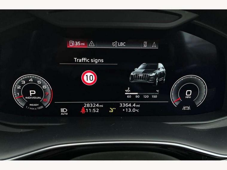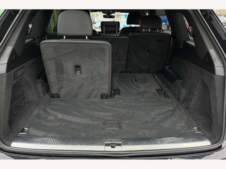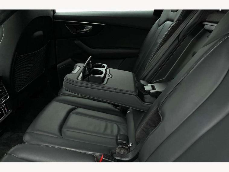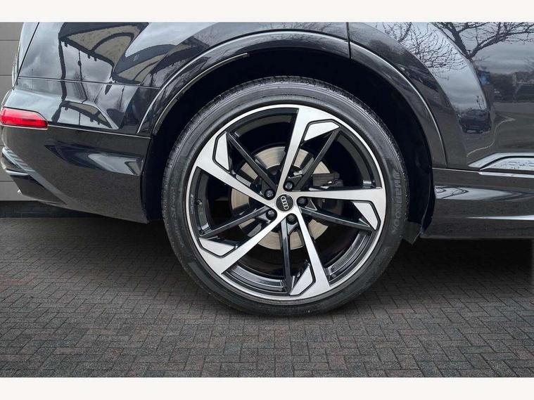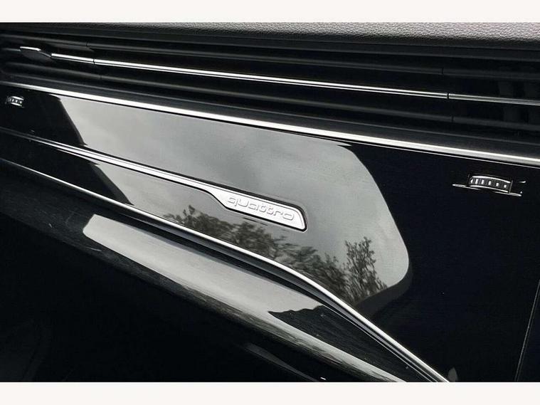 Audi connect safety and service (e-call), Audi drive select (Auto, Comfort, Dynamic, Efficiency, Individual, Off-road and All road), Audi phone box with wireless charging, Audi smartphone interface includes wireless Apple carplay/Android Auto, Camera based traffic sign recognition, Electromechanical steering, MMI navigation plus with MMI touch screens includes 10.1" and 8.6" screens with haptic feedback, Natural voice recognition, Parking system plus - front + rear sensors, Power operated tailgate, Rear view camera, Start/stop system, 48V Mild hybrid technology, 85 litre fuel tank, Adaptive air sports suspension, Quattro all wheel drive with self locking centre differential, Audi music interface - front 2 USB-C ports with charger and data functions, Audi sound system with 6 channel amplifier, 180 watt amplifying capacity and 10 loudspeakers including subwoofer, DAB digital radio module, Audi matrix LED headlights with dynamic front and rear indicators, Auto dimming frameless rear view mirror, Black roof rails, Bumpers in contrast paint scandium grey finish includes door trim and wheel arch trim strips, inlays in door strip contain quattro embossing, Electrically adj heated/folding + automatically dimming exterior mirrors with memory + automatic kerb side function for passenger side exterior mirror, Heat insulating glass in windshield, Integrated LED indications in door mirrors, LED daytime running lights, LED rear tail lights, Privacy glass - dark tinted rear and rear side windows from B-pillar backwards, 4 zone deluxe automatic climate control, 7 seat layout with ISOFIX points for the front passenger seat and rear passenger seat, Black cloth headlining, Comfort front centre armrest, Folding rear seats, Front head restraints, Front/rear floor mats, Heated front seats, LED interior ambient lighting, Luggage compartment cover, Luggage compartment sill protection in stainless steel, Rear head restraints, Stainless steel pedals, Sunvisors with illuminated vanity mirrors, Tool kit, Titanium black styling pack - Q7/SQ7, 3 point seatbelts on all rear seats, Audi pre sense front, Driver and front passenger, front side and curtain airbags, Electromechanical parking brake, Electronic Stabilisation Control (ESC) including ABS, ASR and EDL, Extended pedestrian protection measures, Hill hold assist, Seatbelt monitoring, Tyre pressure loss indicator, Warning triangle and first aid kit, Anti theft alarm, Anti-theft wheel bolts and wheel loosening detection, Keyless go with remote central locking, Polished oak trim with grey finished, Tyre repair kit,