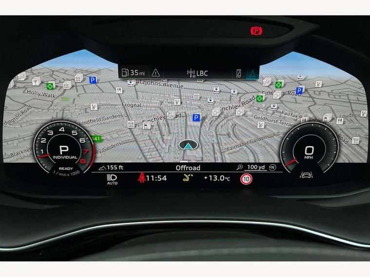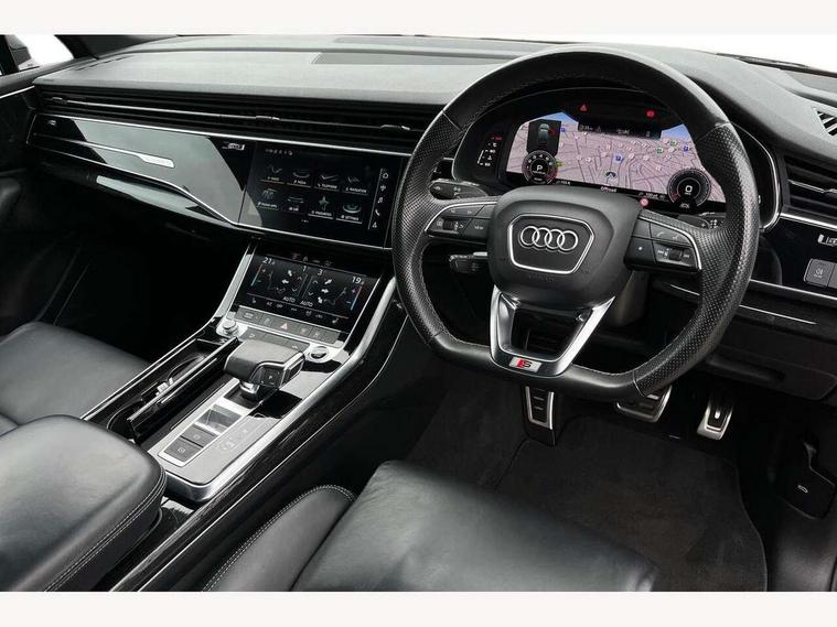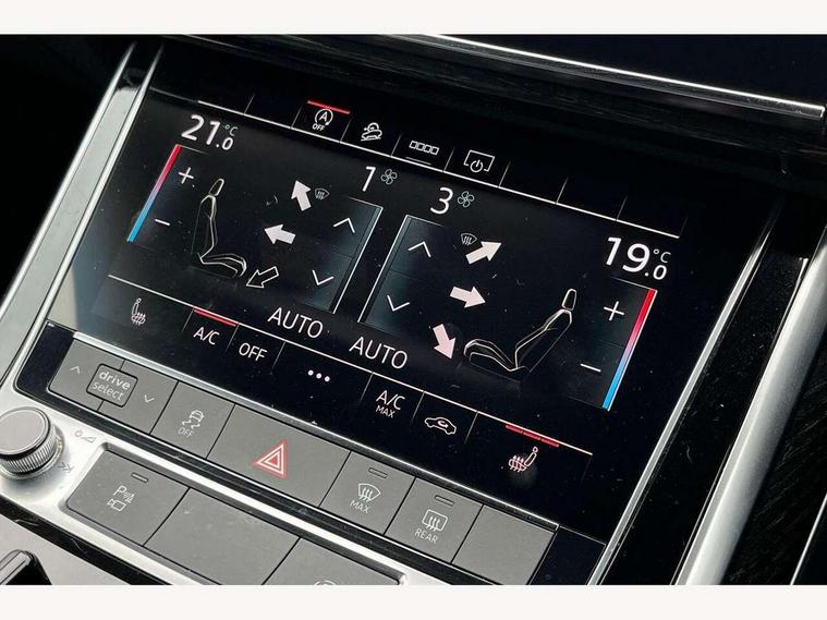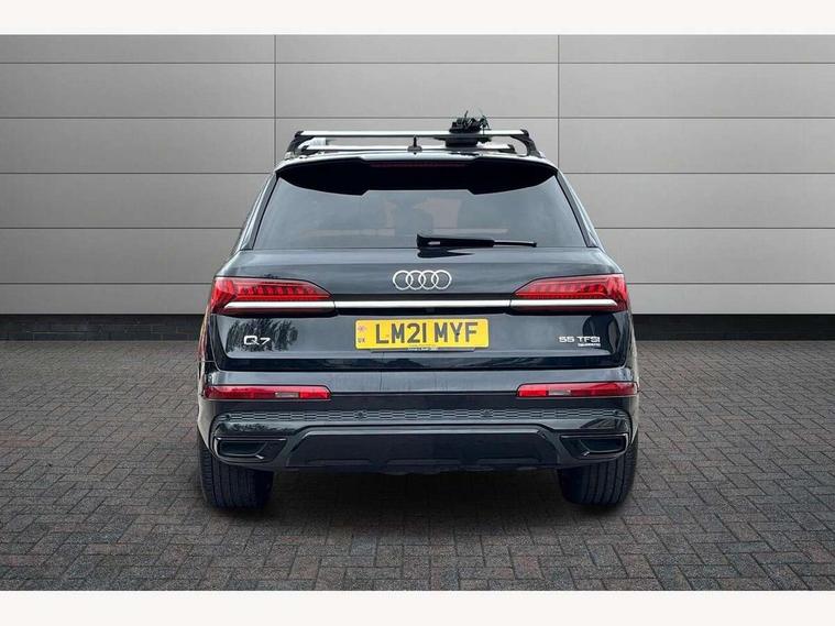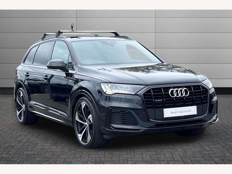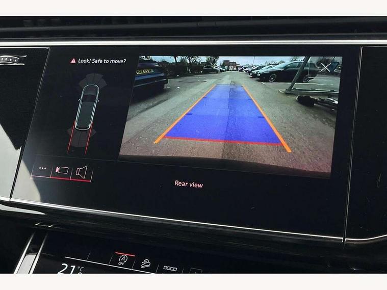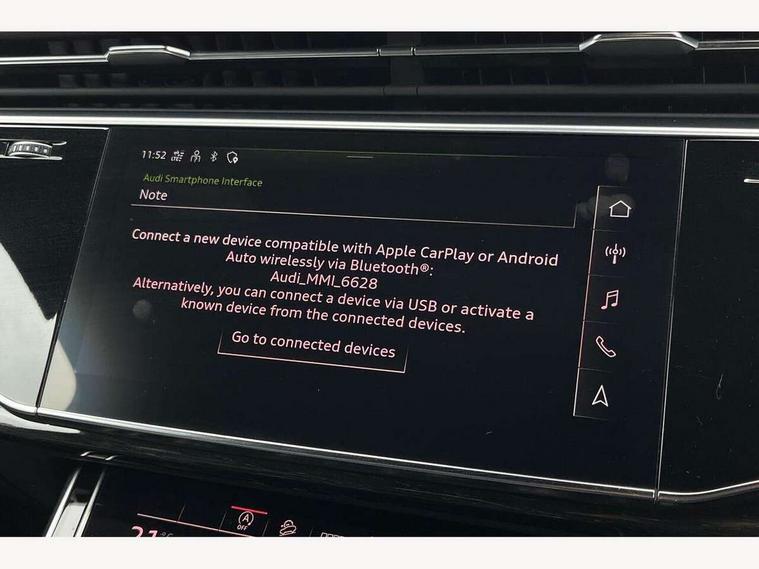 Audi connect safety and service (e-call), Audi drive select (Auto, Comfort, Dynamic, Efficiency, Individual, Off-road and All road), Audi phone box with wireless charging, Audi smartphone interface includes wireless Apple carplay/Android Auto, Camera based traffic sign recognition, Electromechanical steering, MMI navigation plus with MMI touch screens includes 10.1" and 8.6" screens with haptic feedback, Natural voice recognition, Parking system plus - front + rear sensors, Power operated tailgate, Rear view camera, Start/stop system, 48V Mild hybrid technology, 85 litre fuel tank, Adaptive air sports suspension, Quattro all wheel drive with self locking centre differential, Audi music interface - front 2 USB-C ports with charger and data functions, Audi sound system with 6 channel amplifier, 180 watt amplifying capacity and 10 loudspeakers including subwoofer, DAB digital radio module, Audi matrix LED headlights with dynamic front and rear indicators, Auto dimming frameless rear view mirror, Black roof rails, Bumpers in contrast paint scandium grey finish includes door trim and wheel arch trim strips, inlays in door strip contain quattro embossing, Electrically adj heated/folding + automatically dimming exterior mirrors with memory + automatic kerb side function for passenger side exterior mirror, Heat insulating glass in windshield, Integrated LED indications in door mirrors, LED daytime running lights, LED rear tail lights, Privacy glass - dark tinted rear and rear side windows from B-pillar backwards, 4 zone deluxe automatic climate control, 7 seat layout with ISOFIX points for the front passenger seat and rear passenger seat, Black cloth headlining, Comfort front centre armrest, Folding rear seats, Front head restraints, Front/rear floor mats, Heated front seats, LED interior ambient lighting, Luggage compartment cover, Luggage compartment sill protection in stainless steel, Rear head restraints, Stainless steel pedals, Sunvisors with illuminated vanity mirrors, Tool kit, Titanium black styling pack - Q7/SQ7, 3 point seatbelts on all rear seats, Audi pre sense front, Driver and front passenger, front side and curtain airbags, Electromechanical parking brake, Electronic Stabilisation Control (ESC) including ABS, ASR and EDL, Extended pedestrian protection measures, Hill hold assist, Seatbelt monitoring, Tyre pressure loss indicator, Warning triangle and first aid kit, Anti theft alarm, Anti-theft wheel bolts and wheel loosening detection, Keyless go with remote central locking, Polished oak trim with grey finished, Tyre repair kit,