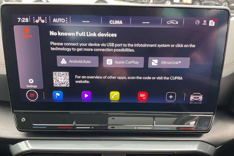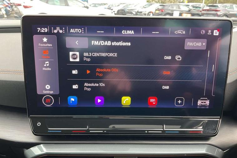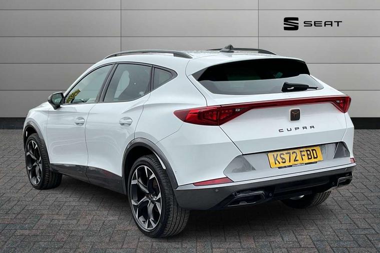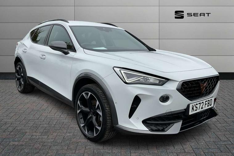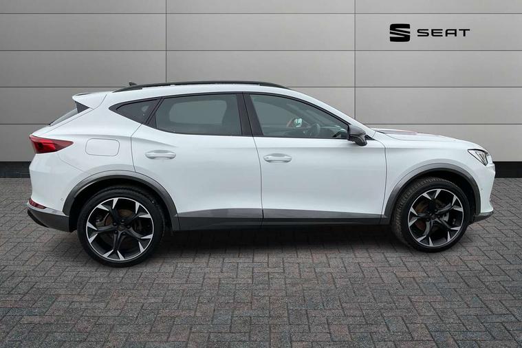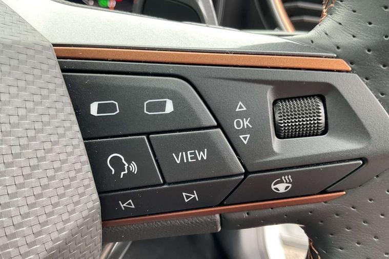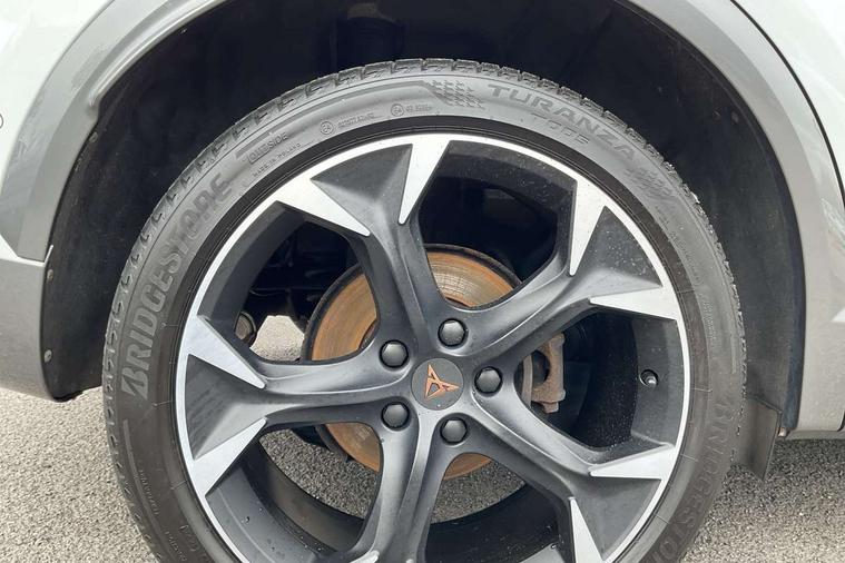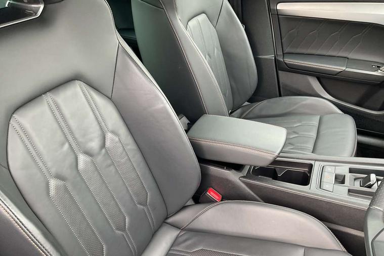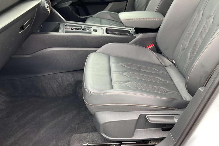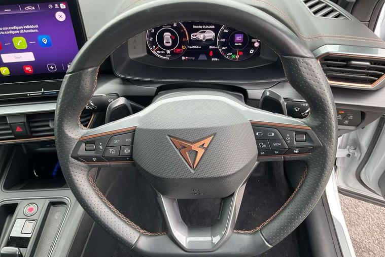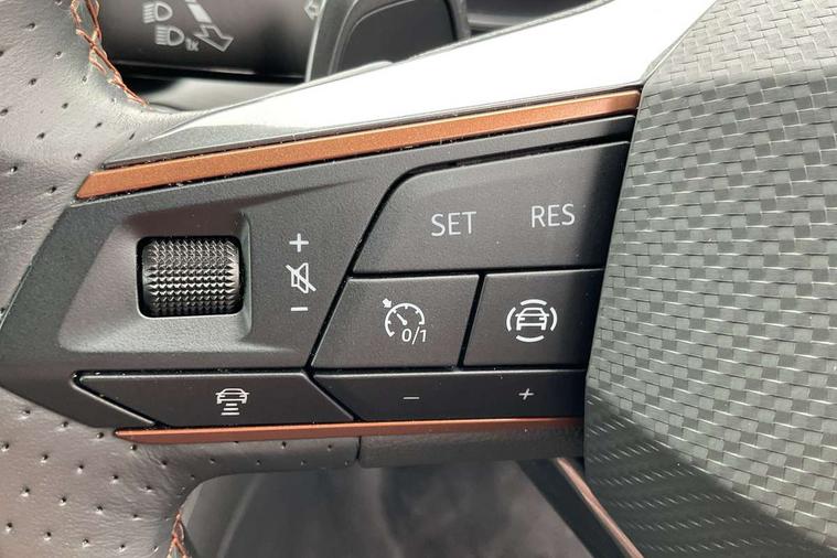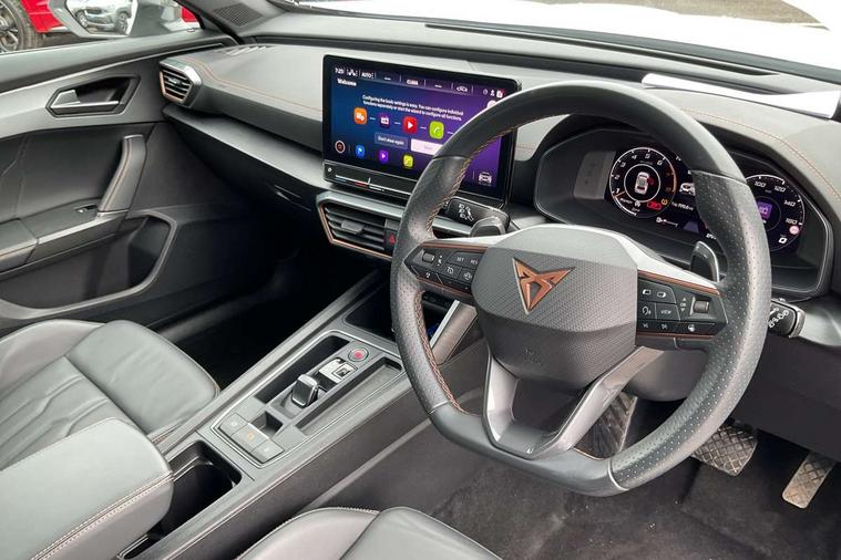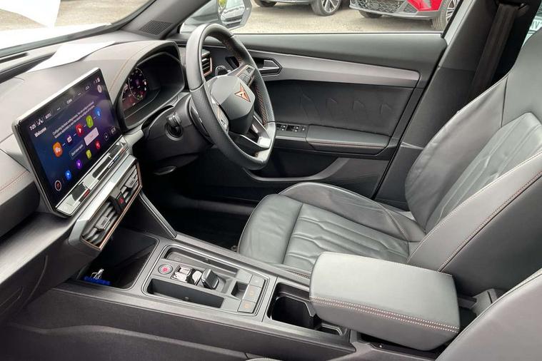 Digital cockpit and configurable dashboard, Driver alert system, Driving profile selection, Forward collision warning with automatic braking, Lane assist, Navigation system with 12'' Touchscreen Display, Park assist (inc front/rear parking sensors), PAS, Predictive adaptive cruise control with speed limiter, Rear view camera, RPM, trip computer, outside temp gauge, instrument light brightness, low fuel warning light, lights on reminder, gearshift indicator, Service interval indicator, Start/stop system with regenerative braking, Voice control system, Wireless apple carplay, Wireless phone charger, Electronic locking differential and dynamic traction support, Standard suspension, 2 front and 2 rear USB type C sockets, Auxiliary input socket, DAB radio, Auto dimming rear view mirror, Body colour door handles, Body coloured bumpers, Dark grey wing mirror, Daytime running light with automatic headlight control and coming home feature, Dynamic headlight range control, Electric front/rear windows, Electrically adjustable heated and folding door mirrors with memory function, Front fog lamps with cornering function, Gloss black roof rails and window surrounds, LED Headlights, LED Taillights with dynamic indicator, Rain sensing wipers, Rear diffuser with black simulated exhaust pipes, Rear side wing doors, Rear wash/wipe, Third brake light, Tinted rear windows, Welcome lights, 12v power supply in centre console, 12V socket, 12v socket in loadspace, 2 front and 2 rear reading lights, 230V socket, 3 seat bench in 2nd row, 60/40 split rear bench seat with armrest and mechanical seat release, Black headlining, Dust/pollen filter, Front and rear head restraints, Front centre armrest, Height/reach adjust steering wheel, Illuminated interior front door sills, Illuminated sunvisor with mirror, Isofix, Leather multi function heated steering wheel with gear shift paddles, Luggage tie-down hooks, Single front passenger seat, Three zone climate control with control panel in rear, Variable luggage/load compartment floor, Wraparound lighting, Genuine Nappa leather Pack - Cupra, 3 point seatbelts on all rear seats, ABS, Brake control system - ESC and brake booster, Child proof door locks, Driver and front passenger airbags with front passenger airbag de-activation, Electronic parking brake, Front and rear disc brakes, Front side curtain airbags, Hill hold control, Public e-call, Seat belt reminder for front and rear seats, Tyre pressure monitoring system, Anti theft alarm system, Keyless entry and start system (KESSY), Locking wheel bolts, Copper and aluminium interior detailing, 19" 'Exclusive' machined sport matte black and silver alloy wheels,