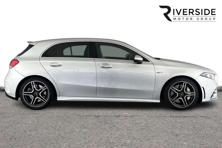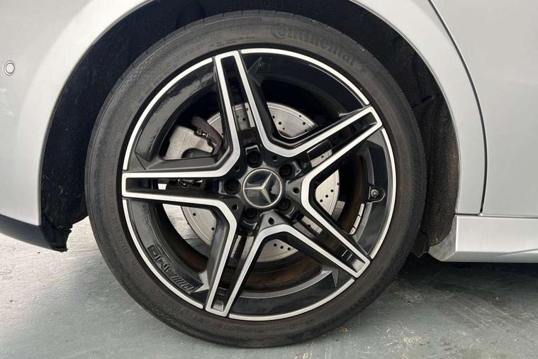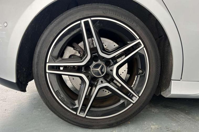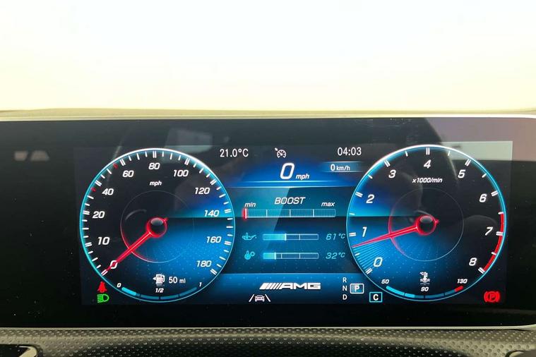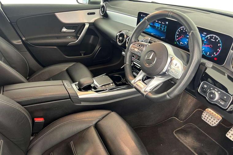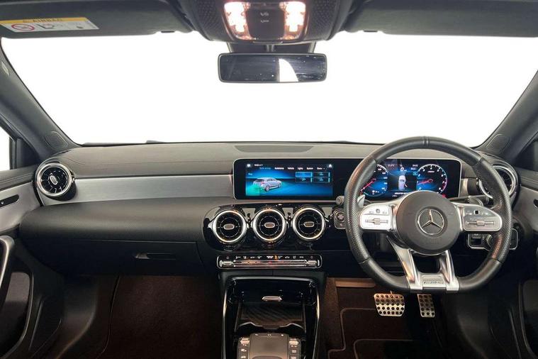 10.25" media display, 180 degree rear view camera with parking guidelines, 7" colour screen in instrument panel, Active lane keep assist, Active park assist with parktronic system including front and rear parking sensors, Attention assist, Brake pad wear indicator warning light, Car wash mode, Cruise control + speed limiter, Direct steering, Dual bluetooth interfaces, DYNAMIC SELECT with driving programs (Slippery, Comfort, Sport, Sport+ and Individual), ECO start/stop function, Fluid level warning indicator for fuel, oil, coolant and washer fluid, Hard-disk navigation, Hey Mercedes Voice activation, Lamp failure indicator, Mercedes me connect including emergency call system, accident recovery, breakdown and maintenance management, Outside temperature gauge, Owners manual in English, Pre-installation for private car sharing, Pre-installation for Vehicle Monitoring, Pre-installation for Vehicle Setup, Preinstallation for Mercedes Benz link, Service indicator (ASSYST), Smartphone integration with Apple CarPlay and Android auto, Speed sensitive power steering, Trip computer, Wireless charging, AMG performance suspension, Rear axle multi-link, 2 USB ports (type C) in rear stowage compartment and one in front of center console, 6 speakers, DAB Digital radio, MBUX multimedia system with DAB digital radio and touchpad including satellite navigation, Mercedes-Benz sound system - 100W, 4 Electric Front and Rear windows, Adaptive brake lights, AMG bodystyling - Front apron with splitter in chrome, rear apron with chrome trim and chrome visible trim elements in tailpipe, AMG Front apron with flics as air deflector elements on the outer air intakes, AMG radiator grille with twin blade lamella and AMG Lettering, AMG Rear apron with specific diffuser look with four vertical fins and two round chrome plated tailpipe trim elements with a diameter of 90 mm, AMG spoiler lip on roof, AMG Sports exhaust system with two round tailpipes measuring 90 mm in diameter attached in rear apron, AMG lettering plus ribbing on the inside of the, Black weather strip, Body colour bumpers, Body colour door handles, Body colour side skirt, Body coloured door mirrors, Chrome beltline trim, Electric adjustable and heated door mirrors with integrated LED side indicators, Front wings wheel arches with TURBO 4MATIC lettering, Headlamp assist automatic headlamp activation, Heated glass rear windscreen + timer control, LED high performance headlamps with integrated LED daytime running lights, LED tail lamp, LED third brake light, Privacy glass, Radio aerial, Rain sensing windscreen wipers with two sensitivity settings, Rear fog lights, Rear wiper, Trim elements on louvres in outer air inlets in silver chrome, Wider wheel arches for AMG wheels, Window line trim strip in chrome, 40:20:40 split folding rear seats, AMG Performance steering wheel in nappa leather, Auto Mercedes-Benz child seat recognition sensor, Black air vents with surround in silver chrome, Black roof lining, Brushed stainless steel sports pedals with rubber studs, Controller on centre console with chrome surround, Floor mats with stitched edging and AMG lettering, Front centre armrest with storage compartment, Front door sills with Mercedes Benz lettering, Front seat backs luggage nets, Front seat cushion length adjustment, Heated front seats, Height/reach adjustable steering column, Interior mirror with reading lamps in black and frameless, Manual height adjustable front seats, Rear head restraints, Seat occupancy sensor for front passenger seat, Silver coloured aluminium gear shift paddles on steering wheel, Sports seats with integrated headrests, Stowage compartment in centre console with retractable cover, Sunvisors with illuminated vanity mirrors, Touchpad on center console, Twin front cupholders, Two zone thermotronic luxury automatic climate control, Light and sight pack - A Class, Mirror package - A Class, Seat comfort pack - A Class, 3 rear 3 point seatbelts, ABS with Brake Assist, Active bonnet, Active brake assist includes forward collision warning system with autonomous braking, Adaptive brake assist with hold function and hill start assist, Childproof locks manually operated for rear doors and electrically operated for rear power windows, Crash responsive emergency lighting, Driver and passenger head and side airbags, Drivers knee airbag, Dual stage driver/passenger airbags, Electronic parking brake, ESP curve dynamic assist, ESP with ASR, Front and rear seatbelt reminder, Front brake calipers with AMG lettering, ISOFIX and top tether child seat fixing points in two outer rear seats, Perforated front brake discs, Tyre pressure monitoring system, Warning triangle and first aid kit, Window airbags, Alarm system/interior protection/immobiliser, Keyless Go, Remote central locking and crash sensor with emergency opening function, Urban guard vehicle protection system with immobiliser and interior protection, Black seatbelts, Light aluminium with longitudinal grain interior trim, 18" AMG 5 twin spoke design bicolour alloy wheels, Summer tyres, Tirefit sealant kit,