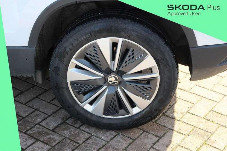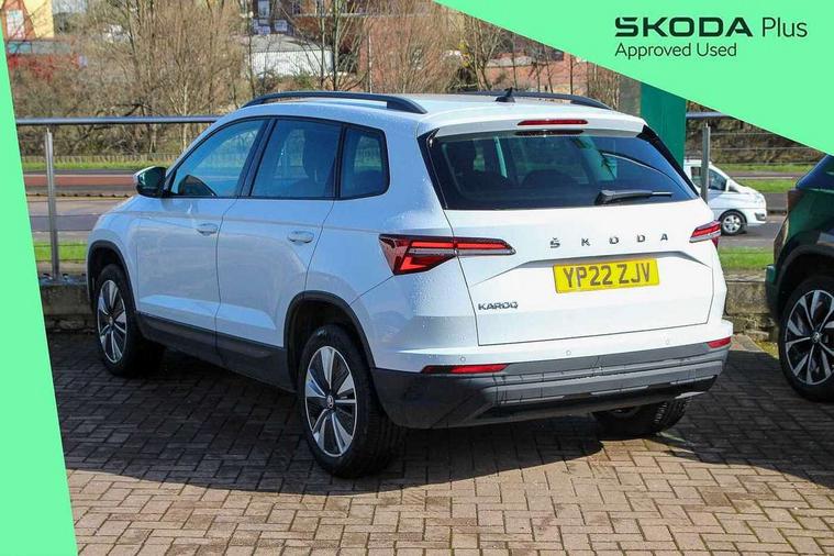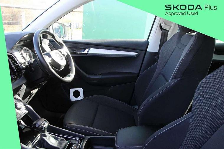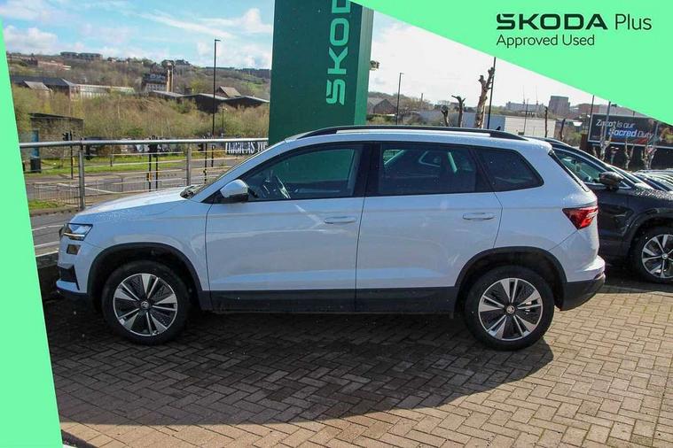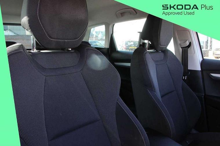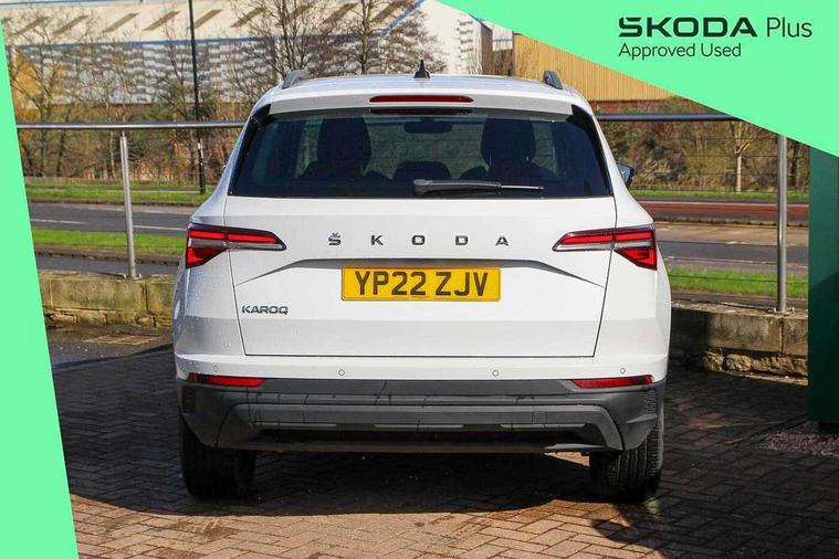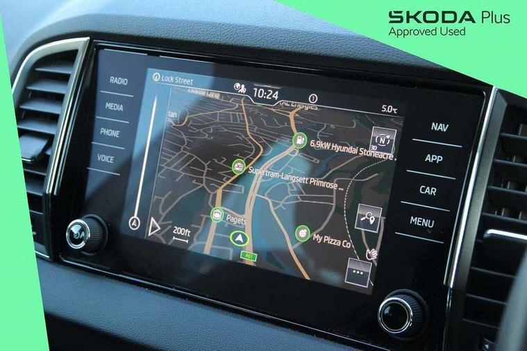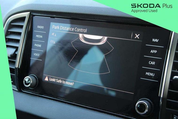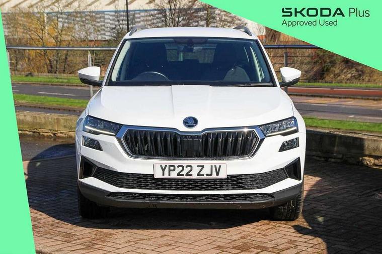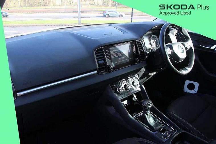 Amundsen satellite navigation with 8" touchscreen display with maps Europe, WLAN and web radio, Care connect, Driver fatigue sensor, Emergency services call system, Multifunction colour trip computer, Outside temperature gauge, Service interval indicator, SmartLink wireless for Apple and wired for Android, Start/stop system with regenerative braking, USB C Port x 2 in front centre console, 8 Speakers, DAB radio with Bluetooth, USB connection, Acoustic glass, Aero front windscreen wipers with intermittent function, Auto dimming rear view mirror with light and rain sensors, Automatic headlight control system, Black electric window control buttons, Body colour door mirrors and handles, Body coloured bumpers, Doors steps in front with Karoq badging, Electric front and rear windows with child proof lock, Electrically adjustable heated folding and auto dimming door mirrors, Front fog lights, Heated rear windscreen, LED daytime running lights, LED Headlights, LED rear lights with high functionality welcome effect and dynamic indicators, Light assistant (coming/leaving home/tunnel light), Privacy glass, Rear side wing doors, Rear wiper, Safety reflectors on front doors, 1.5 litre bottle holders in driver and front passenger door panels, 12V socket in boot, 12v socket in front centre armrest with storage compartment and rear air vents, 2 Folding hooks and nets in boot, 2 Front readings lights for driver and passenger, 2 x Tablet holder, 3 rear height adjustable headrests, 3 seat bench in 2nd row, 4 foldable roof handles with rear coat hooks, Black floor carpet, Chrome inner door handles, Double sided boot floor, Foldable hooks in the boot, Folding tables on the front seat backrests, Front head restraints, Height adjustable driver and passenger seat, Height adjustable front three point seats belts with tensioners, Height/reach adjust steering wheel, Ice scraper, Illuminated and cooled glovebox, Illuminated luggage compartment, Isofix child seat preparation for front passenger seat, Isofix child seat preparation outer rear, Manual lumbar support for front seats, Pearl grey interior ceiling, Pen holder, Pollen filter, Rear boot cover, Rear reading lights, Rubbish bin door, Safety vest holder, Single front passenger seat, Storage box in upper central dashboard closed, Sunvisors with illuminated vanity mirrors, Textile floor mats, Umbrella under passenger seat, Airbags - Front side, head, knee and curtain, Automatic door unlocking in case of crash, Automatic fuel cut off in case of crash, Child locks on rear doors, Driver airbag, Electronic parking brake with auto hold function, Emergency rear braking signal, ESC including ABS, MSR, ASR, EDS, HBA, DSR, RBS, MKB and traction control, Front assist radar scanning of the space in front of the car with automatic braking, Hill hold control, Passenger airbag with switch-off function, Pedestrian monitor, Seatbelt reminder signalisation and pretensioner for all seats, Three point seatbelts rear, Two tone horn, Tyre pressure display, Tyre pressure monitor, Alarm with interior monitoring, back up horn and tilt sensor with safe function, Electronic engine immobiliser, Remote central locking with 2 remote folding keys, Black centre console, Chrome framed air vents, Satin black dashboard, Satin black door trim, Anti-theft wheel bolts protection, Storage on wheel cover,