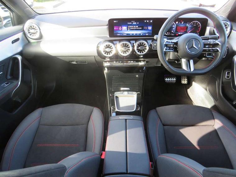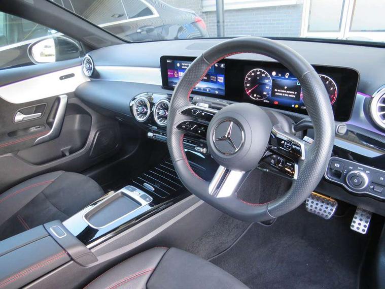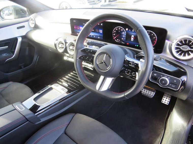 10.25 inch touchscreen central media display, 10.25" Digital instrument cluster display screen, Attention assist, Blind spot assist, Brake pad wear indicator warning light, Car wash mode, Cruise control + speed limiter, Direct steering, Direction indicators with lane change function, Dual bluetooth interfaces, DYNAMIC SELECT with a choice of driving modes (ECO, Comfort, Sport and Individual), ECO start/stop function, Engine start/stop button, Fingerprint scanner, Fluid level warning indicator for fuel, oil, coolant and washer fluid, Fluorescent jacket for driver, Hard-disk navigation, Hey Mercedes Voice activation, Lamp failure indicator, Lane keeping system, Mercedes me connect including emergency call system, accident recovery, breakdown and maintenance management, Mercedes me remote services, Outside temperature gauge, Owners manual in English, Pre-installation of private car share, Remote boot closing, Service indicator (ASSYST), Smartphone integration with Apple CarPlay and Android auto, Speed limit assist, Speed sensitive power steering, Trip computer in multifunction display with current consumption indicator, Wireless charging, Lowered comfort suspension, DAB Digital radio, MBUX multimedia system, Mercedes Benz sound system (100 W) with 6 speakers, 4 Electric Front and Rear windows, Adaptive brake lights, AMG body styling - AMG front apron with front splitter and AMG rear apron and visible exhaust tailpipe trim elements, Body colour bumpers, Body colour door handles with chrome inserts, Body colour side skirt, Chrome beltline strips, Diamond radiator grille with pins in fine star pattern, Electric adjustable and heated door mirrors with integrated LED side indicators, Exhaust system with 2 visible tailpipe trim elements and rear apron, Headlamp assist automatic headlamp activation, Heated glass rear windscreen + timer control, LED High Performance headlamps including integral LED daytime running lamps and adaptive highbeam assist, LED tail lamp, Privacy glass, Radio aerial, Rain sensing windscreen wipers with two sensitivity settings, Rear boot, Rear fog lights, Rear side wing doors, Third brake light featuring LED technology, Window line trim strip in chrome, 3 seat bench in 2nd row, 3 Spoke flat bottom leather multi function steering wheel with perforated leather in grip area, 4 way lumbar support, 40:20:40 split folding rear seats, Air conditioning - One zone THERMATIC automatic climate control with automatically controlled air distribution, AMG floor mats, Artico man-made leather/Microcut microfibre upholstery, Automatic child seat recognition sensor, Black air vents with surround in silver chrome, Black roof lining, Brushed stainless steel sports pedals with rubber studs, Front centre armrest with stowage, Front door sills with Mercedes Benz lettering, Front seat backs luggage nets, Front sports seats with adjustable head restraints, Galvanished gear shift paddles on steering wheel, Heated front seats, Height/reach adjustable steering column, Interior lighting - 64 colour Ambient lighting, Interior mirror with reading lamps in black and frameless, Rear armrest with 2 cupholders, Rear head restraints, Seat occupancy sensor for front passenger seat, Single front passenger seat, Stowage compartment in centre console with retractable cover, Sunvisors with illuminated vanity mirrors, Twin front cupholders, Keyless go comfort pack - A Class, Light and sight package - A Class, Mirror package - A Class, Parking pack with 180 degree view - A Class, Seat comfort pack - A Class, USB pack plus - A Class, 3 rear 3 point seatbelts, ABS with Brake Assist, Active bonnet, Active brake assist includes forward collision warning system with autonomous braking, Adaptive brake assist with hold function and hill start assist, Bonnet with power domes, Childproof locks manually operated for rear doors and electrically operated for rear power windows, Crash responsive emergency lighting, Driver and passenger head and side airbags, Drivers knee airbag, Dual stage driver/passenger airbags, Electronic parking brake, ESP curve dynamic assist, ESP with ASR, Front and rear seatbelt reminder, ISOFIX and top tether child seat fixing points in two outer rear seats, Tyre pressure monitoring system, Warning triangle and first aid kit, Window airbags, Alarm system/interior protection/immobiliser, Guard 360 degree vehicle protection, Remote central locking and crash sensor with emergency opening function, Black seatbelts, Light longitudinal grain aluminium trim, 18" AMG 5 twin spoke light alloy wheels, aerodynamically optimised, painted in black with high sheen finish, Summer tyres, Tirefit sealant kit,