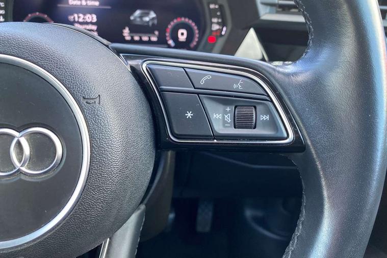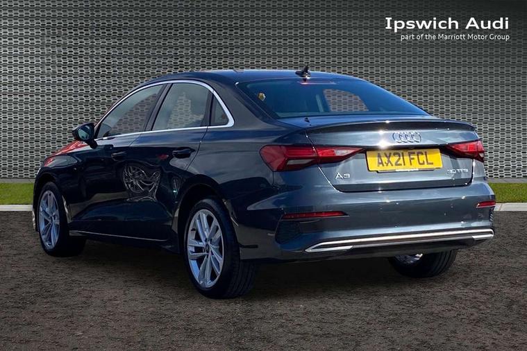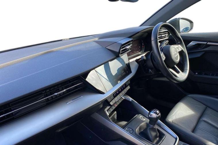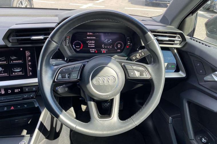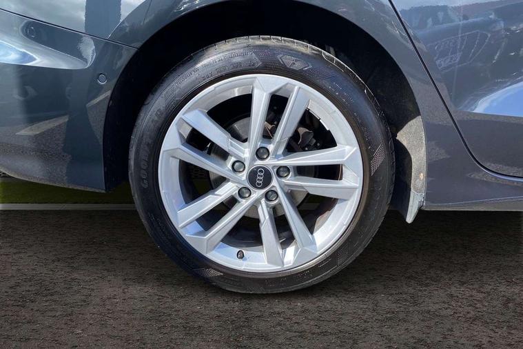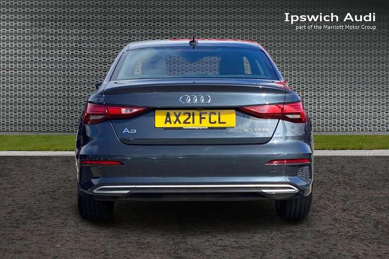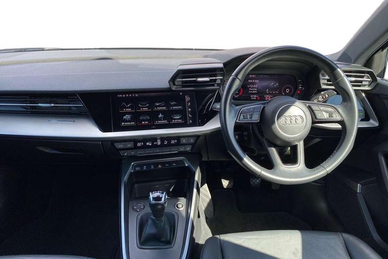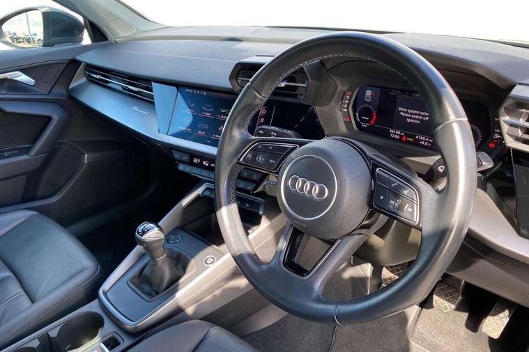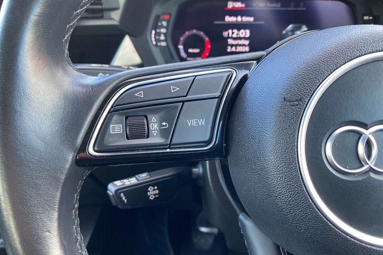 Audi connect emergency call and service, Audi drive select (Auto, Comfort, Dynamic and Individual), Audi smartphone interface, Audi Virtual Cockpit - 10.25" digital and colour instrument cluster, Automatic start/stop system with recuperation, Bluetooth interface, Collision avoidance assistant, Cruise control + speed limiter, Electromechanical power speed sensitive steering, Lane departure warning system, MMI Navigation Plus with high resolution 10.1" colour touch screen display, Rear parking sensors, Service indicator, Voice control system with natural language interaction, Standard suspension, 2x USB Type C ports (for charging and data transfer), 6 passive loudspeakers, CD player, DAB Digital radio, Acoustic glass windscreen, Aluminium window trim, Auto dimming frameless rear view mirror, Body colour exterior mirrors, Body colour roof spoiler, Electrically adjustable/heated/folding/auto dimming door mirrors with integrated LED indications + kerb view function for passenger side, Front electric windows, LED daytime running lights, LED headlights and halogen rear lights, Light and rain sensors, Model and engine designation badges at rear, Rear electric windows, Rear window, rear door windows and rear side windows in clear glass, 12V socket and storage compartment in front centre console, 40/20/40 split folding rear seat bench with cupholder, Dual zone electronic climate control, Front and rear headrests, Front centre armrest, Front door sill trims with aluminium inlay, Front/rear floor mats, Height and reach adjustable steering wheel, Interior lighting - Front and rear roof module including reading lights, glove compartment light and right hand side, Luggage compartment floor covering, Manual boot compartment lid, Manually adjustable front seats, Seat side bolsters, Steel grey cloth headlining, Twin leather upholstery, Aluminium interior elements pack - A3, Sport styling pack - A3 Saloon, 3x3 point rear seat belts, Driver and front passenger airbag with passenger airbag deactivation, Electronic Stabilisation Control (ESC) including ABS, ASR and EDL, First aid kit with warning triangle and 2 safety vests, Front side airbags with head airbags and interaction airbag, Hill hold assist, Pre-sense front with pedestrian and cyclist detection, Seatbelt monitoring, Tyre pressure loss indicator, Anti theft alarm, Anti-theft wheel bolts, Electronically operated child lock, Immobiliser, Remote control central locking, Aluminium air vent surrounds, Aluminium trim elements, Inlays with silk effect paint in platinum grey,