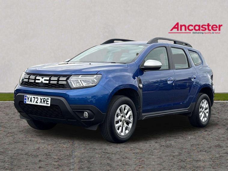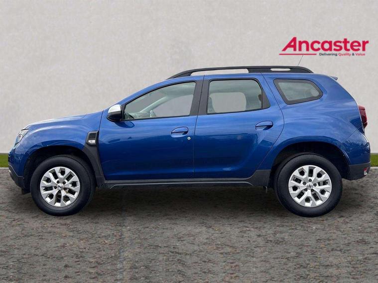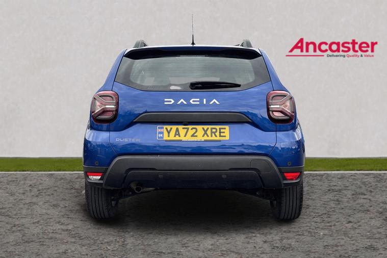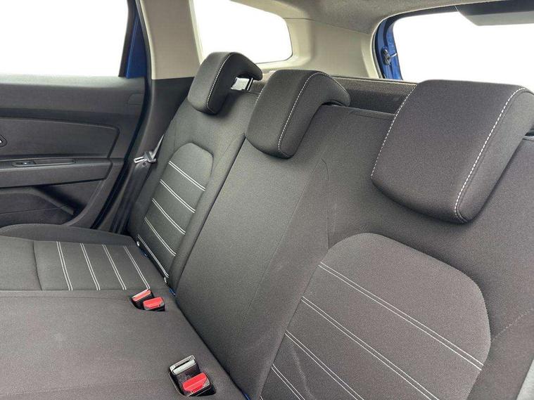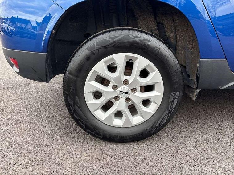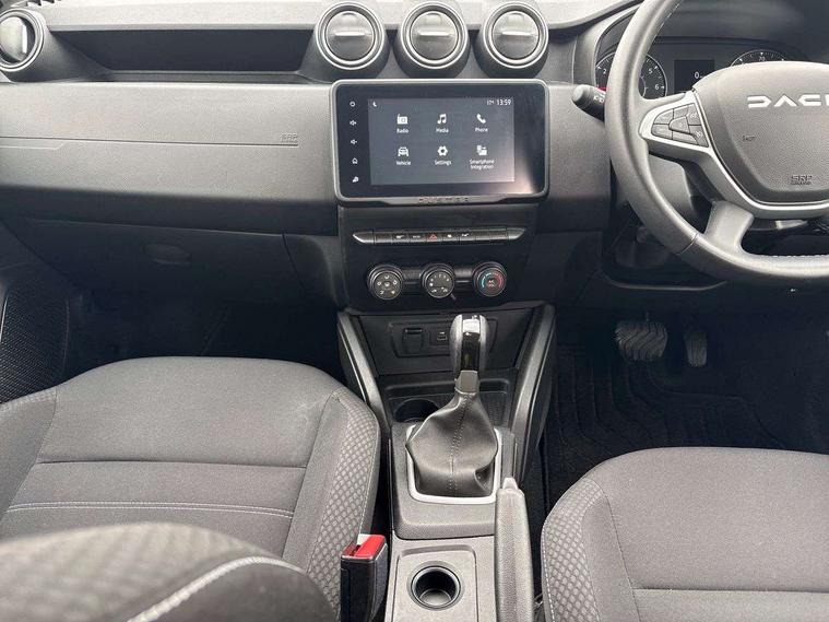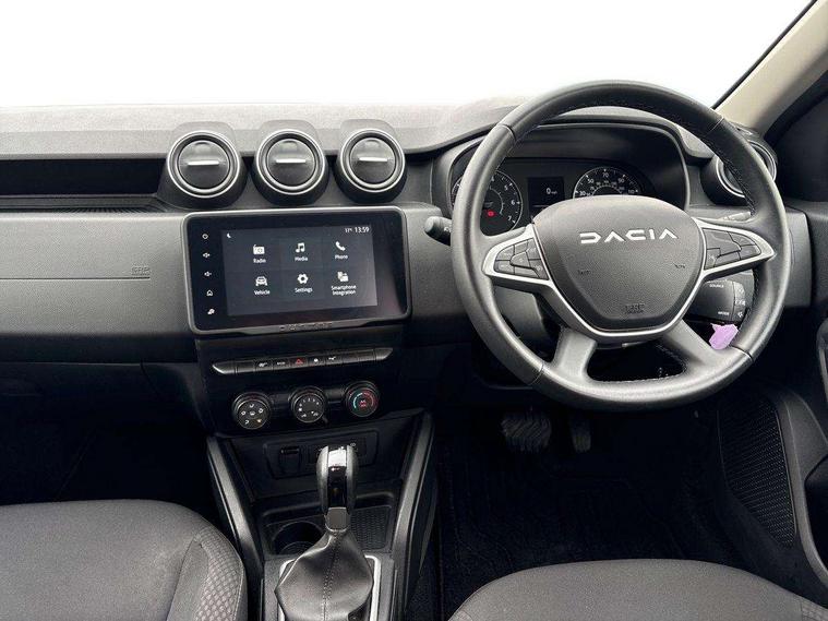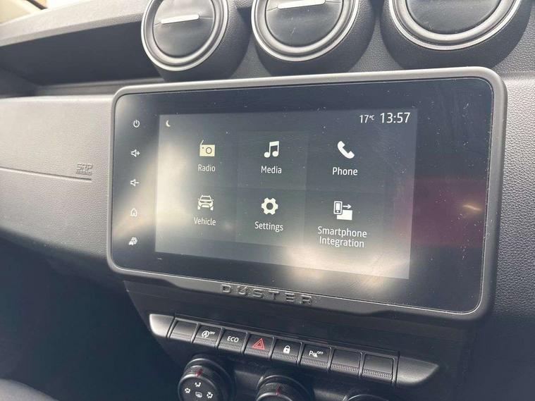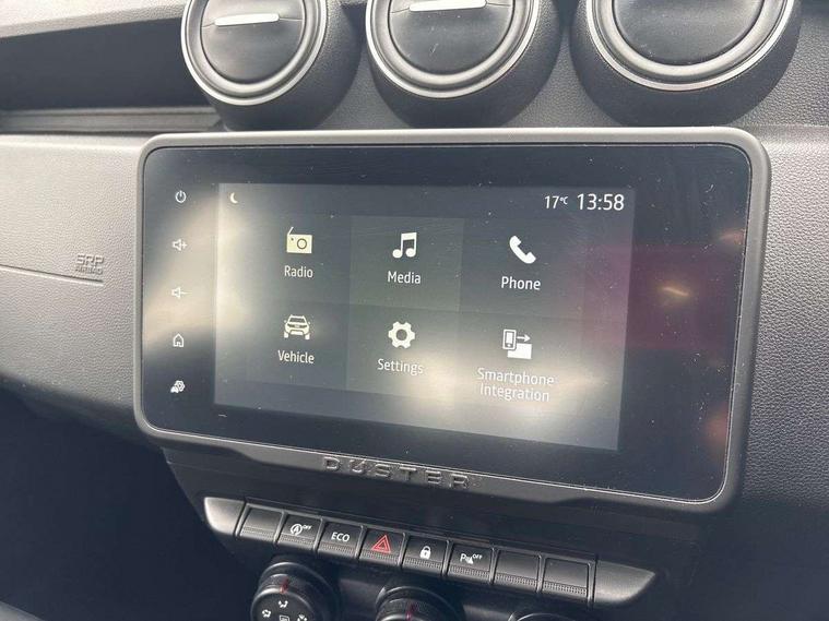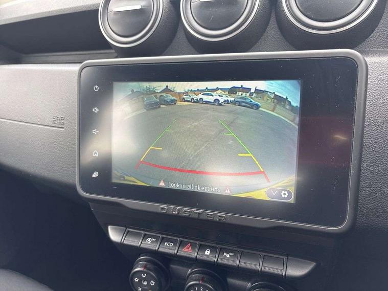 Cruise control and speed limiter, eCall emergency system, Eco mode, Electric power assisted steering, On board computer, odometer, trip computer, average fuel consumption, average speed, service indicator, outside temperature gauge, Rear parking sensors and reverse camera, Rev counter, Stop/start system, 8" Media display with smartphone replication, 2 usb sockets and 6 speakers, Dacia plug and radio/MP3/USB/bluetooth/DAB/steering wheel control, 3 speed windscreen wipers, Black longitudinal roof bars with Duster inscription, Black side sills, Black/satin chrome tailgate trim with Duster inscription in black background and lettering, Body coloured door handles, Chrome front grille with hot stamping, Chrome logo surround on steering wheel, Daytime running lights, Drivers window one touch up/down, Dusk sensor, Electric adjustable/heated door mirrors, Electric front windows, Electric rear windows, Front and rear body coloured bumpers, Front door sill protection strip, Front fog lights, Heated rear window, High level third rear brake light, Rain sensor, Rear side wing doors, Rear spoiler, Rear wash/wipe, Satin chrome door mirrors, Tinted windows, Underbody protection skid plates, Y shaped LED headlights with rear LED lights, 3 rear height adjustable headrests, 3 seat bench in 2nd row, 60/40 split folding rear seat, Backlighted steering wheel buttons, Boot light, Driver seat lumbar adjustment, Fabric decorative insert on door panels, Fabric upholstery, Front head restraints, Front passenger reading light, Gear shift indicator, Height adjustable driver seat, Height adjustable front and rear headrests, Height and depth adjustable steering wheel, High centre console with driver armrest, Isofix points for child seats in both outer rear seats, Manual air conditioning, Map pocket on front seat backs, Passenger sunvisor with vanity mirror, Rear passenger reading light, Satin chrome interior door handles, Satin chrome lower steering wheel insert, Single front passenger seat, Soft feel leather steering wheel, 3x3 point rear seatbelts, ABS and Emergency brake assist, ASR traction control with Electronic stability control, Child locks on rear doors, Door open visual and audible warning, Driver airbag, Driver and passenger seatbelt not fastened - visual and audible warning, EBD - Electronic brakeforce distribution, Front passenger airbag, Front passenger airbag deactivation, Front seatbelt pretensioners, Front side airbags, Height adjustable front seatbelts, Hill start assist, Tyre pressure monitor, Remote central locking, Thatcham approved engine immobiliser, Charcoal grey central console surround, Matt black central console fascia, Piano black decorative insert on front door panels, Satin chrome air vent surround, 16" alloy wheels,