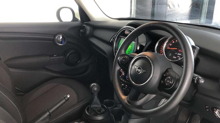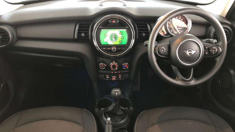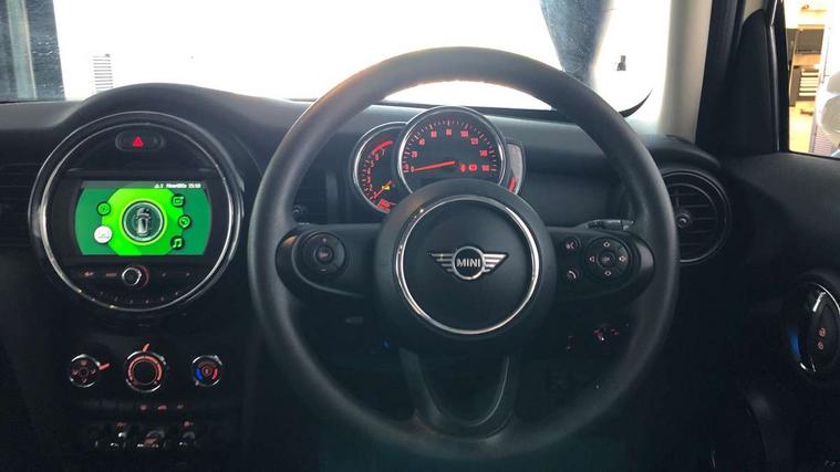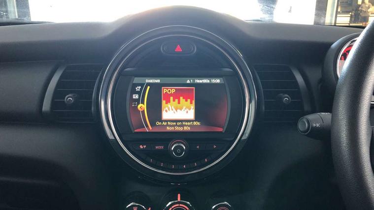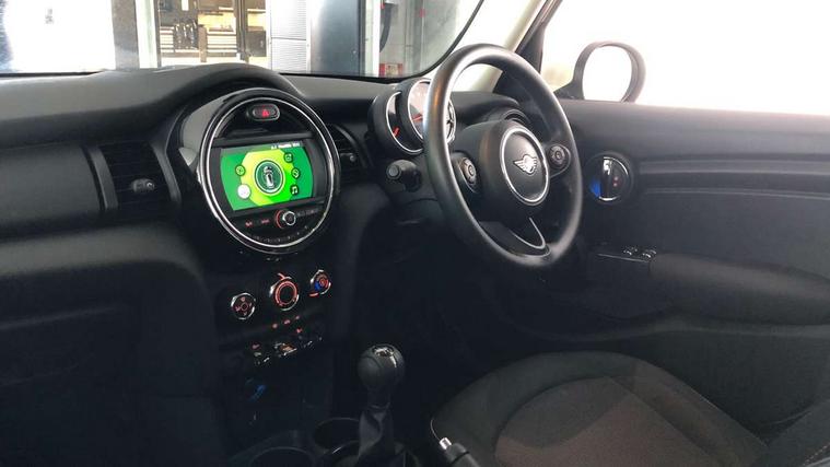 Automatic start/stop function with brake energy recuperation, Compatible mobile phone bluetooth with audio streaming, Electro-mechanical speed dependant steering assistance, Instrument cluster, Mini E-call, MINI TeleServices, On board computer, Service interval indicator, Double Vanos system, Fully variable valve control, Gear change indicator display, High precision injection, FM tuner and DAB digital radio, Automatic headlight activation switch, Body colour fuel filler cap, Body colour roof and mirror caps, Chrome border high gloss black slats radiator grille, Dynamic brake lights, Electric front+rear windows, Exhaust tailpipe, Heated rear window, Heated windscreen washer jets, Metal door sill strips with MINI imprint, Rain sensor window wipers, Rear fog lights, Rear LED lights with union jack design, Rear window wiper, Side scuttle panel with integrated indicator, Sun/heat protection glass, White indicator lenses, 12V Accessory socket in centre console, 4 lashing eyes in luggage compartment, 60/40 split folding rear seat, Carbon Black colour line, knee roll and door armrests, Chrome interior highlights, Colour line - Carbon black, Cupholders, Front and rear head restraints, Front and rear isofix with front passenger airbag deactivation, Glove compartment, Height and length steering column adjustment, Interior lighting with 12 basic colours selectable via toggle switch in roof, Leather gearshift lever and handbrake gaiters, LED reading lights, vanity mirror lights, front foot well light and spotlight on front seats, Mechanical seat adjustment, driver seat height adjust, forward/back and front seats backrest, Mini logo projection on floor from drivers exterior mirror, Multifunction steering wheel, Satellite grey headlining, Storage compartments in doors, Sunvisors with vanity mirrors, 3 point seatbelts on all five seats, 6 Airbags - front, side, head and seat belt tensioners, Anti-lock braking system (ABS), DSC - Dynamic Stability Control, Front and rear disc brakes, Hill start assist, Single tone fanfare horn, Tyre pressure monitoring system, Alarm system with tilt sensor, monitoring doors, bonnet interior and tailgate, Electronic vehicle immobiliser, Start/stop toggle with keyless go, Tool kit, Tyre repair kit,