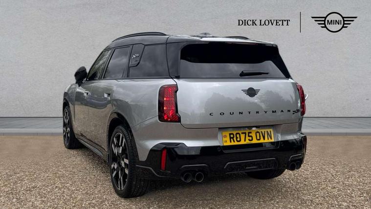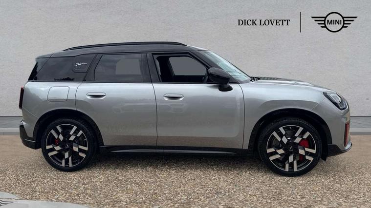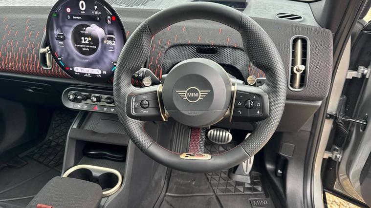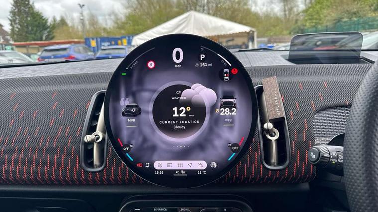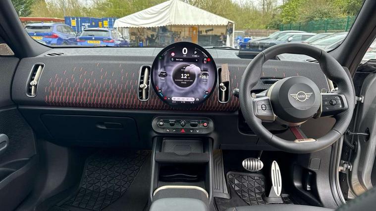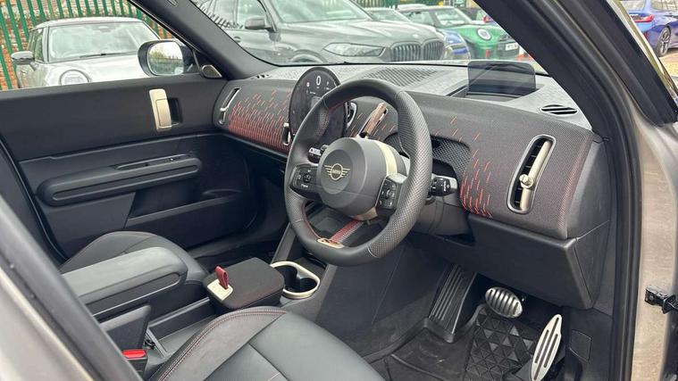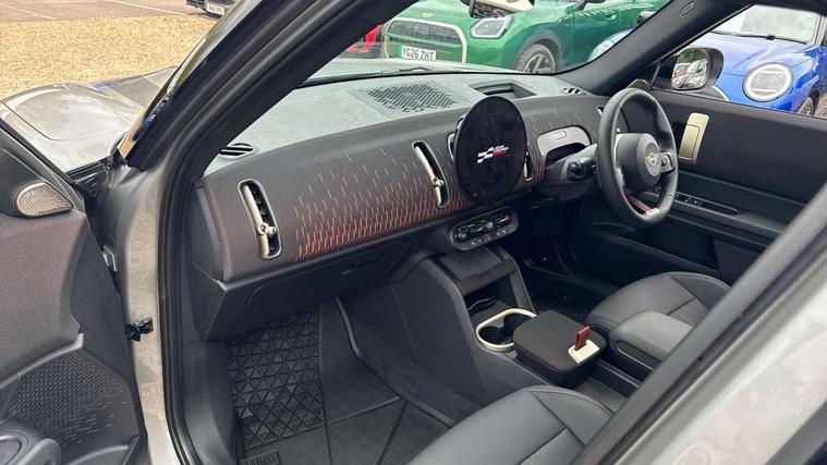 Bluetooth connection, Circular OLED Screen, Compatible mobile phone bluetooth with audio streaming, Cruise Control (DCC), Digital dashboard display, Driving assistant, Driving Assistant Plus Preparation, E-call, Electro-mechanical speed dependant steering assistance, MINI Experience Modes, MINI Head up display, Mini navigation system, MINI TeleServices, Parking assistant in camera and ultrasound based assistance system, rear view camera, parking aid and distance control, Adaptive suspension, Double clutch sports transmission, Larger capacity fuel tank, Quad exhaust system, DAB Digital radio, Harman Kardon surround sound system, Personal eSim, Auto tailgate, Electric adjustable heated door mirrors, Front and rear apron, Front and rear electric windows, Heated rear window, High beam assistant, High gloss hexagonal patterned grille surround, Interior rear-view mirror with automatic anti-dazzle function, LED daytime running lights, LED headlights with extended contents including Adaptable light signatures, LED rear lights, LED third brake light, Rain sensor with auto headlights, Rear roof spoiler with airblades, Rear side wing doors, Rear window wiper, Roof rails, 3 seat bench in 2nd row, 60/40 split rear bench seat, Anthracite headliner, Auto air conditioning, Driver and front passenger seat heating, Floor mats, Front armrest, Front headrests, Heated steering wheel, Height and length steering column adjustment, JCW Front sports seats, Lidded storage box in Black/Red knit, Luggage compartment separating net, Perforated Vescin steering wheel, Rear headrests, Seat adjustment for rear seats, Single front passenger seat, Sunvisors with vanity mirrors, Wireless charging tray, Interior and exterior mirror package - Mini Countryman, 3x3 point rear seat belts, 6 Airbags - front, side, head and seat belt tensioners, ABS, DSC - Dynamic Stability Control, Electronic handbrake, Electronic Stability Programme (ESP), Front ISOFIX (iSize), Hill descent control, Hill hold assist, Hill start assist, JCW logo in brake calipers, JCW Sport brakes with Chilli Red calipers, Manual rear child locks, Traction control, Tyre pressure monitoring system, Warning triangle, Alarm system with tilt sensor, monitoring doors, bonnet interior and tailgate, Auto drive away locking, Comfort access system, Deadlocking function, Electronic vehicle immobiliser, Locking wheel bolts, Remote control locking, Start/stop toggle with keyless go, 19" JCW Runway Spoke Black alloy wheels, Tyre repair kit plus,